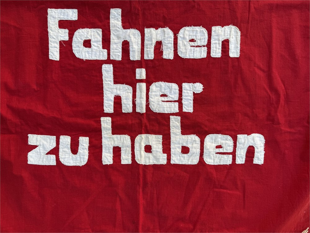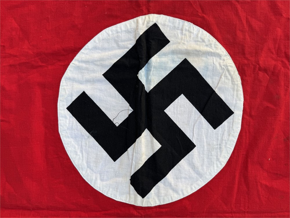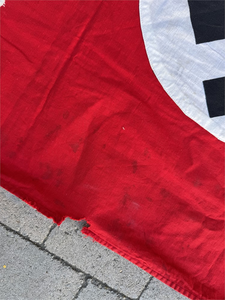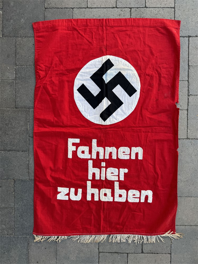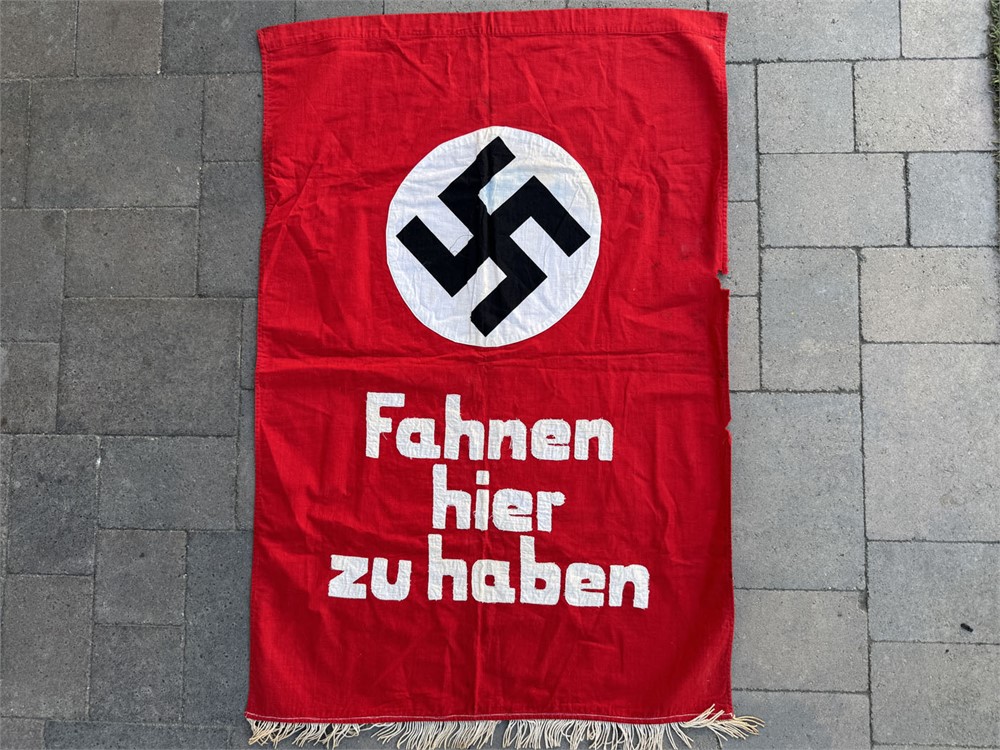 Swastika benner is about 3 X 5 feet in size. Separately sewn lettering below the swastika disc "Fahnen hier zu haben" ("Flags available here"). There is a small damaged area on one edge as can be seen in the photos. Otherwise the piece shows only normal age.