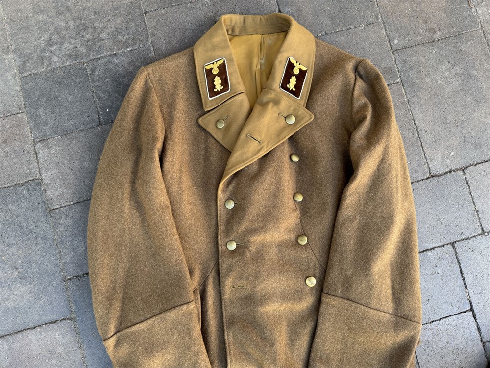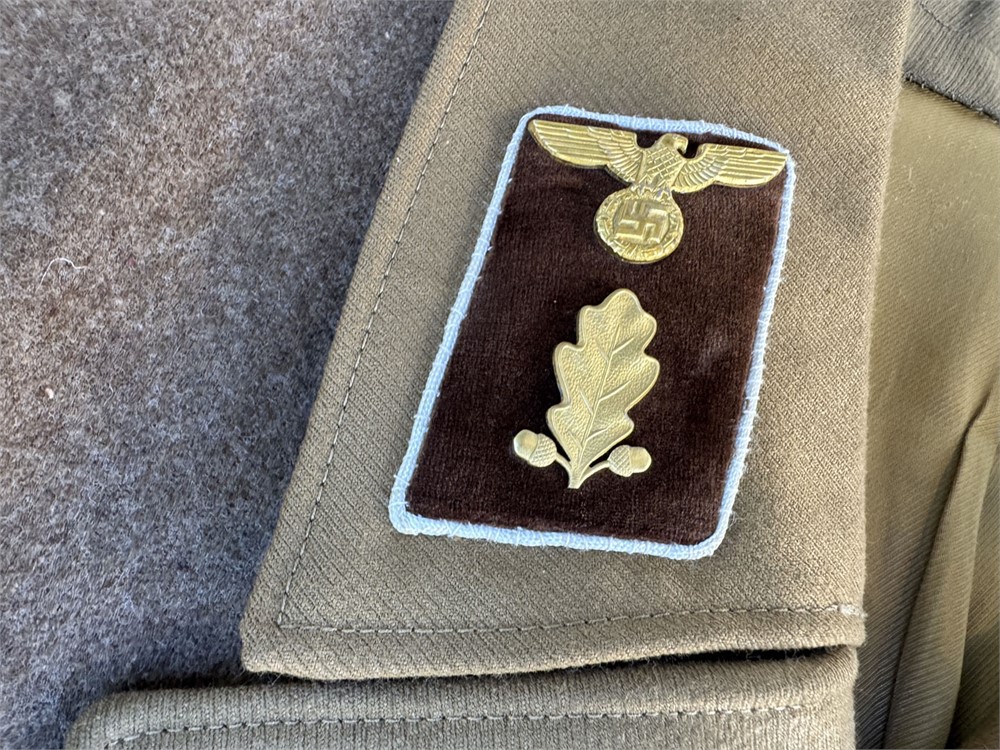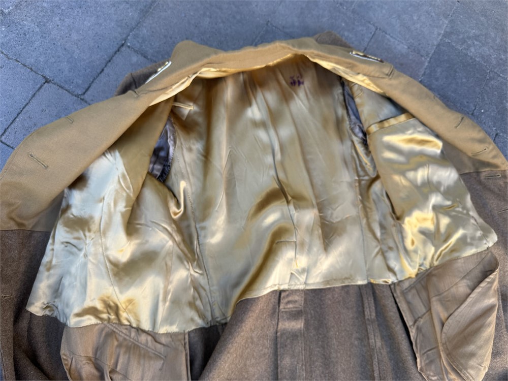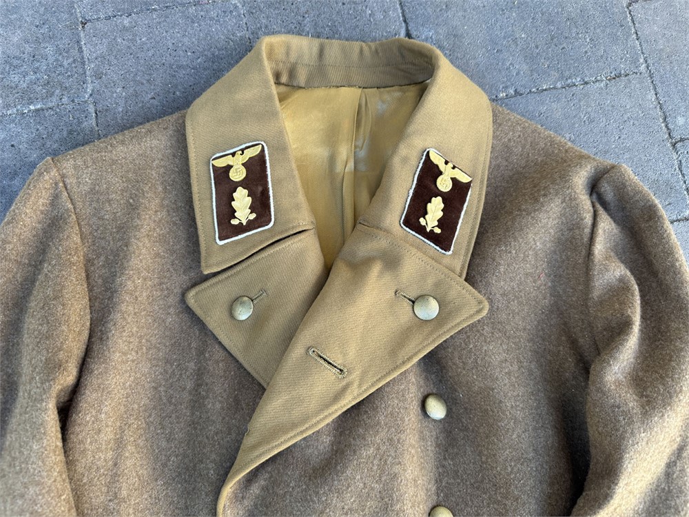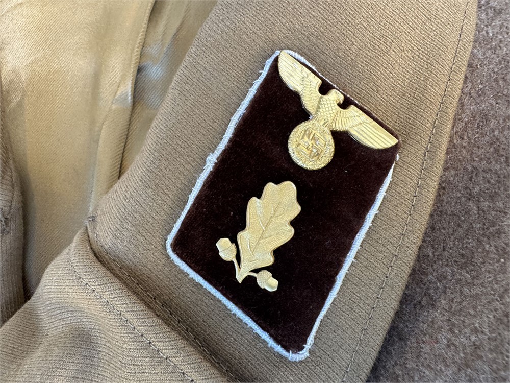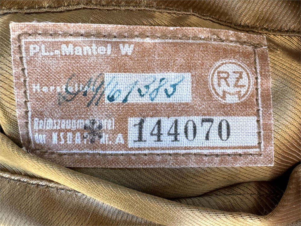 Brown wool overcoat with correct light brown/tan tricot collar and lapels appears possibly unissued. Gold PL eagle and swastika buttons.  Collar tabs are Kreis level with white piping, however the left side tab is a reproduction (or at least has a reproduction eagle installed). There is no armband included. RZM label for "PL-Mantel W" (Political Leader Overcoat-Wool) is sewn into inside pocket. Overall the coat itself is in very fine condition and deserves to be restored.