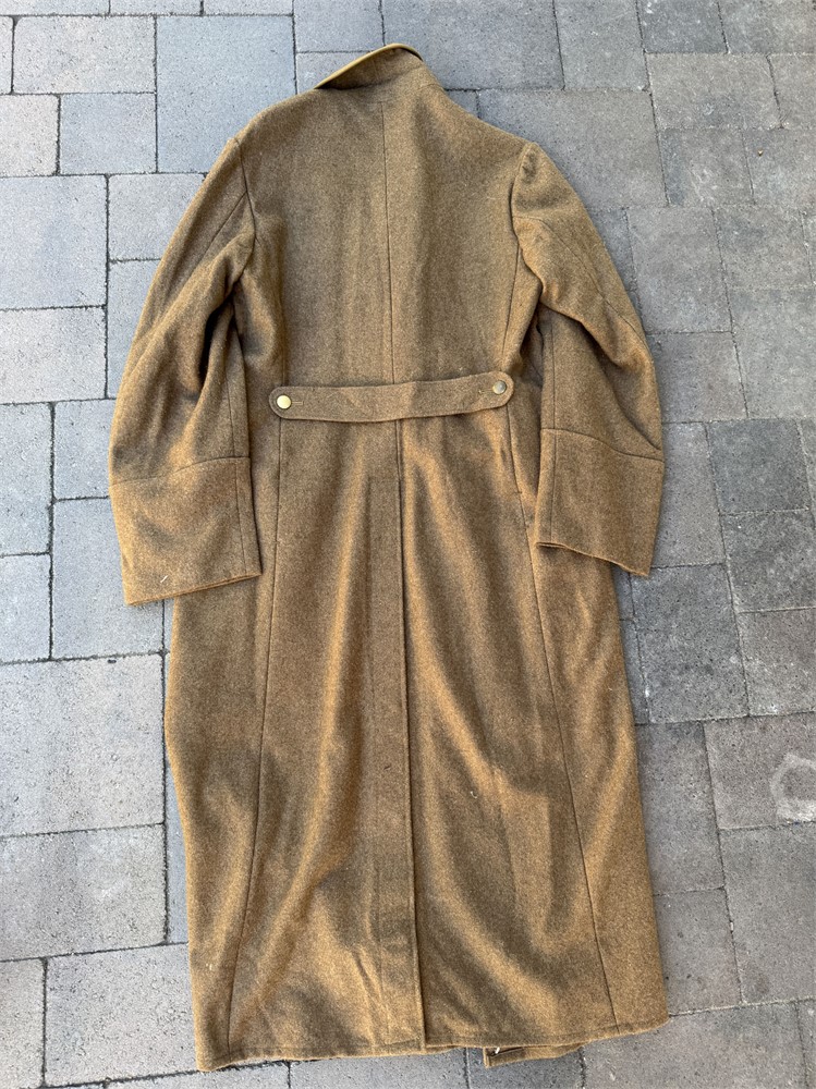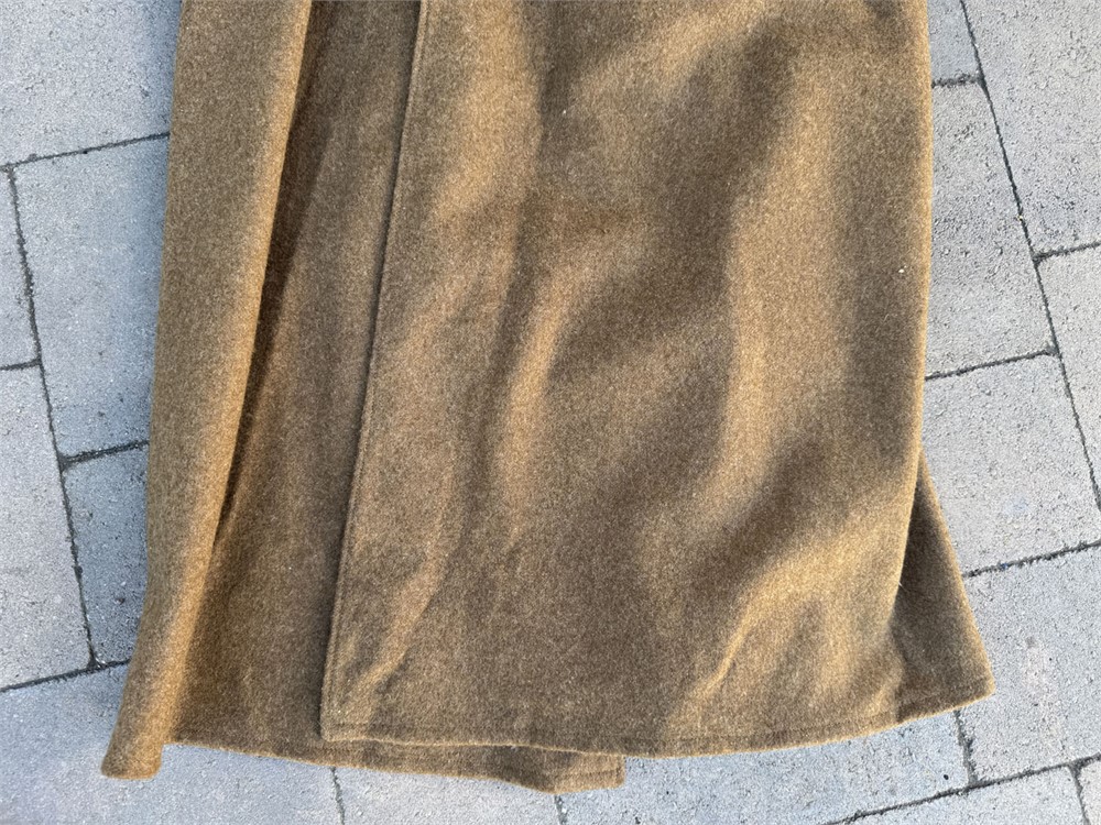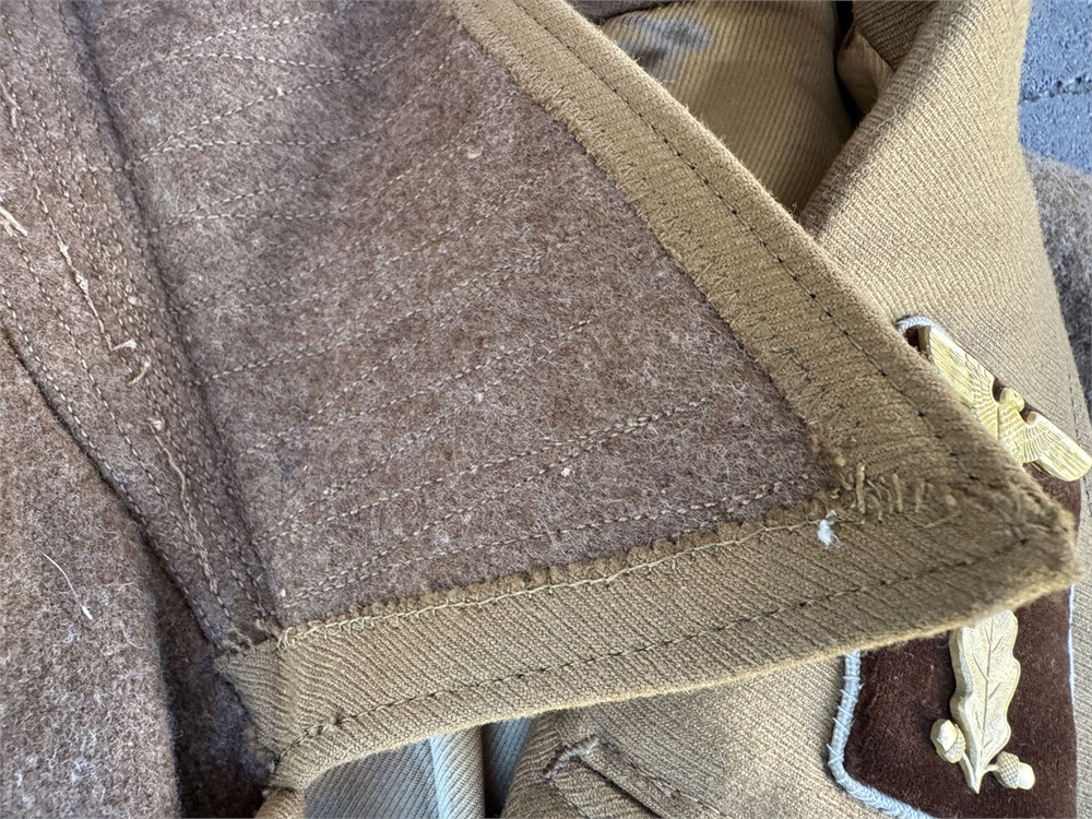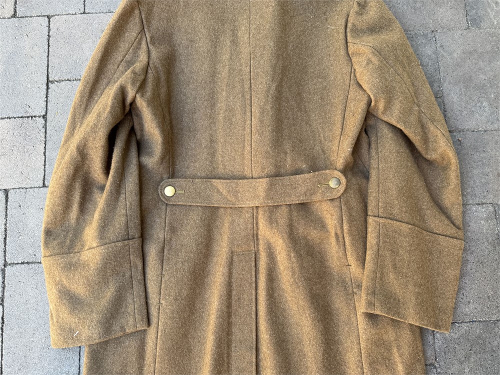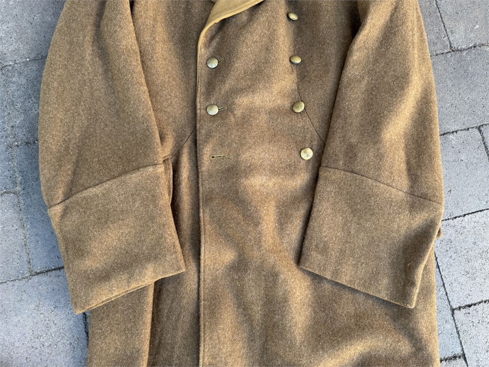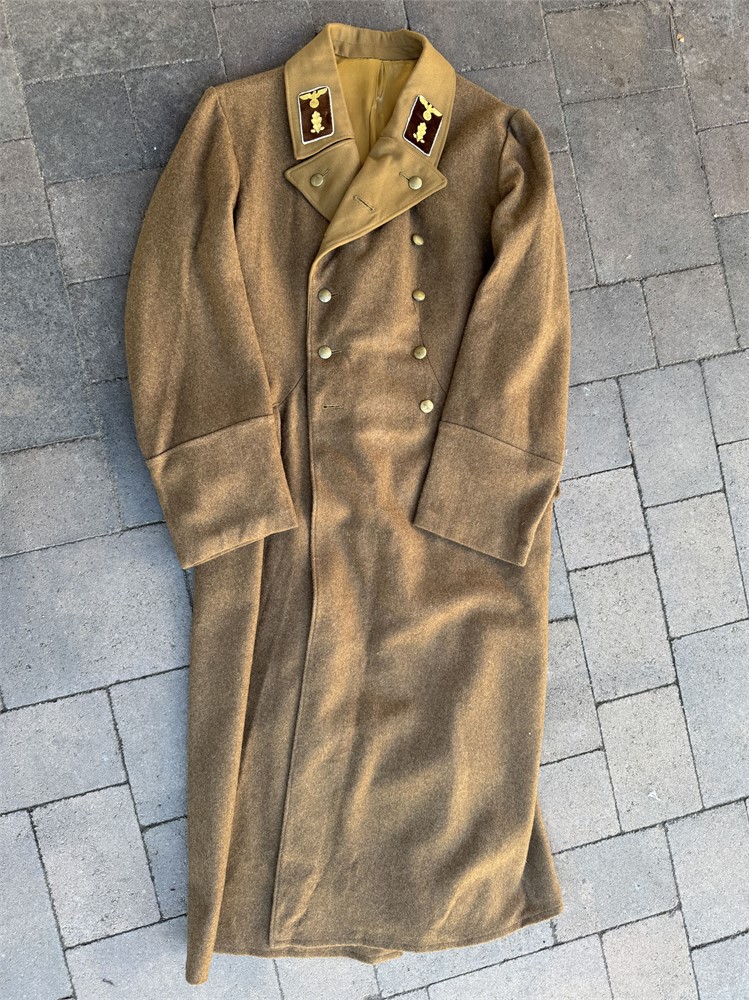 Brown wool overcoat with correct light brown/tan tricot collar and lapels appears possibly unissued. Gold PL eagle and swastika buttons.  Collar tabs are Kreis level with white piping, however the left side tab is a reproduction (or at least has a reproduction eagle installed). There is no armband included. RZM label for "PL-Mantel W" (Political Leader Overcoat-Wool) is sewn into inside pocket. Overall the coat itself is in very fine condition and deserves to be restored.