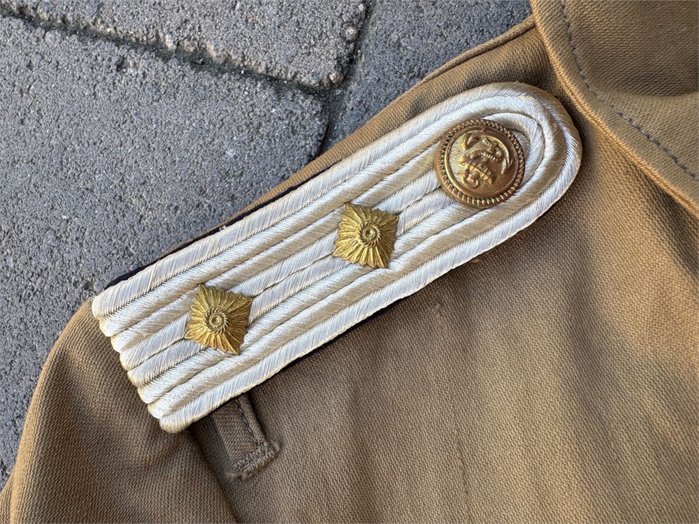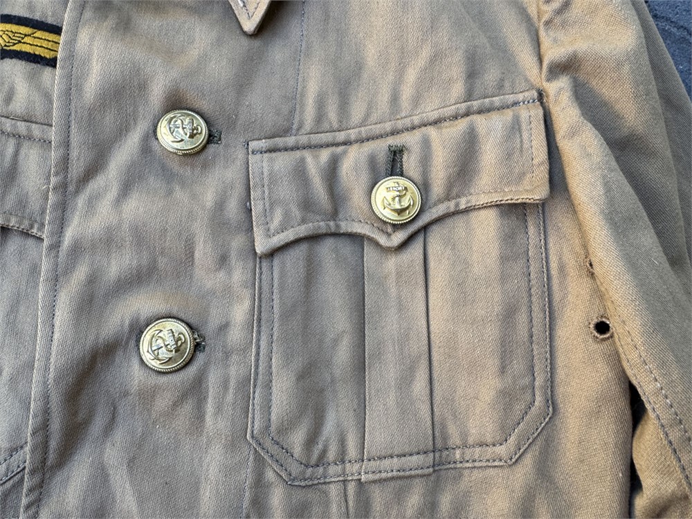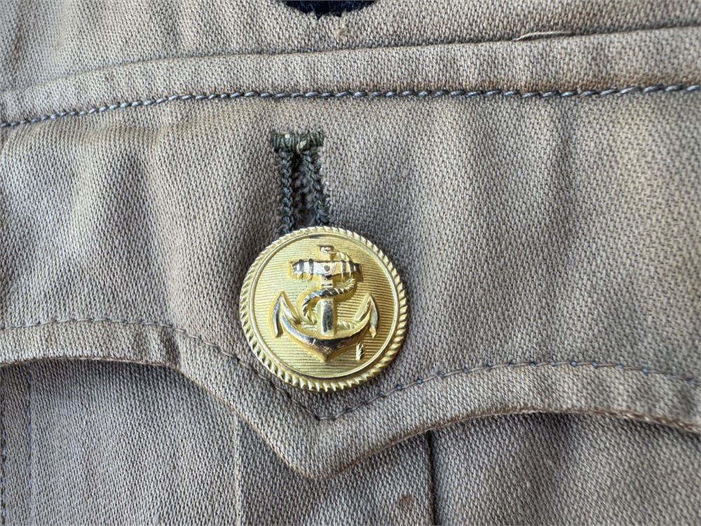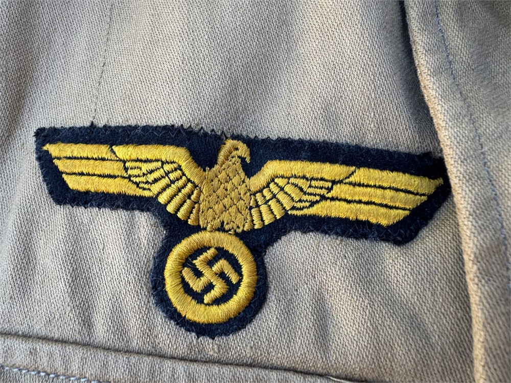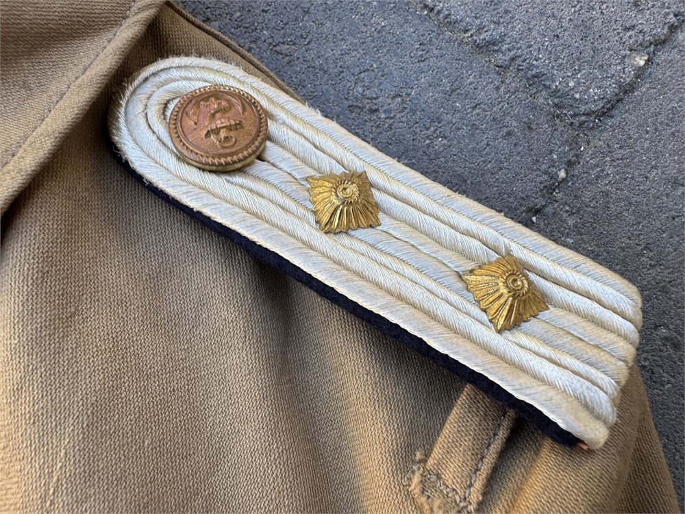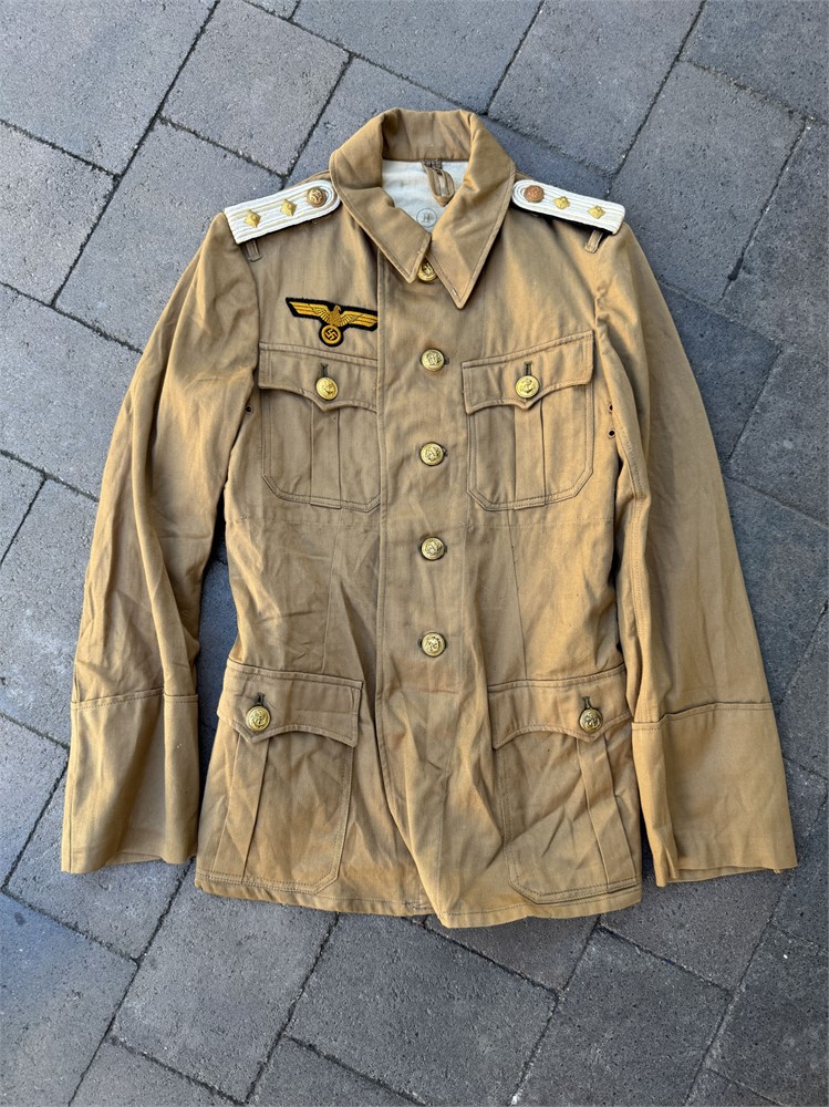 Kriegsmarine tropical tunic for a Kapitän-Leutnant. The tunic is the issued type with maker's name, size stampings and issue markings. The breast eagle has been replaced, probably during the period--the triangular machine woven eagle was removed and replaced with an embroidered yellow on dark blue insignia. The tunic is in very fine condition.