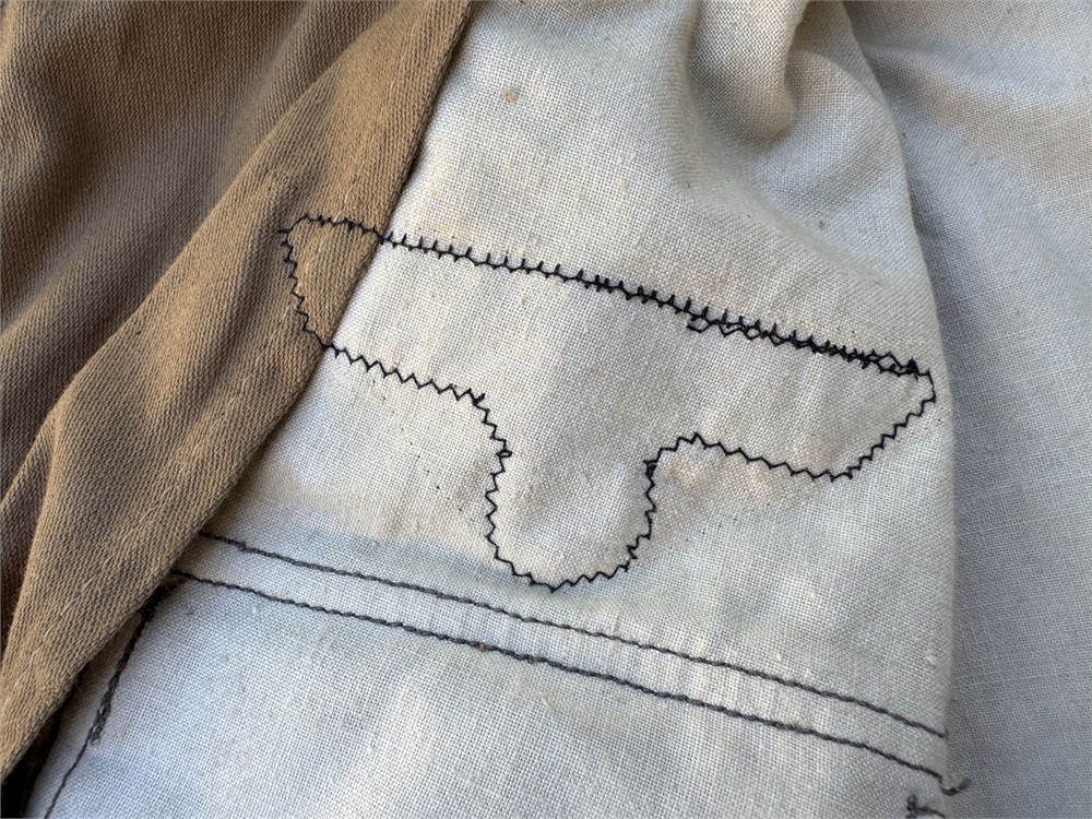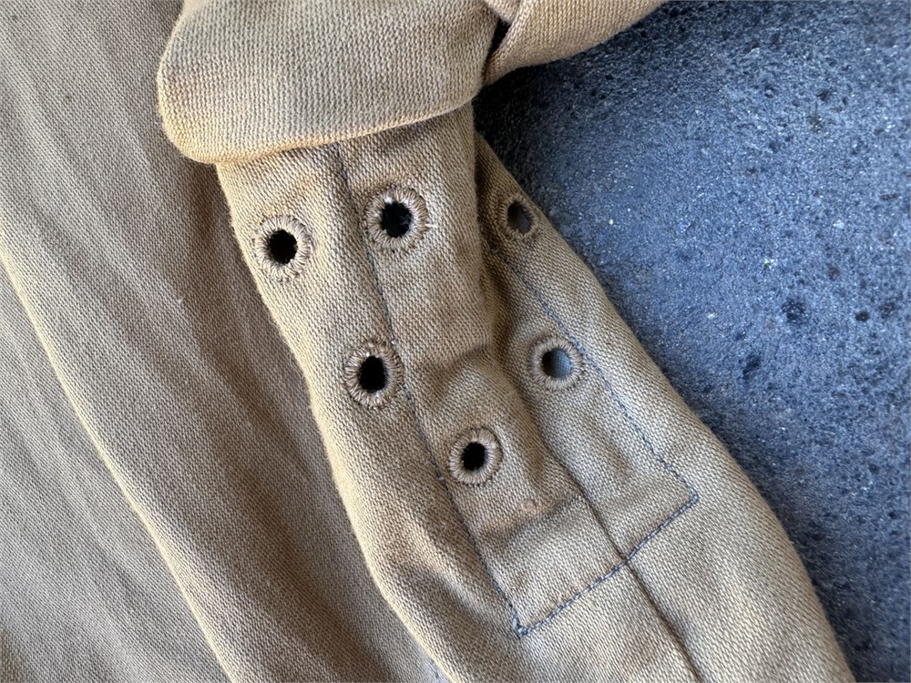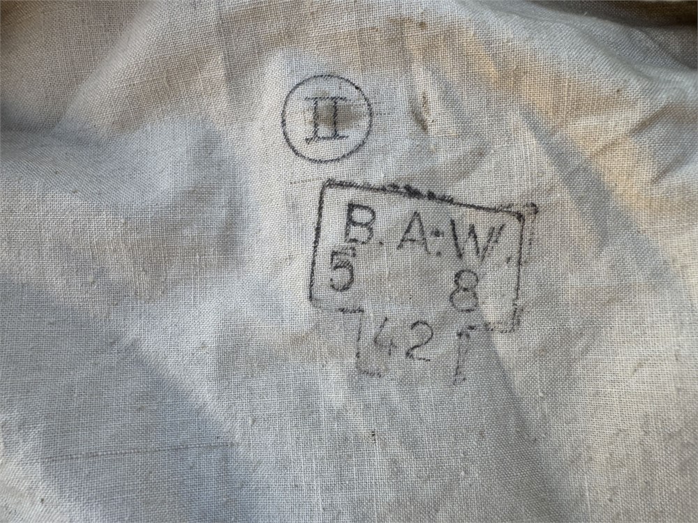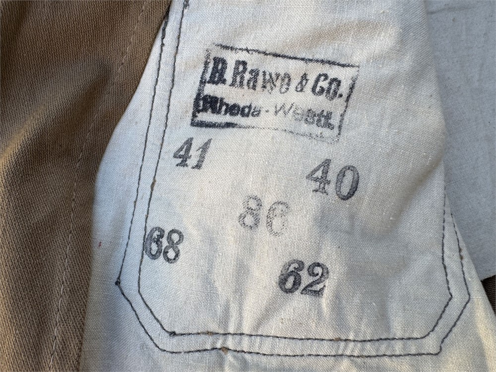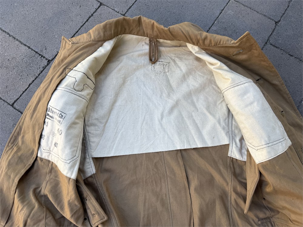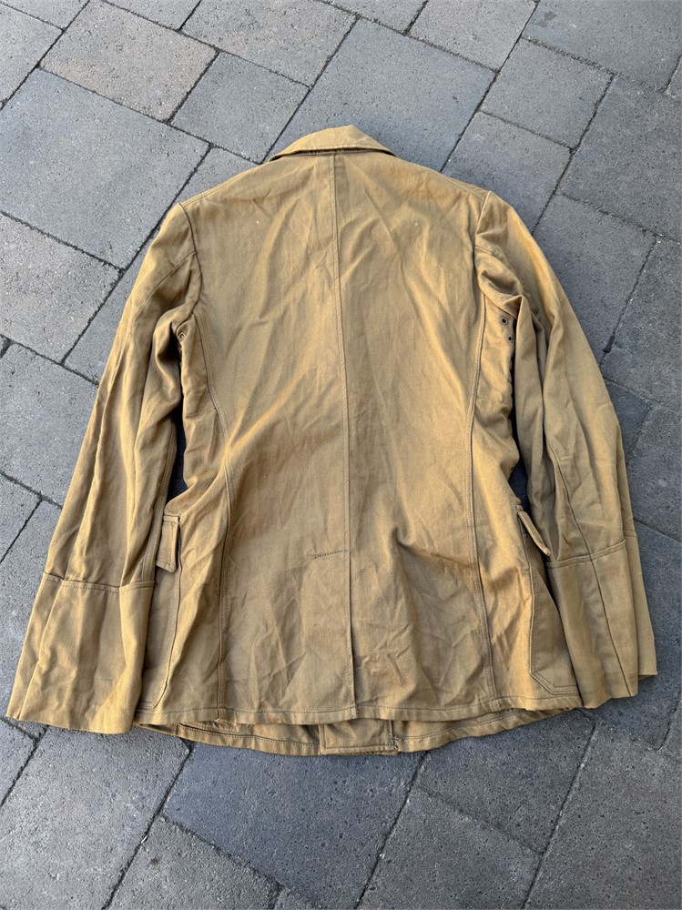 Kriegsmarine tropical tunic for a Kapitän-Leutnant. The tunic is the issued type with maker's name, size stampings and issue markings. The breast eagle has been replaced, probably during the period--the triangular machine woven eagle was removed and replaced with an embroidered yellow on dark blue insignia. The tunic is in very fine condition.