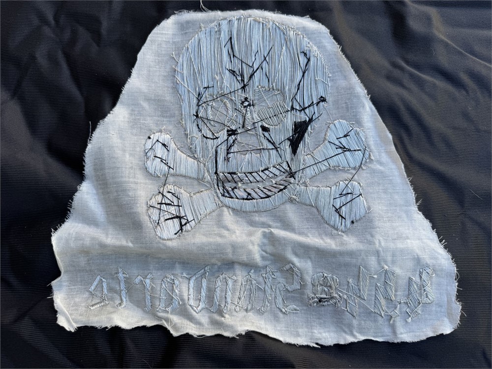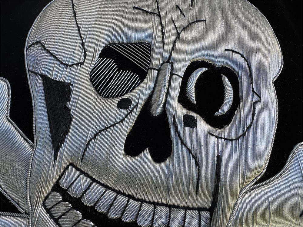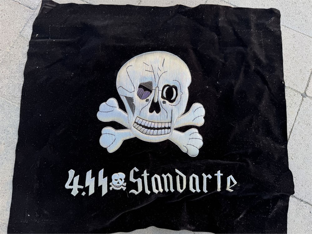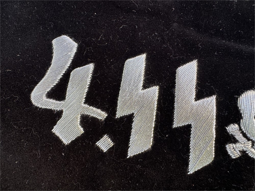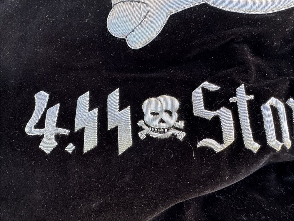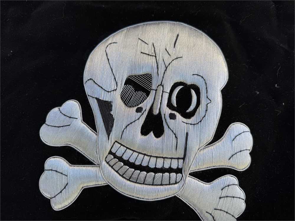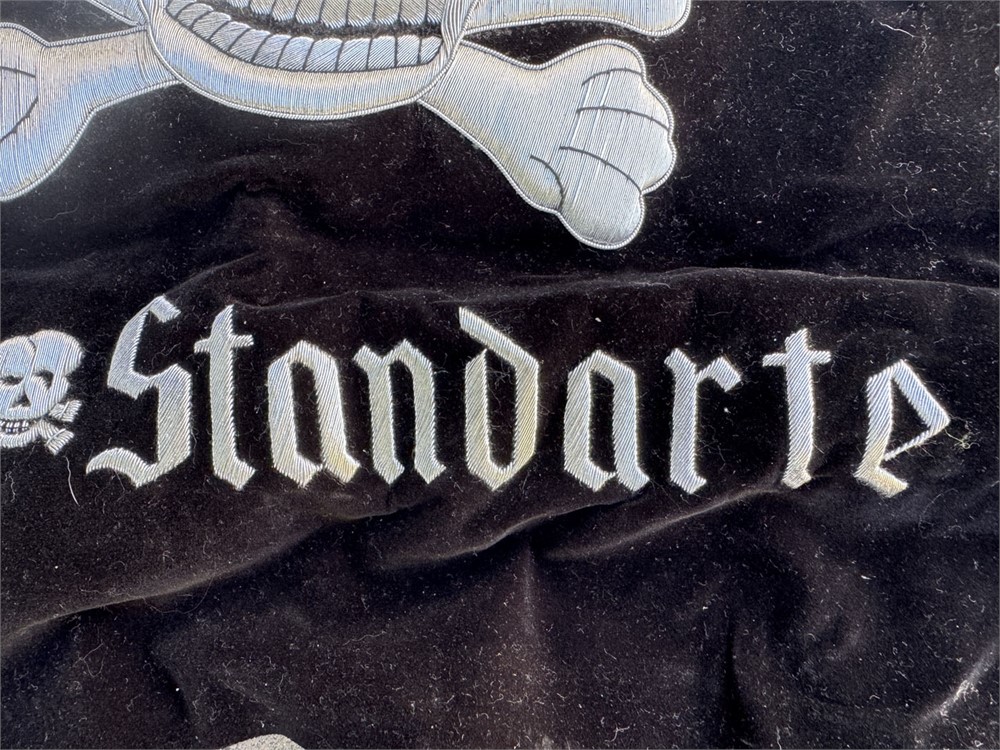 Bullion embroidered front and reverse reproduction SS Totenkopf trumpet banner. Just needs metal fringe and to be sewn together for a fine quality display.