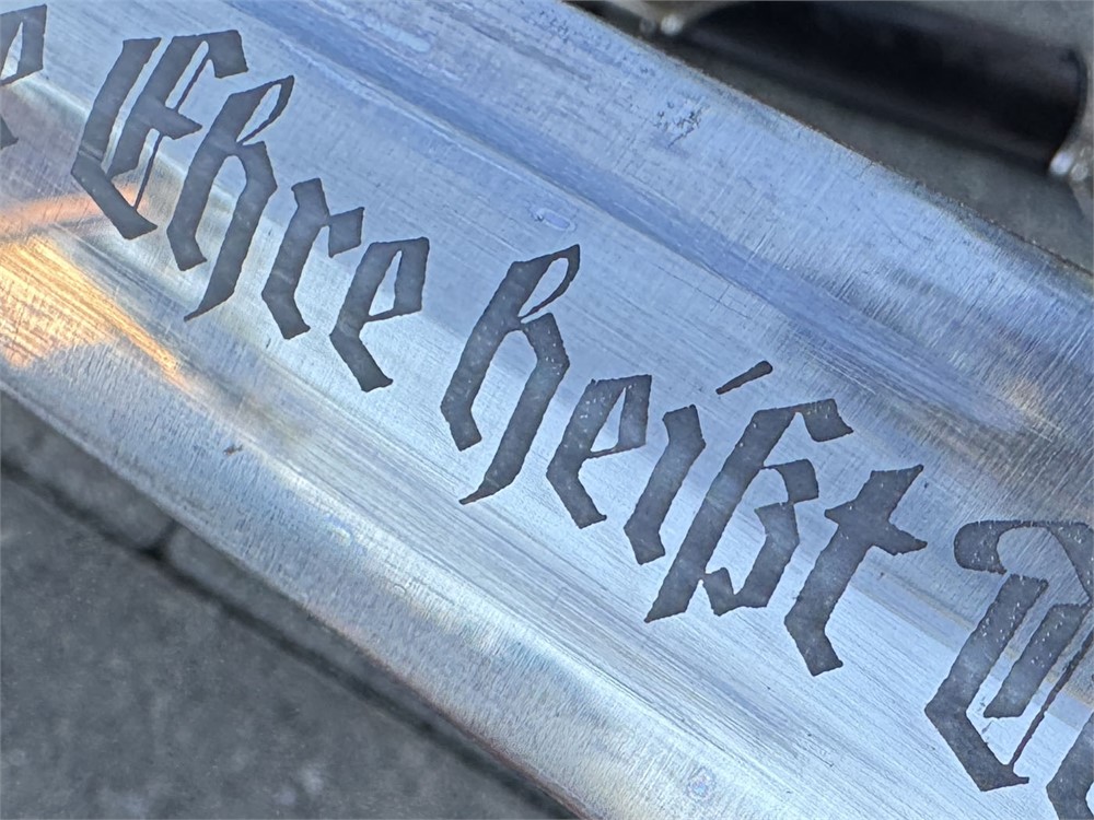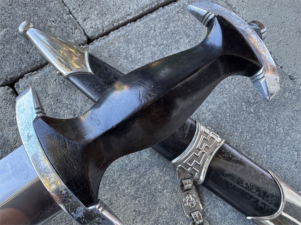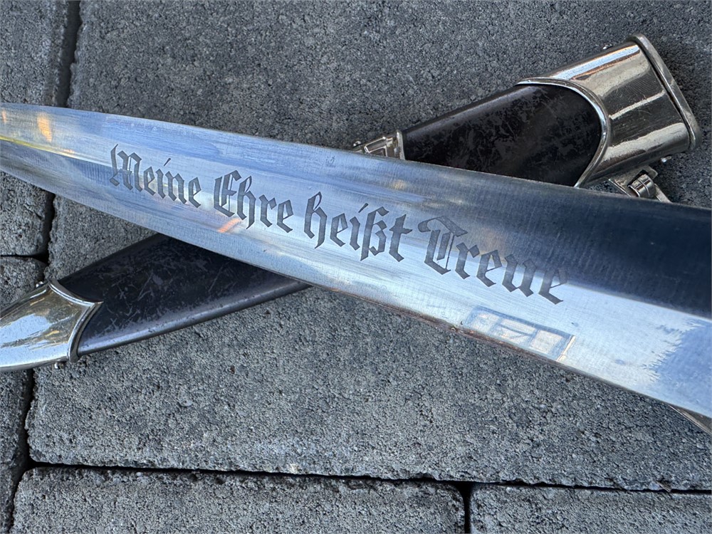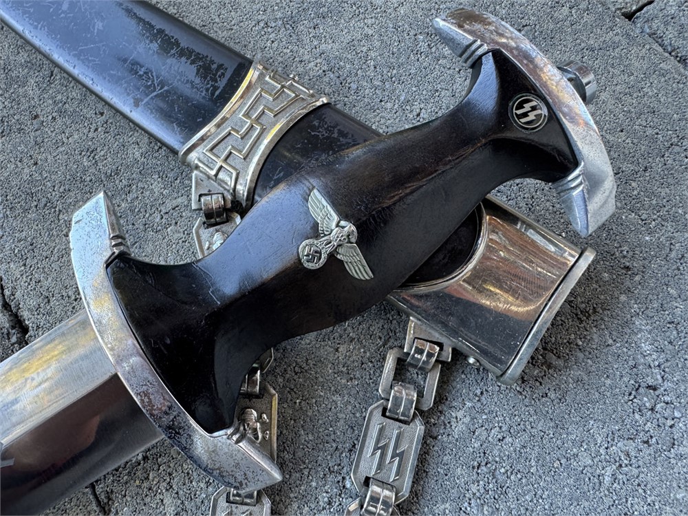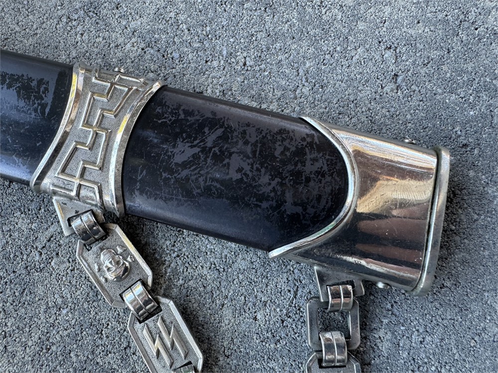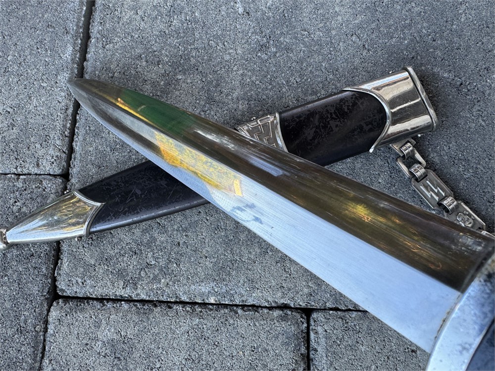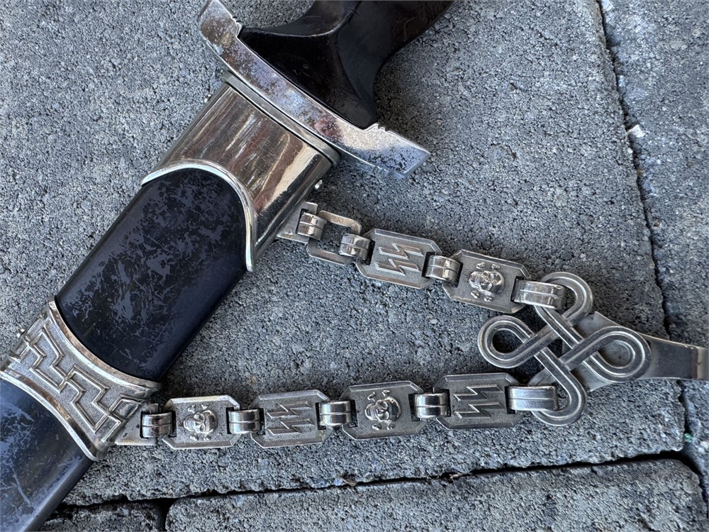 Outstanding early Chained SS dagger in exceptional, near-factory condition. The blade retains its original factory polish with deep, untouched motto etch and no signs of cleaning or later buffing. The lower crossguard is the correct unmarked type.  The grip is flawless, with tight fit to both guards and no chips, cracks, or repairs. The scabbard body is remarkable for still retaining the majority of its original protective lacquer, showing only minimal age toning under the finish. All nickel fittings match perfectly, and the chain and hardware remain crisp and undisturbed. A top-tier example that would be difficult to upgrade.