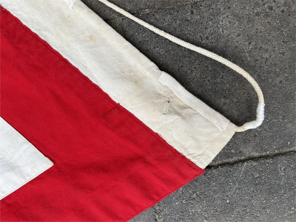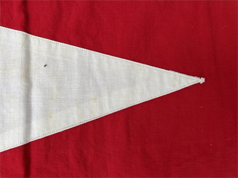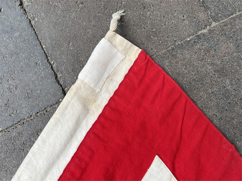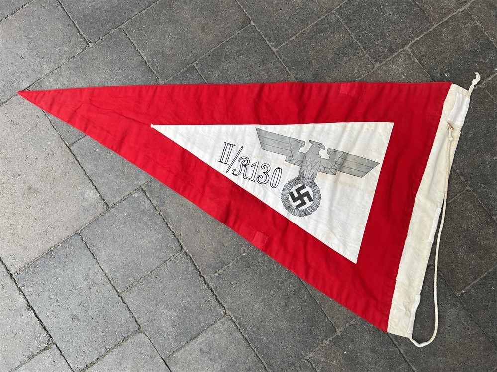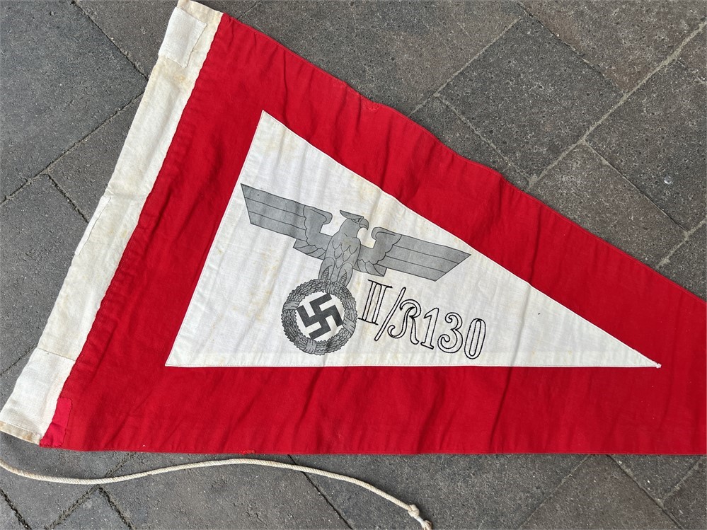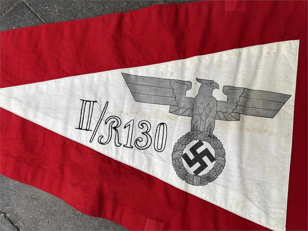 Scarce example of the SA Command flag for Reserve Sturmbann R130, which was located in Berleburg in SA Group Westfalen, Brigade 68 Arnsberg. The command flag would have been carried and displayed at every drill, demonstration, parade, exhibition, etc. in which the Sturmbann participated. Textbook example of multi-piece cotton construction with chain-stitched unit designation. The size is about 33 inches x 18 inches. There is an opening with an internal sleeve on one side of the flag which was for a supporting arm mounted on the flagpole--the metal arm would slide into the flag sleeve so the flag would always be fully extended and easily legible. There are several small patches as can be seen in the images--it's unknown whether the flag was repaired during the period or later. They are UV non-reactive (no glow) and are not distracting. The flag colors are still bright and show no fading. A very difficult to find SA Command flag!