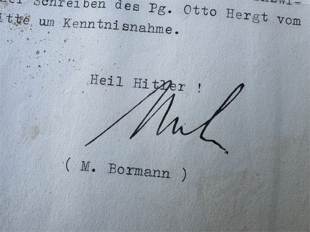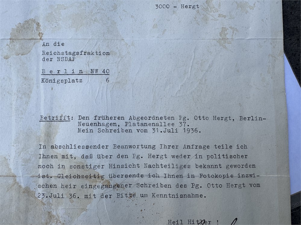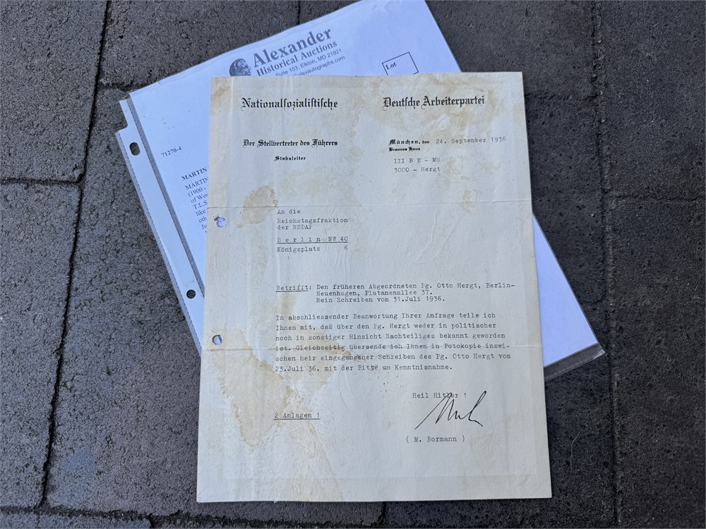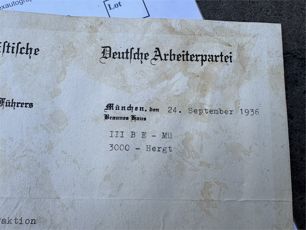 Official letter on NSDAP Stellvertreter des Führers Staff Leader München Brown House stationery. Letter was sent to the Reichstagsfraktion der NSDAP regarding Party Member Otto Hergt. The paper shows some staining and discolorations, and it is hole punched for filing. Note: there is a misspelling on the next to the last line--"heir" rather than "hier". Comes with a COA from Alexander Galleries.