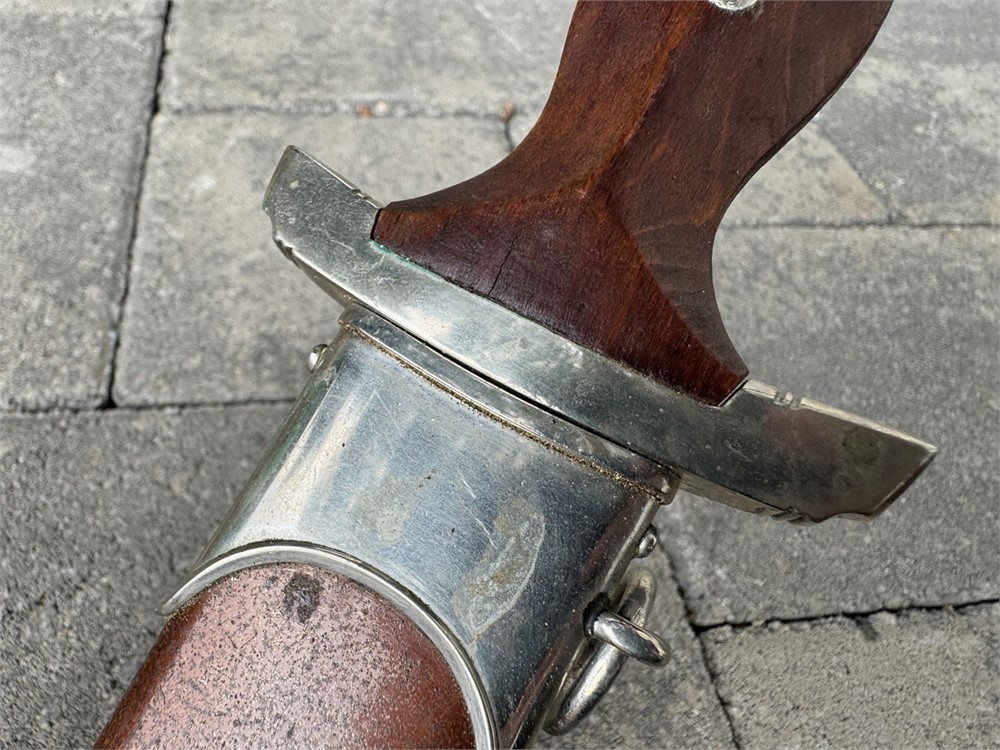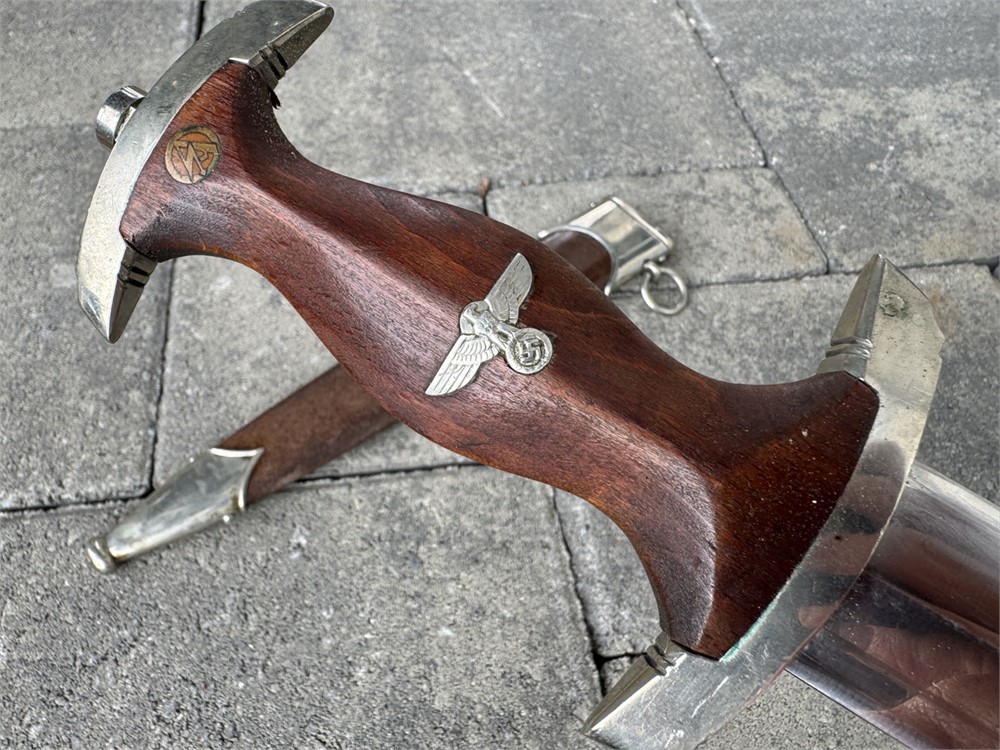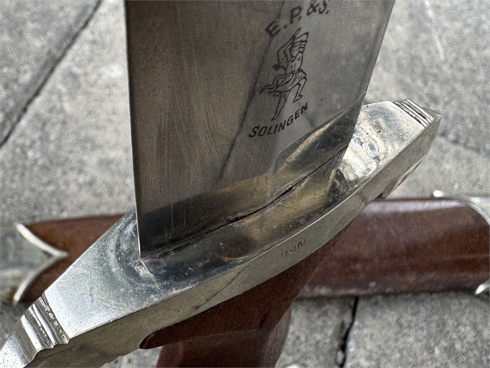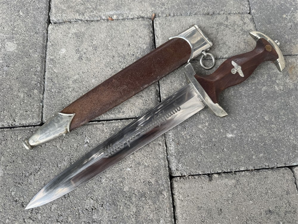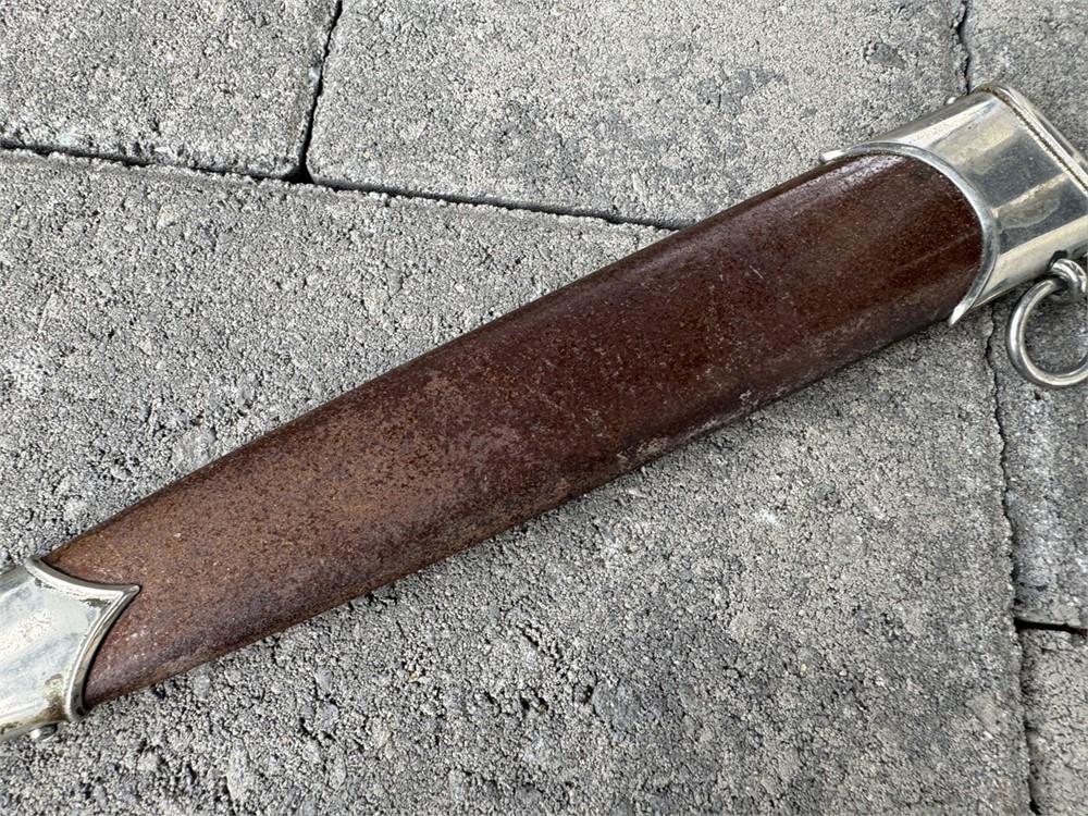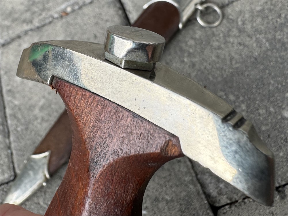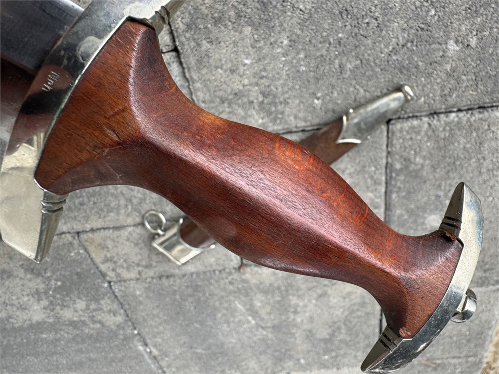 Quality specimen of an early dagger, likely produced in 1934.  Dagger was produced by the firm of Ernst Pack & Sohn, who were known for producing Rohm daggers.  This dagger was NOT a Rohm specimen, but was produced shortly after the "Rohm" order of daggers.  It's identical in every other way.  Scabbard and lower cross guard have the standard "flat" curvature, indicating this scabbard to be original to the dagger (it is almost impossible to switch scabbards unless you have two EP&S daggers to use, as almost no other dagger scabbard will fit the curvature of the lower cross guard of a dagger by this maker.  Blade is extremely fine with 100% cross-grain polish, and almost no rust.  Etching on both sides is precise and unworn.  Grip is virtually perfect.  Some lacquer remains on the scabbard.  Screws unturned, and ball slightly impacted.
