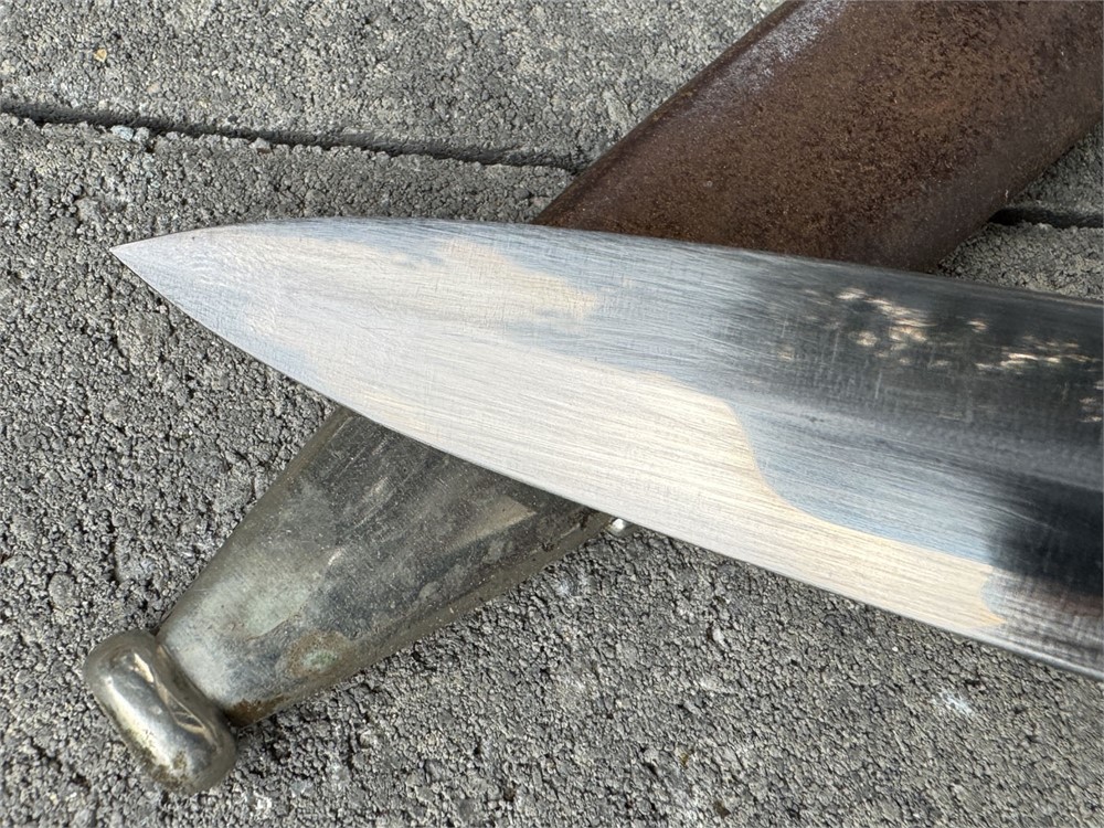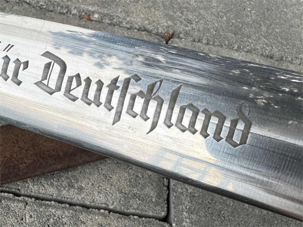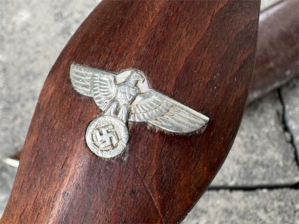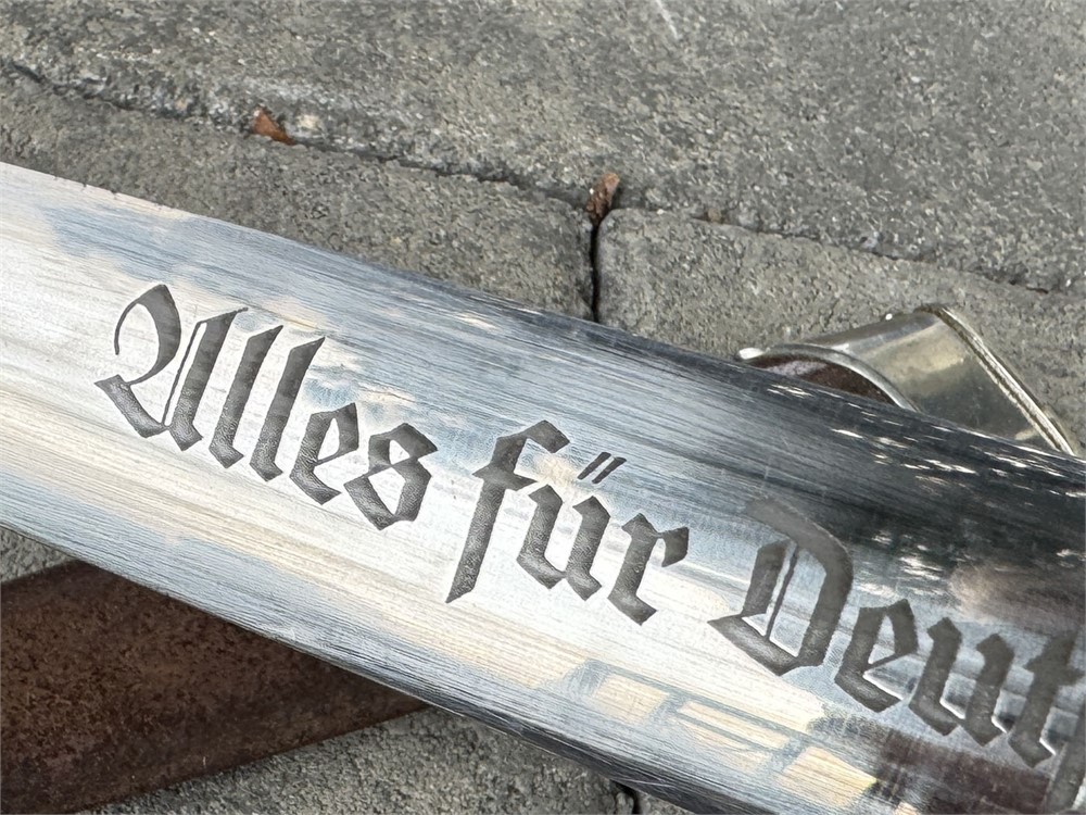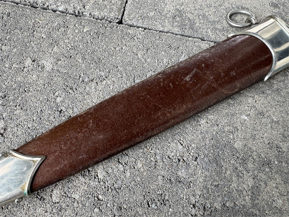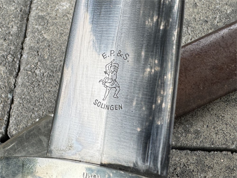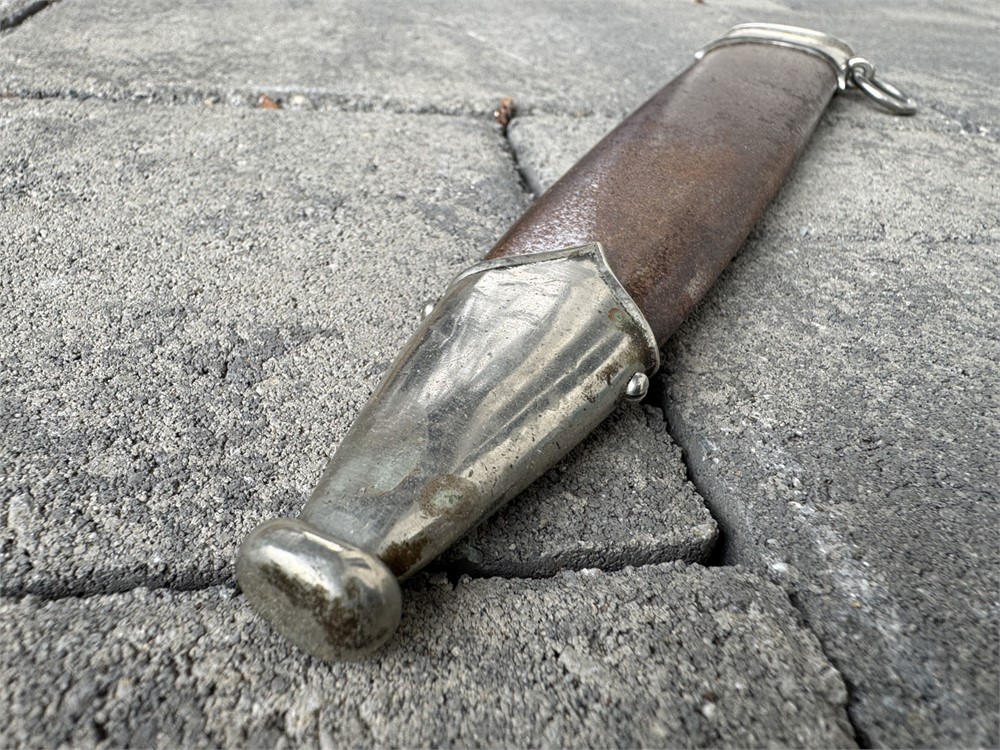Quality specimen of an early dagger, likely produced in 1934.  Dagger was produced by the firm of Ernst Pack & Sohn, who were known for producing Rohm daggers.  This dagger was NOT a Rohm specimen, but was produced shortly after the "Rohm" order of daggers.  It's identical in every other way.  Scabbard and lower cross guard have the standard "flat" curvature, indicating this scabbard to be original to the dagger (it is almost impossible to switch scabbards unless you have two EP&S daggers to use, as almost no other dagger scabbard will fit the curvature of the lower cross guard of a dagger by this maker.  Blade is extremely fine with 100% cross-grain polish, and almost no rust.  Etching on both sides is precise and unworn.  Grip is virtually perfect.  Some lacquer remains on the scabbard.  Screws unturned, and ball slightly impacted.