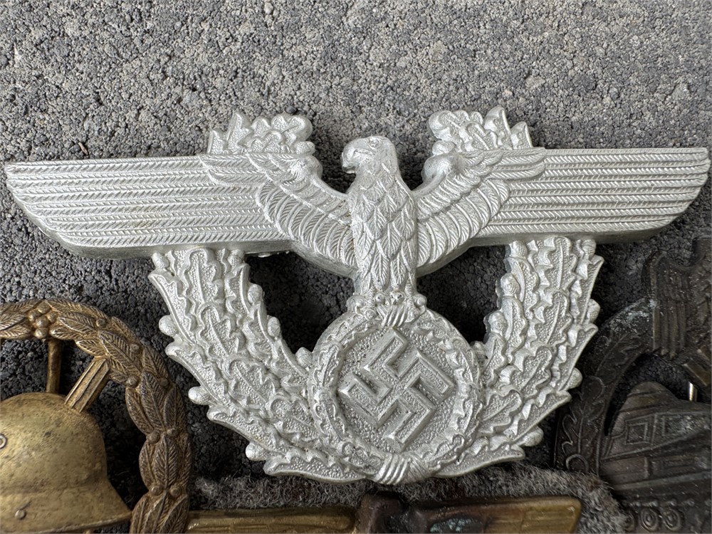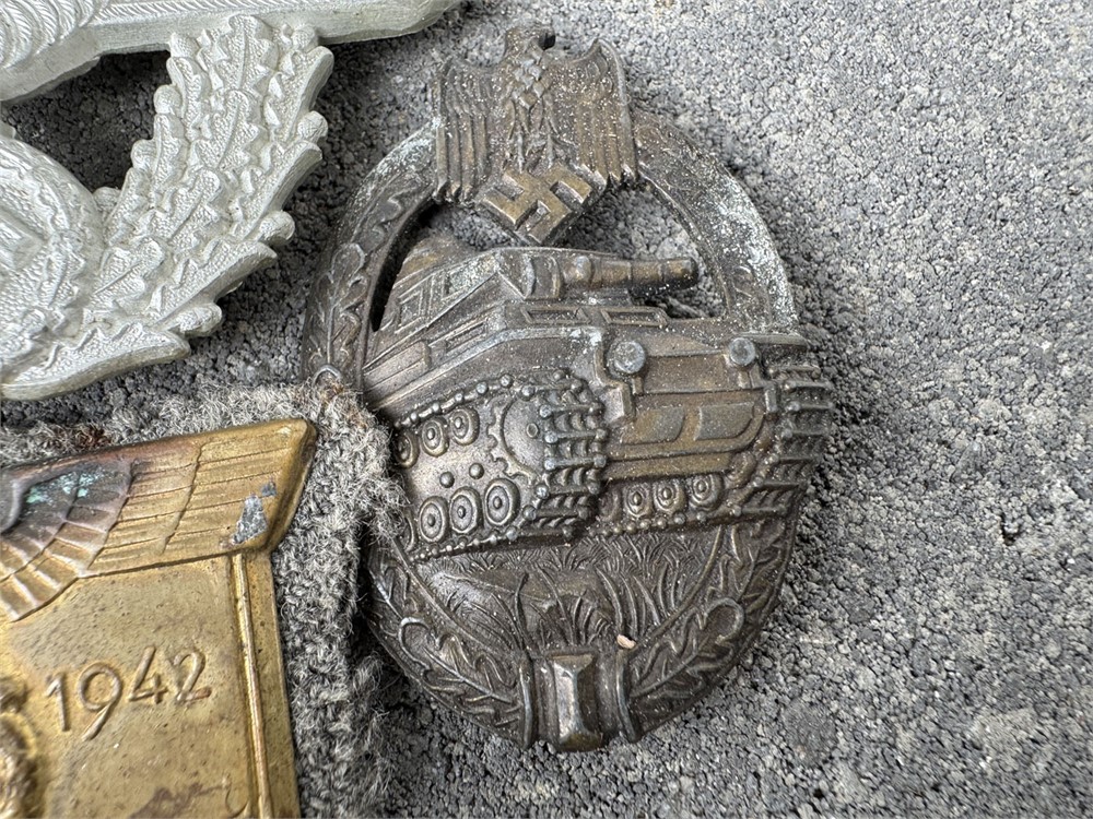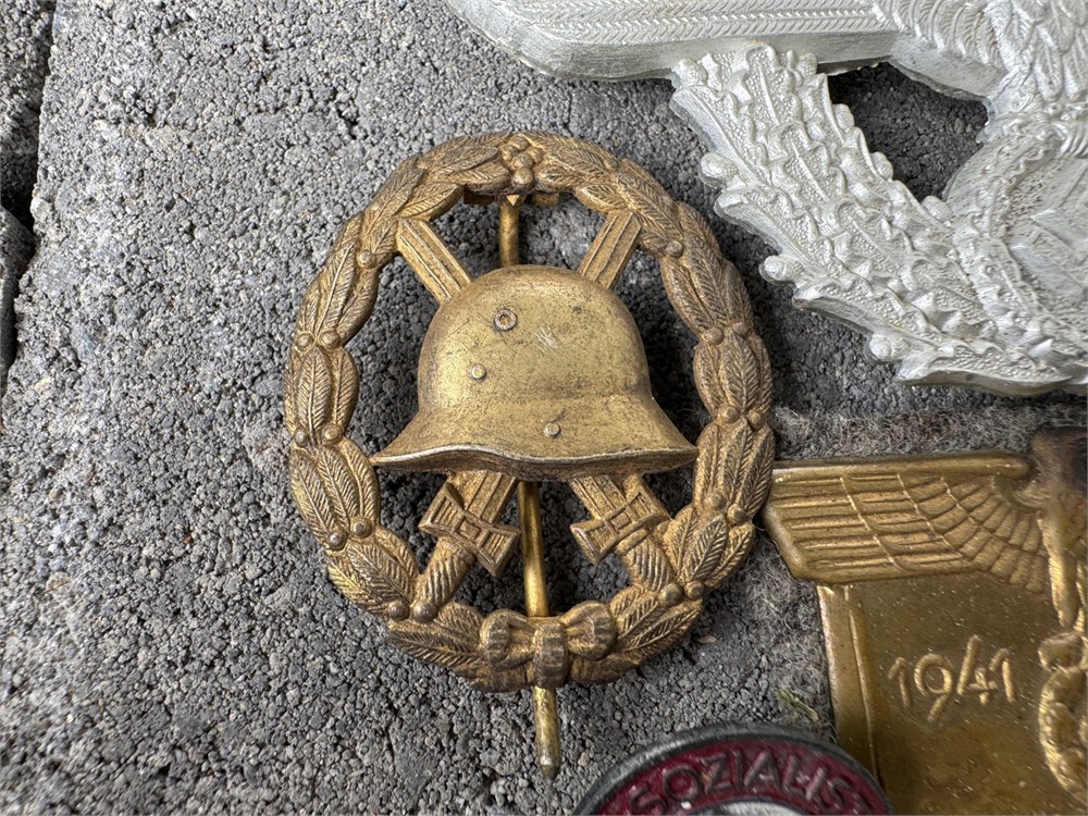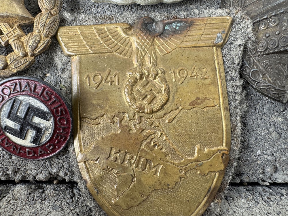 Group of badges and accoutrements from one estate in San Diego. Police cartouche box eagle and wreath in mint, unused condition; WWI Wound Badge, cut out type, most likely a black class with worn-off painted finish; Krim Shield with field grey wool backing, some corrosion; later war party membership badge in zinc with painted details, RZM marked; Panzer Assault Badge in bronze, maker marked "AS" in a triangle, complete with original pin, hinge, and clasp, some zinc oxidation. Please see the photos for more details. The group has never been in a collection.
