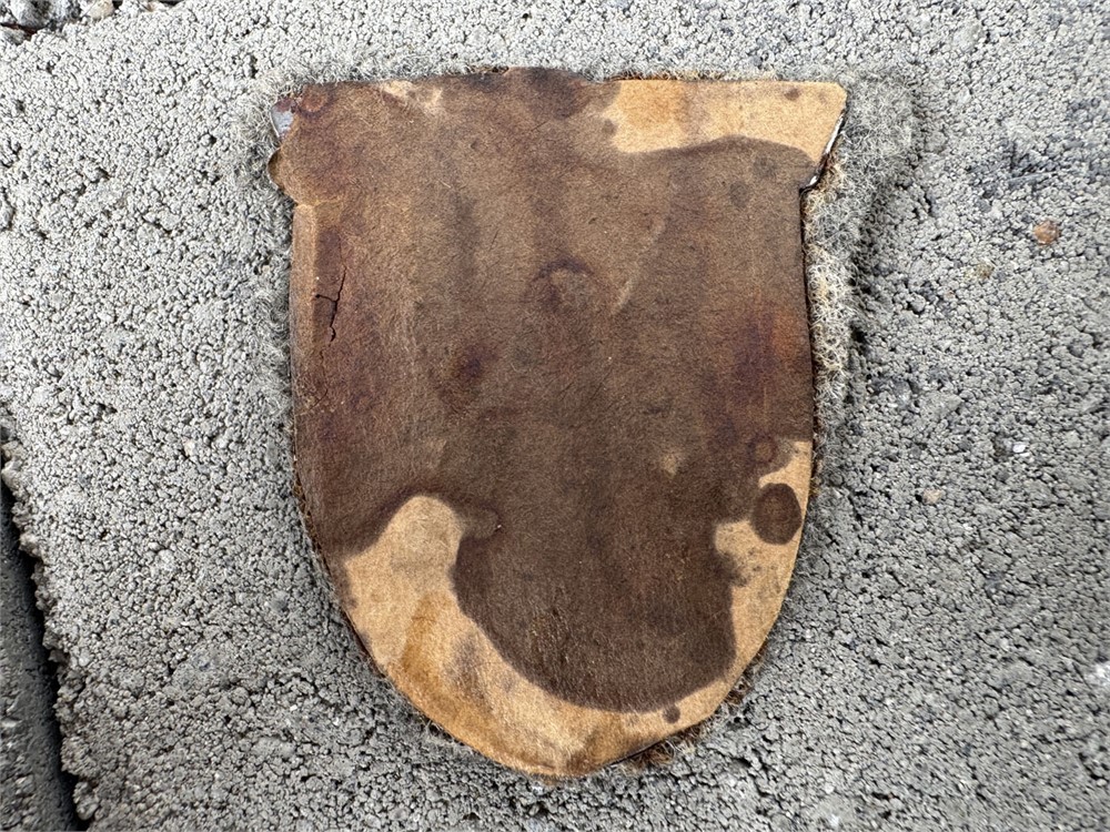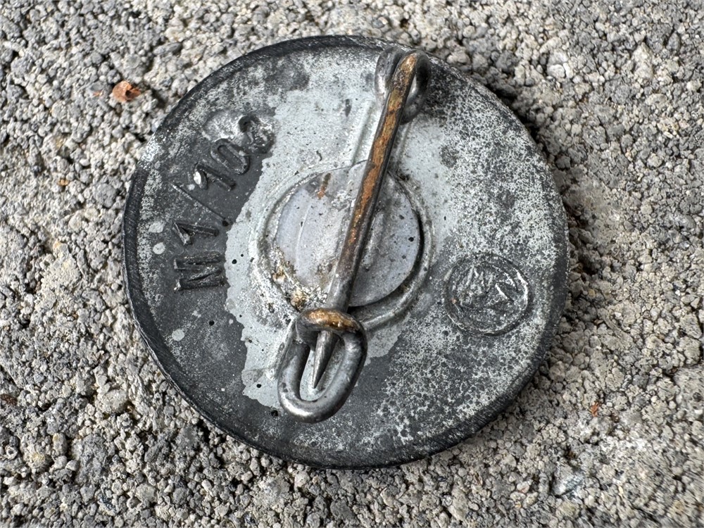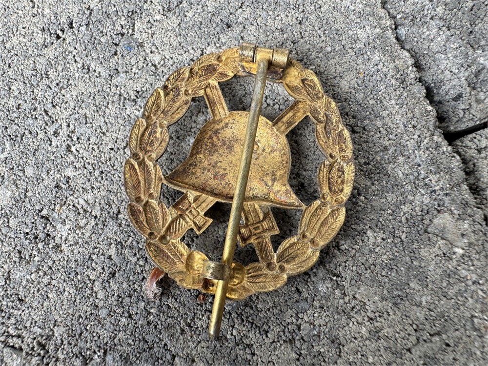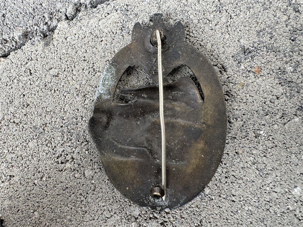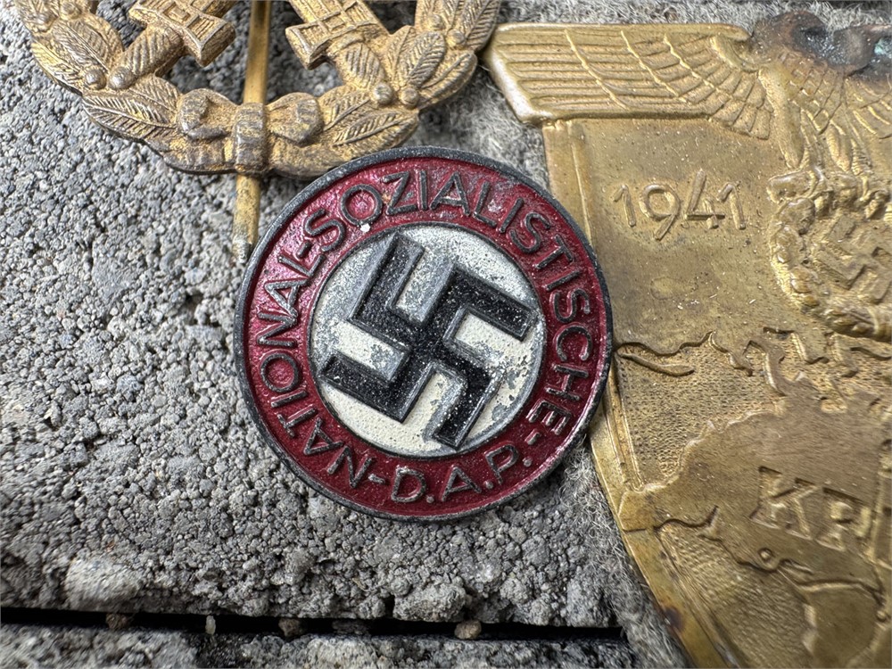 Group of badges and accoutrements from one estate in San Diego. Police cartouche box eagle and wreath in mint, unused condition; WWI Wound Badge, cut out type, most likely a black class with worn-off painted finish; Krim Shield with field grey wool backing, some corrosion; later war party membership badge in zinc with painted details, RZM marked; Panzer Assault Badge in bronze, maker marked "AS" in a triangle, complete with original pin, hinge, and clasp, some zinc oxidation. Please see the photos for more details. The group has never been in a collection.