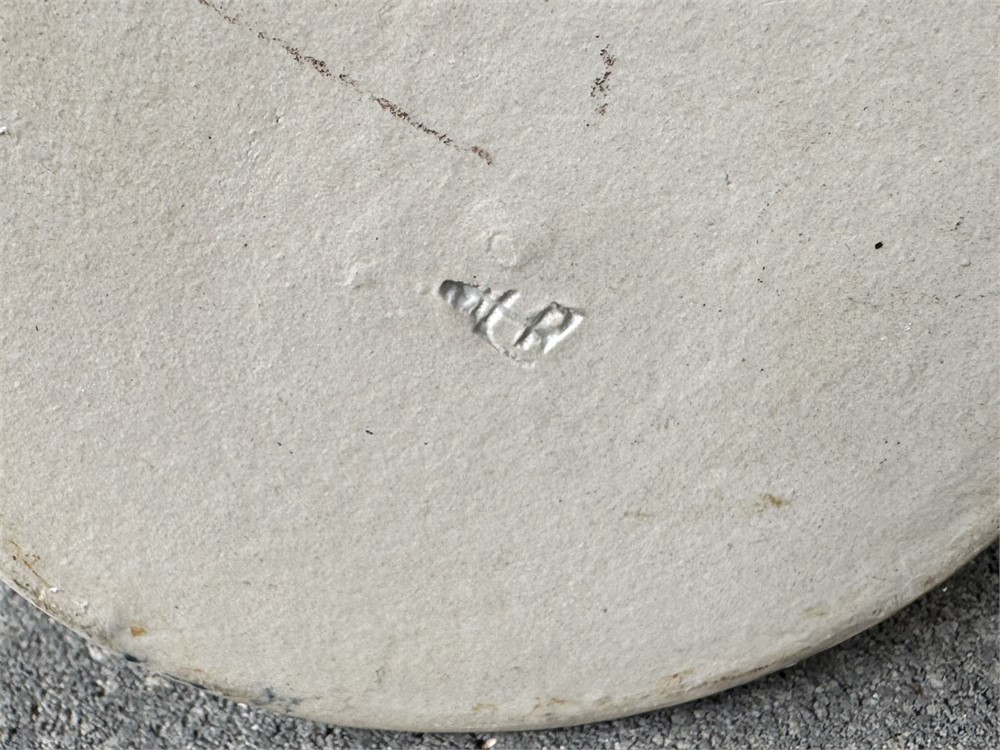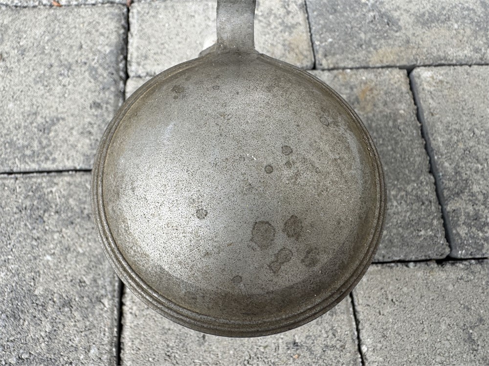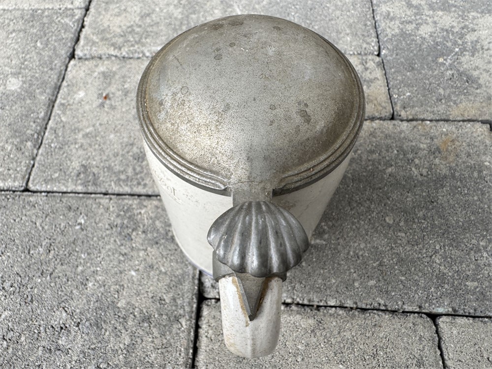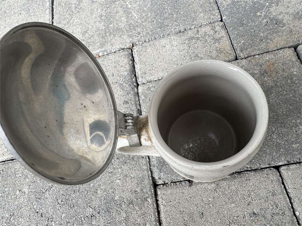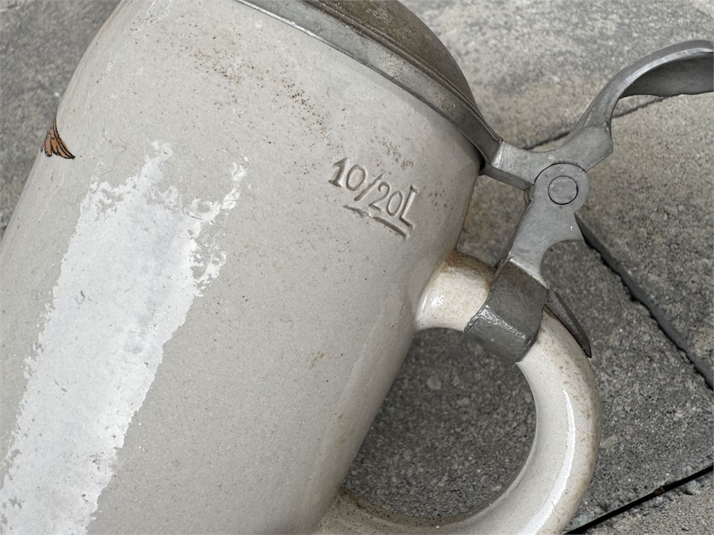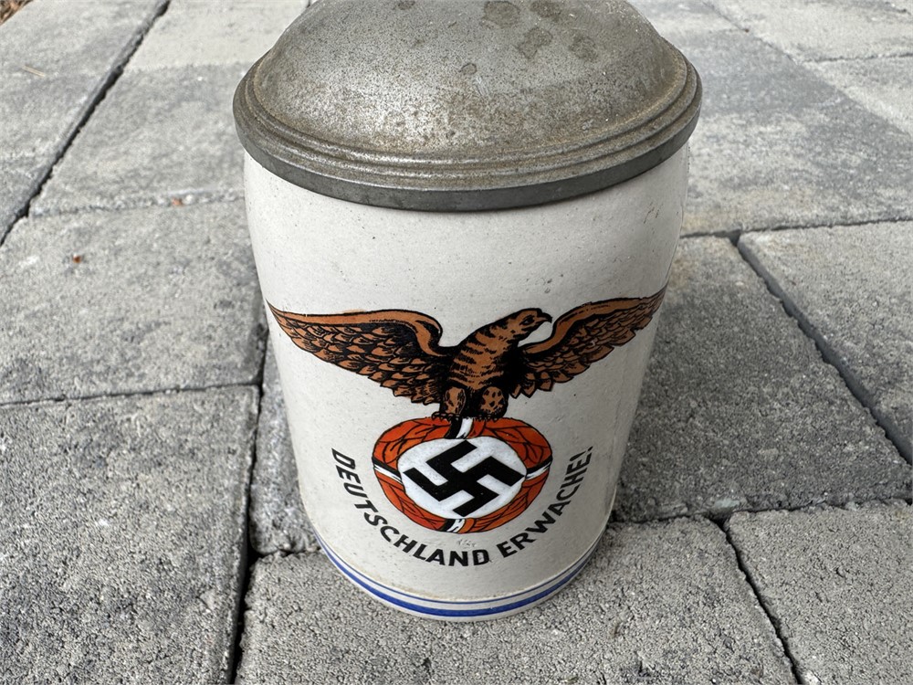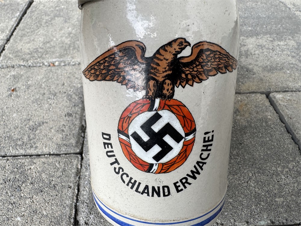 Grey stoneware beer stein features an early Party eagle clutching a red wreath with swastika, under which is the slogan "Deutschland Erwache!" There is a partial maker's mark pressed into the base of the stein and "10/20 L" (1/2 liter size). Metal lid is unmarked with a dark exterior patina and shiny interior. Scarce design!