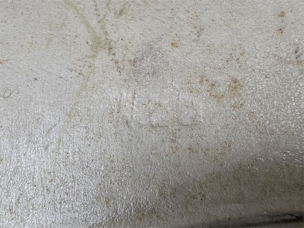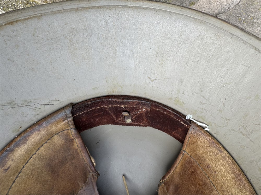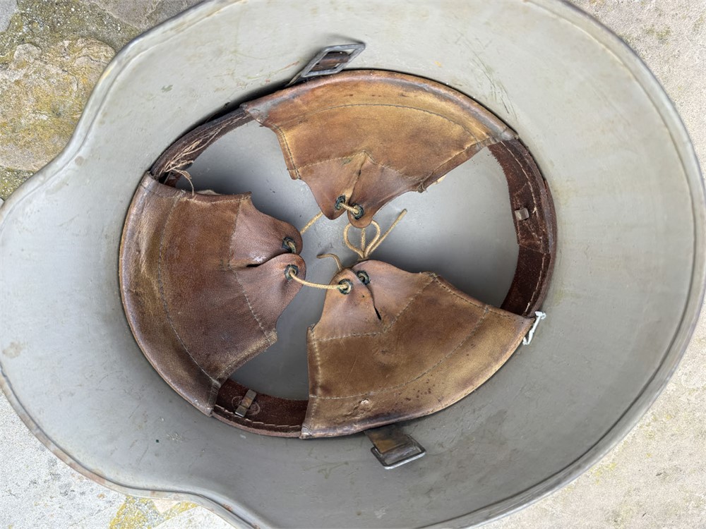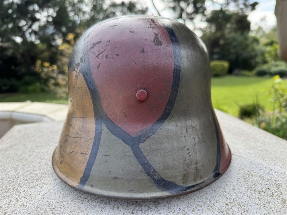 German World War I M18 steel helmet with a period, hand-applied camouflage pattern in tan, red-brown, and green, divided by black lines. The paint shows age-consistent wear with scattered surface scratches and handling marks, but retains strong overall coverage. Color is very bright compared to other examples. Inside is an M16-style liner (with leather attachment band) instead of the later metallic band- a typical late-war mix of components. Side flange has manufacturer number of Si66, and interior dome has steel lot number. Interior shows very little rot or damage whatsoever, just minor age and grime. Drawstring intact!
