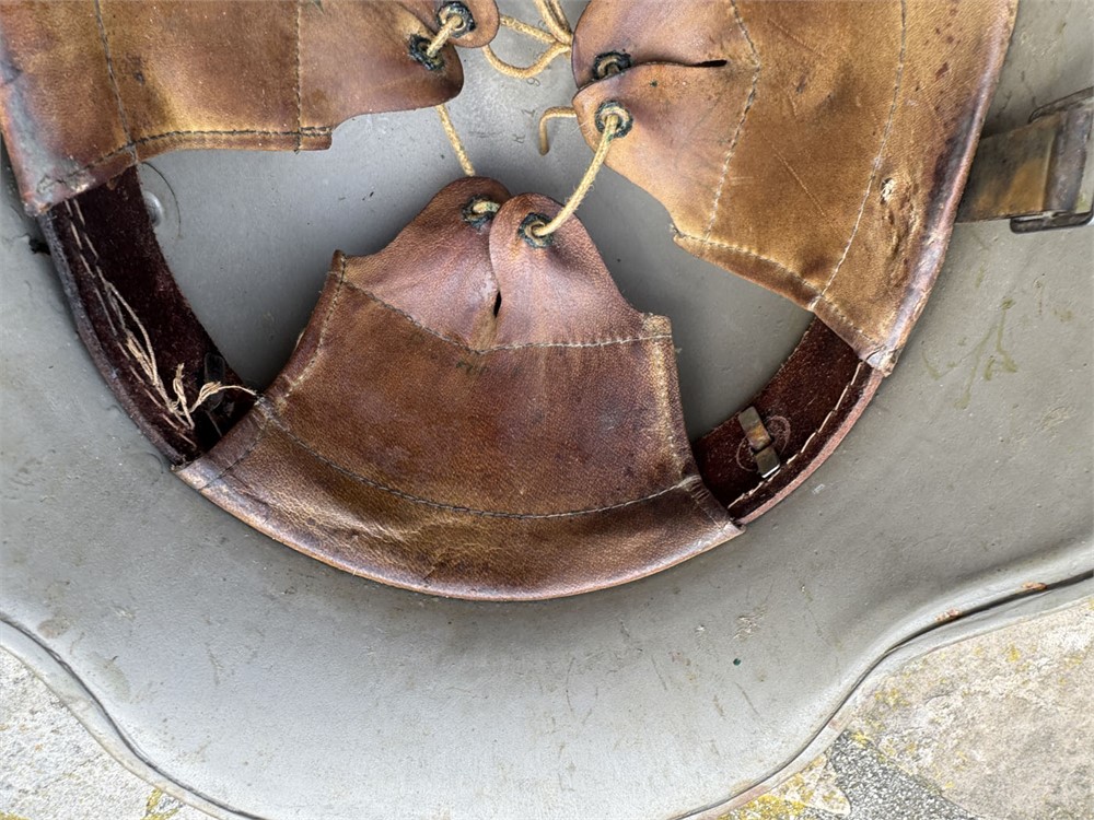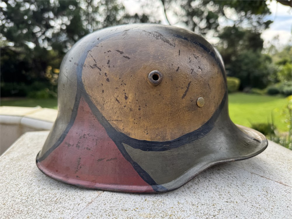 The M18 was the final wartime version of the German Stahlhelm, introduced to improve comfort and protection. Camouflage finishes like this were ordered in 1918 to help break up the helmet’s outline in the field, and were hand-applied by soldiers in the field. As is typical for camouflage helmets, the original German green paint remains intact on the interior. This is a choice example.