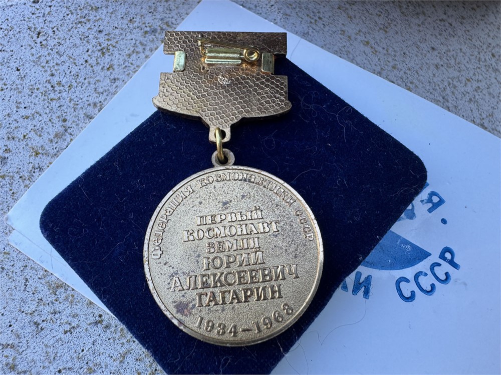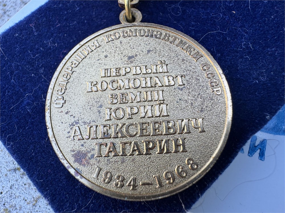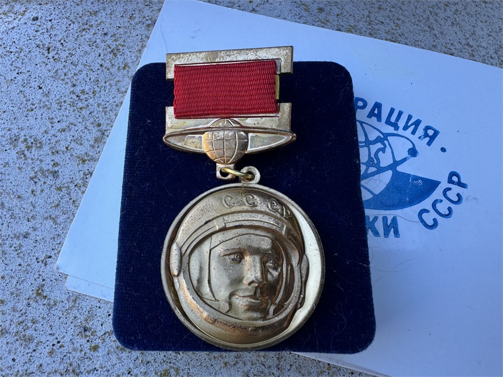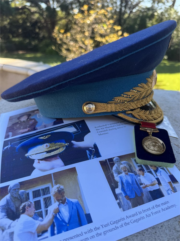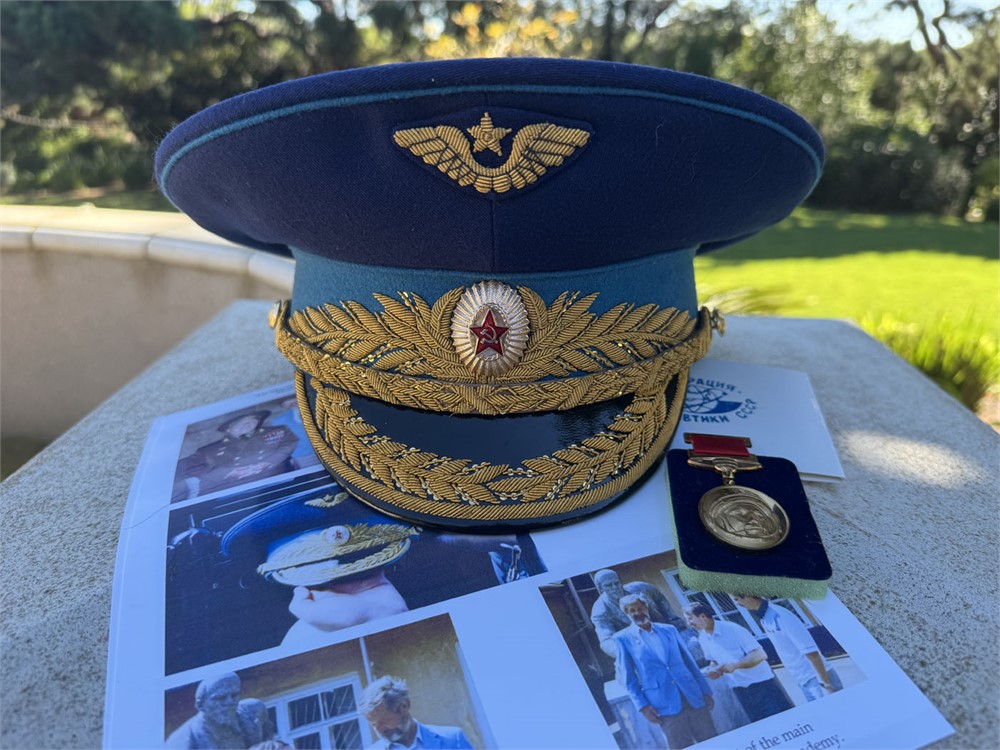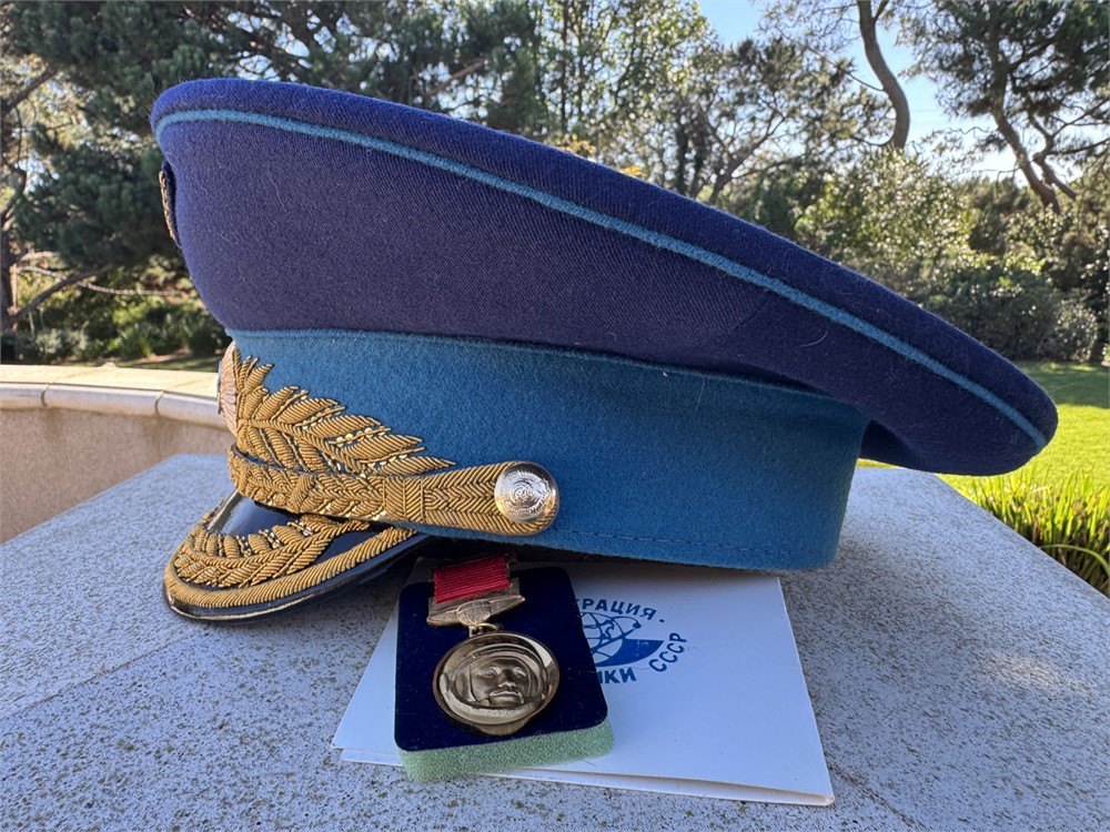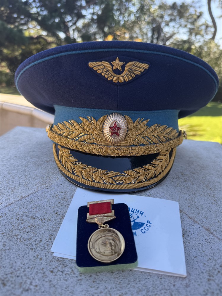 Accompanying this visor is a Yuri Gagarin Medal, presented to Crandall for artistic contributions to aviation history.  Jerry Crandall was an American artist and illustrator known for his meticulous depictions of the American West and World War II aviation. Born in 1934, he built a reputation for historically precise, emotionally charged paintings that blended technical accuracy with narrative storytelling. His work extended into sculpture, model design, and historical consulting, making him a respected figure among collectors and historians alike. Crandall’s legacy sits at the intersection of art and authenticity—an artist who painted history like he had lived it.