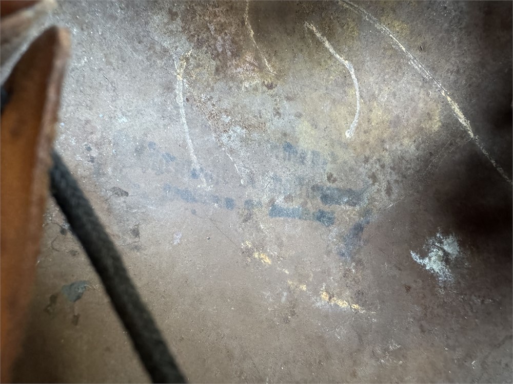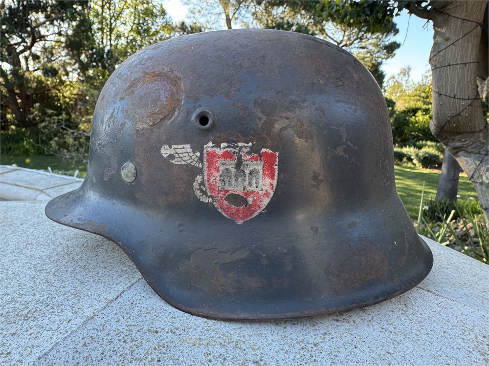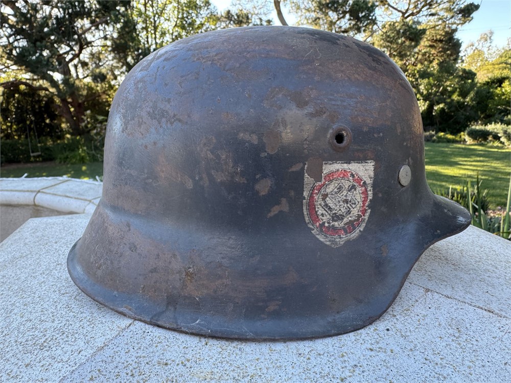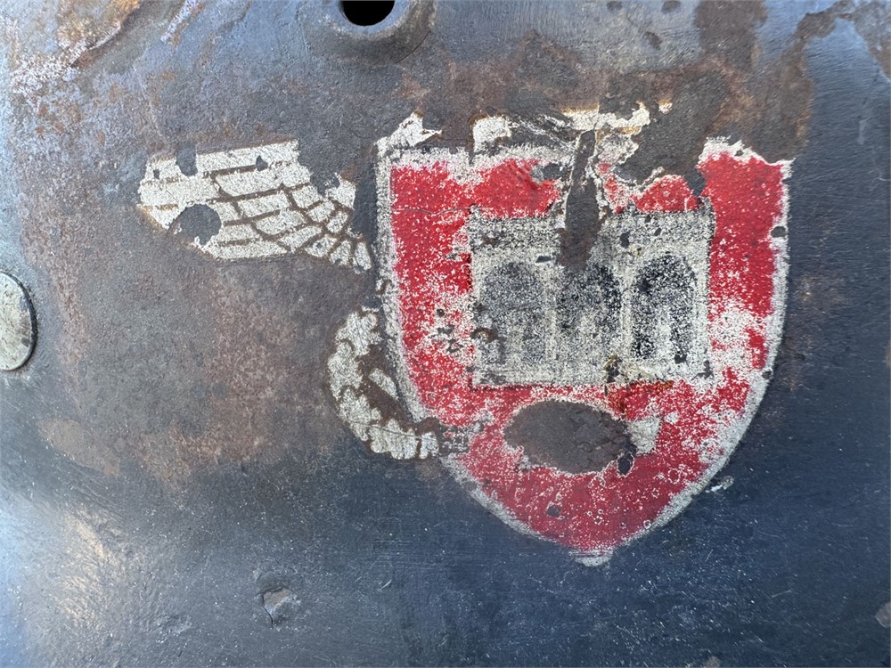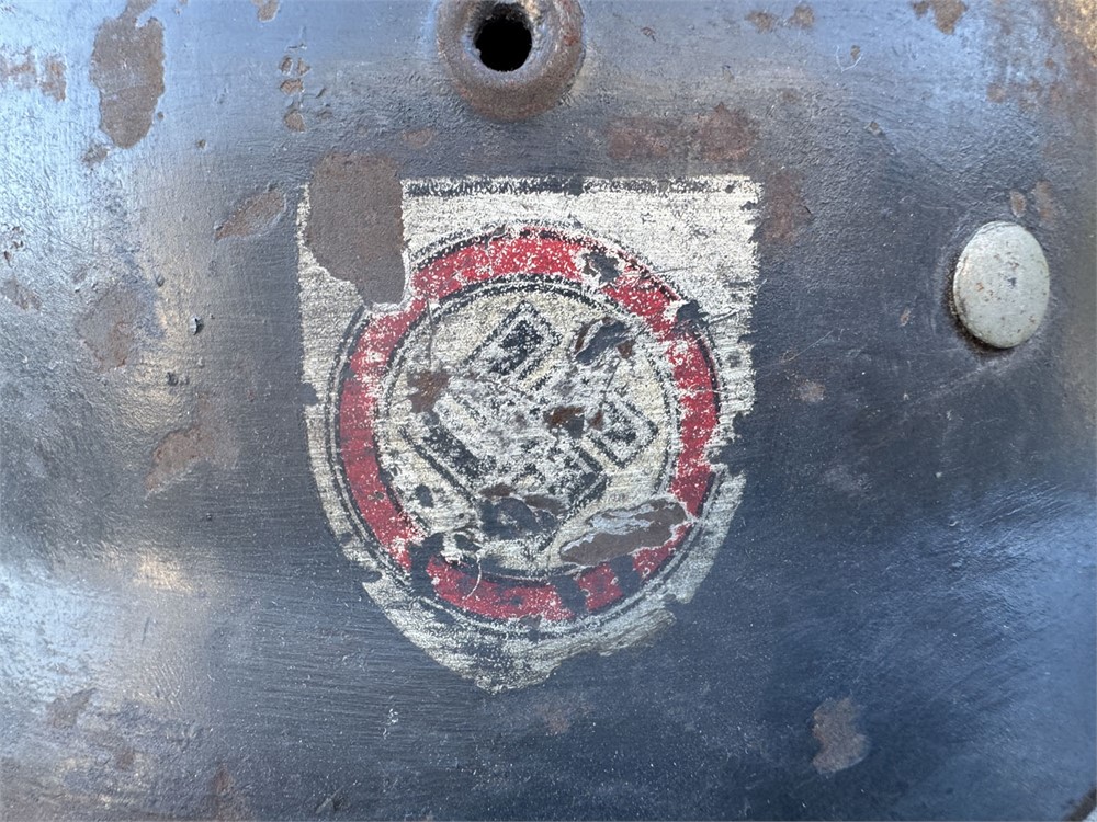 Very unique combination of decals on this recently surfaced Luftwaffe blue helmet. This M42 helmet was recently acquired in the southwest US by a picker, and has never been cleaned (there is a light dusting of rust where the paint has worn through). Helmet is marked EKL64 over the steel lot number of 2328. Liner is original to the helmet, which is also dome-stamped on the inside. Helmet features very worn Feldherrnhalle decals. On the left side, beneath the FHH decal is an SA Eagle.