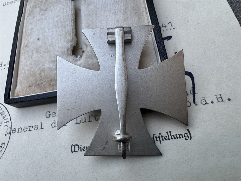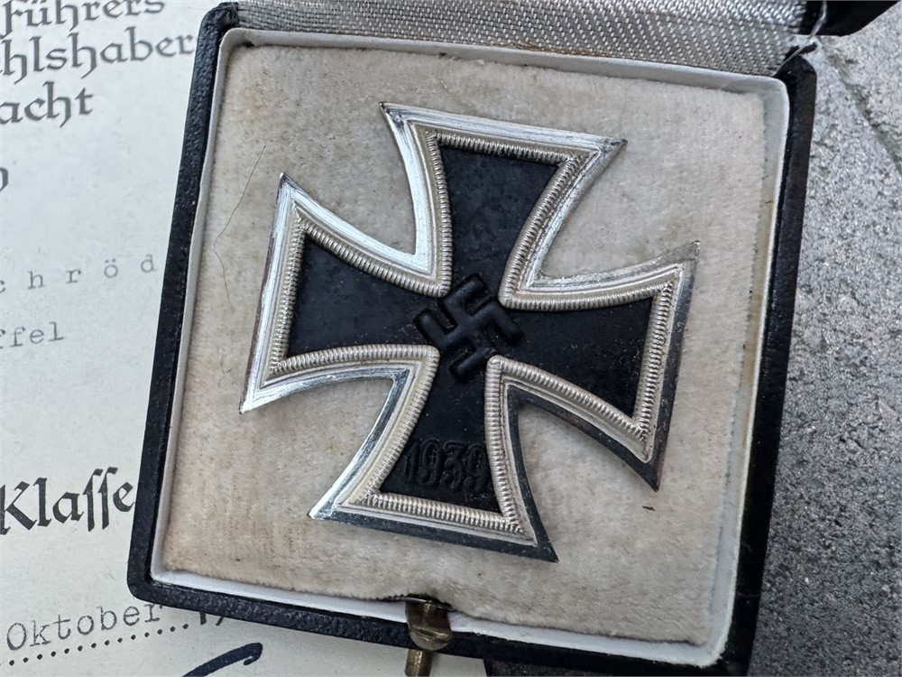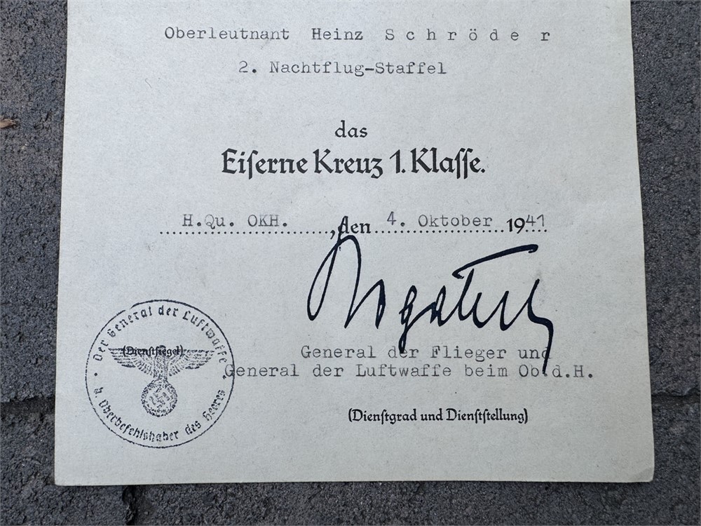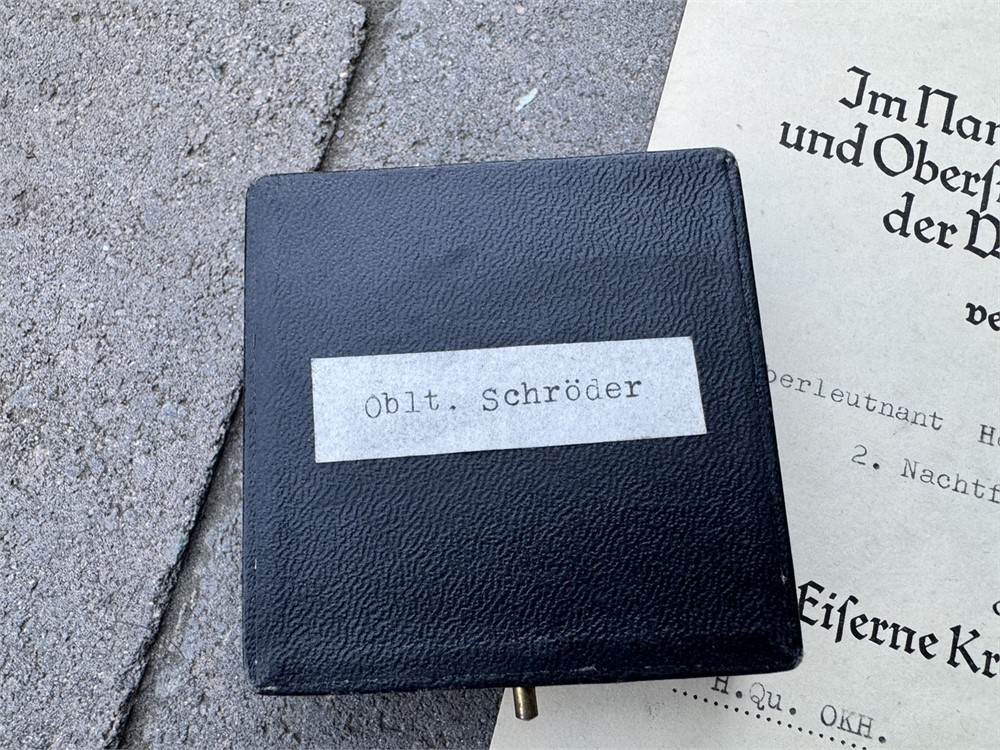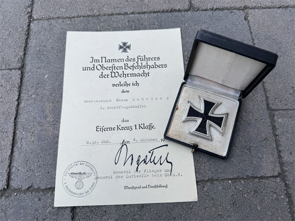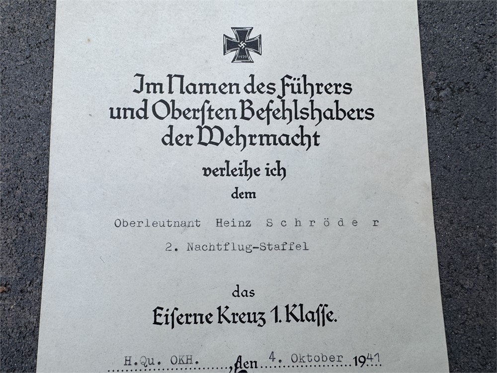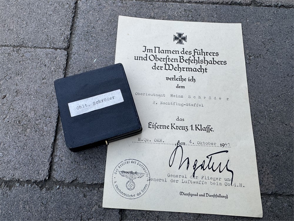 Excellent named Luftwaffe pilot’s Iron Cross First Class grouping, consisting of the award document to Oberleutnant Heinz Schröder of 2. Nachtflug-Staffel, dated 4 October 1941, together with his original cased EK1. The cross itself is a textbook early piece, housed in its period case which is neatly labeled “Oblt. Schröder,” clearly kept by the recipient. Both medal and case show only light age and no damage. The document remains clean, fully legible, and free of repairs or staining. A well-preserved, completely untouched set with direct attribution to a named Luftwaffe officer. Note: It was not uncommon for officers to save their original award piece and acquire additional pieces for field wear. This is likely the case here, as the cross is in exceptional, unworn condition.
