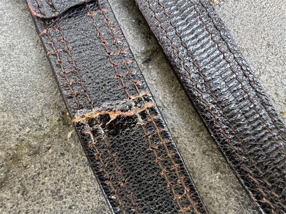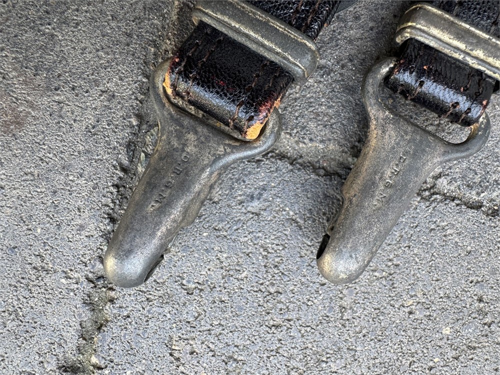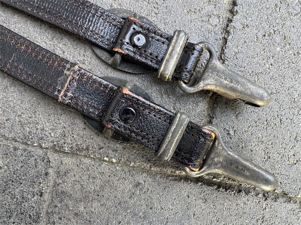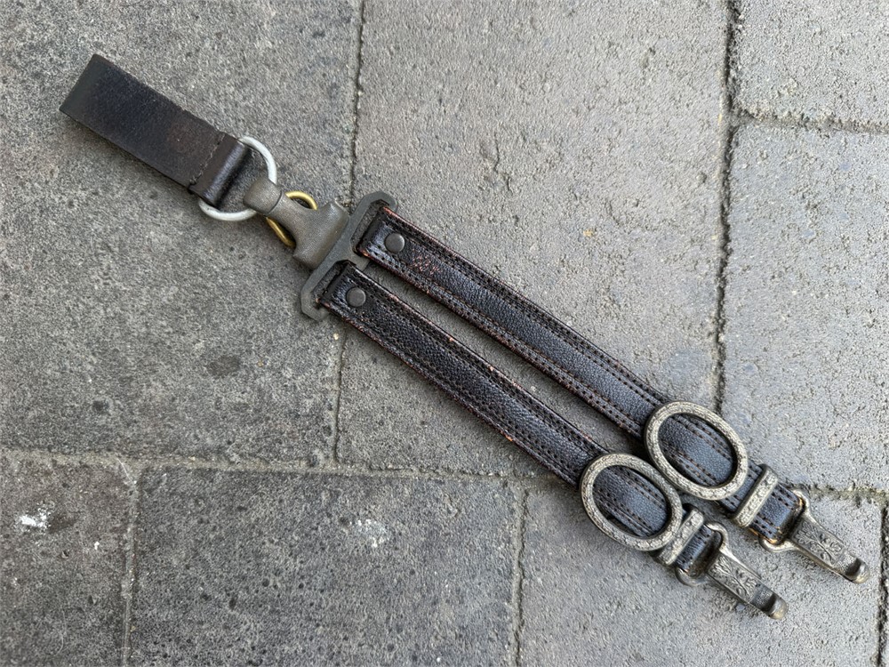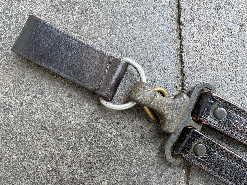Genuine set of hangers for an RLB 2nd model officer's dagger. All hardware is manufacturer marked with the correct RZM codes. Leather is strong. Please note: there are two cracks on the back of the hangers, but the cracks do not go through to the front. One could hang a dagger from this set of hangers with no negative result. ORIGINAL belt loop present. Also, there is a little loop of brass inside the hanger clip - not sure what it is used for, but it can be discarded if you wish.