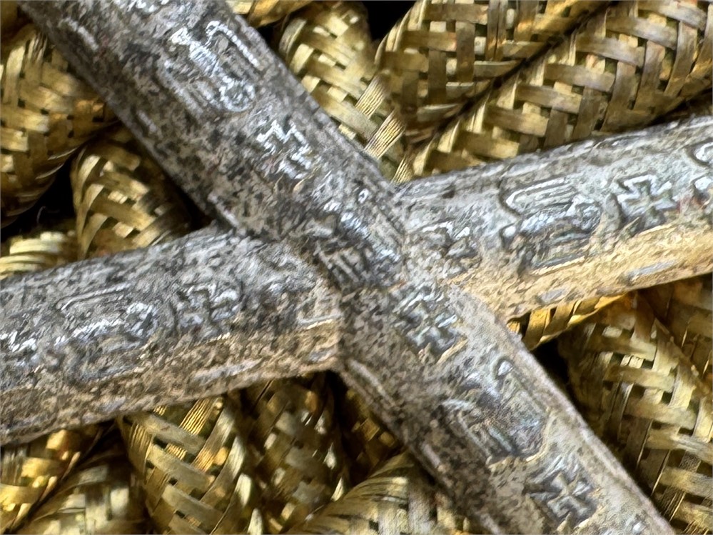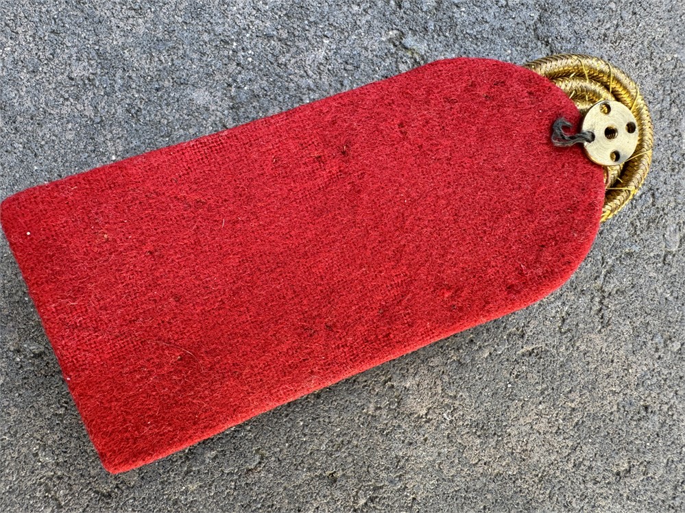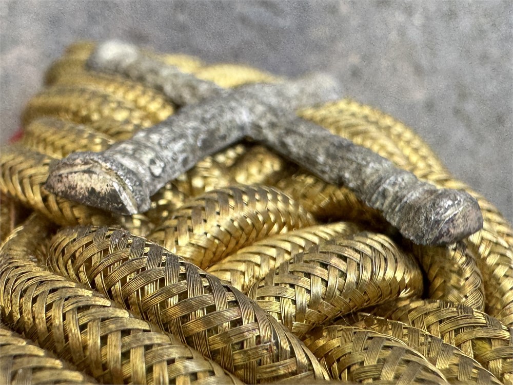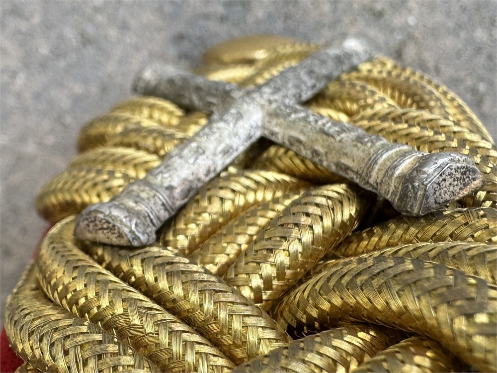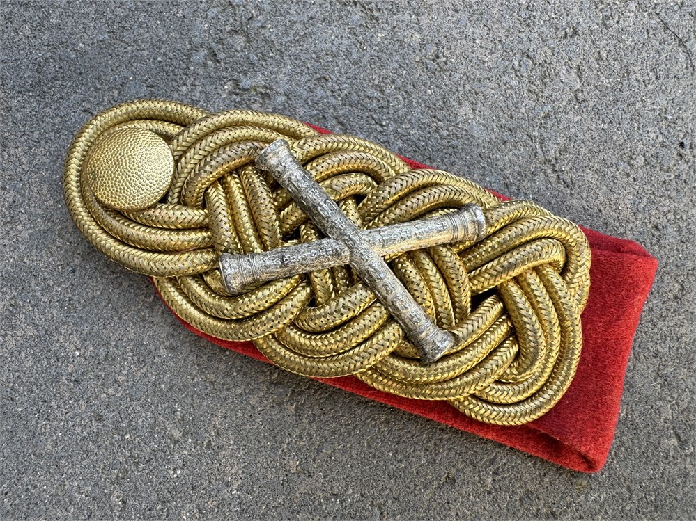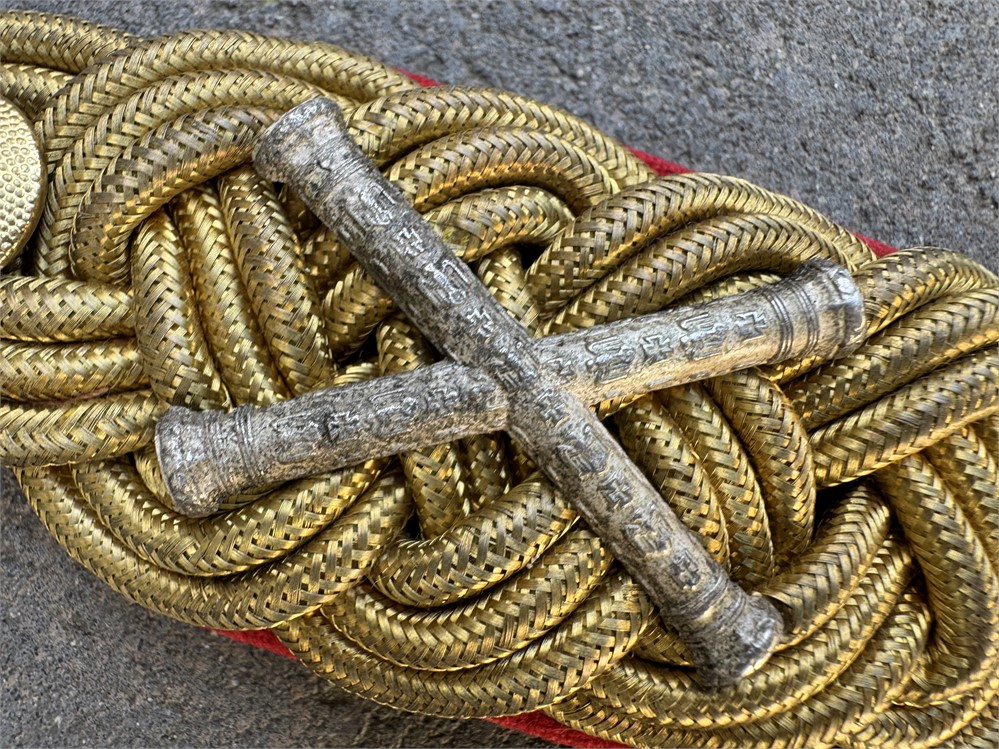 The later "2nd style" Field Marshall board. While many officers of this rank wore standard gold/silver braid boards, the gold-only board was instituted in 1941. These boards are hollow and precision die-stamped (not cast). Exquisite detail on the eagle/cross motif. Batons measure 47 mm from end to end, which is correct Based upon data observed by Mike Holverson of the Marshalls baton. Boards bullion shows good toning, with a slightly lighter appearance beneath the batons due to lack of exposure to light. Original button from the tunic is present, with one piece of thread through one of the holes (possibly uniform removed).