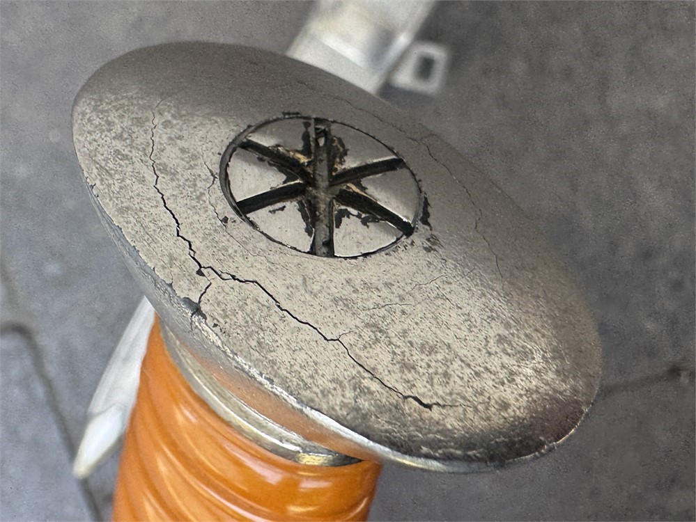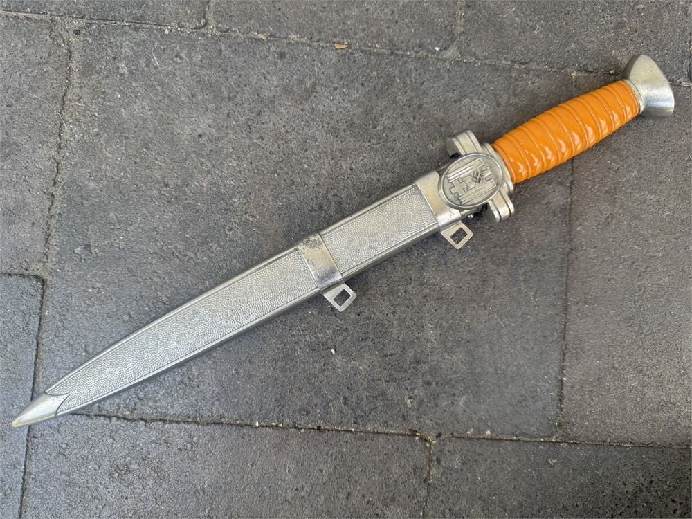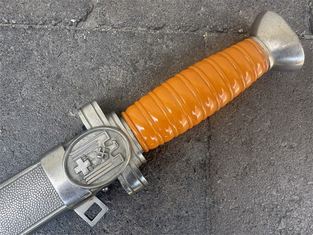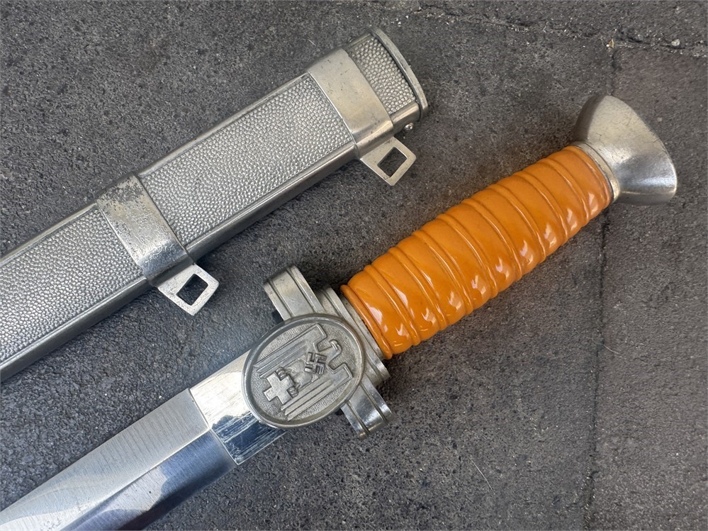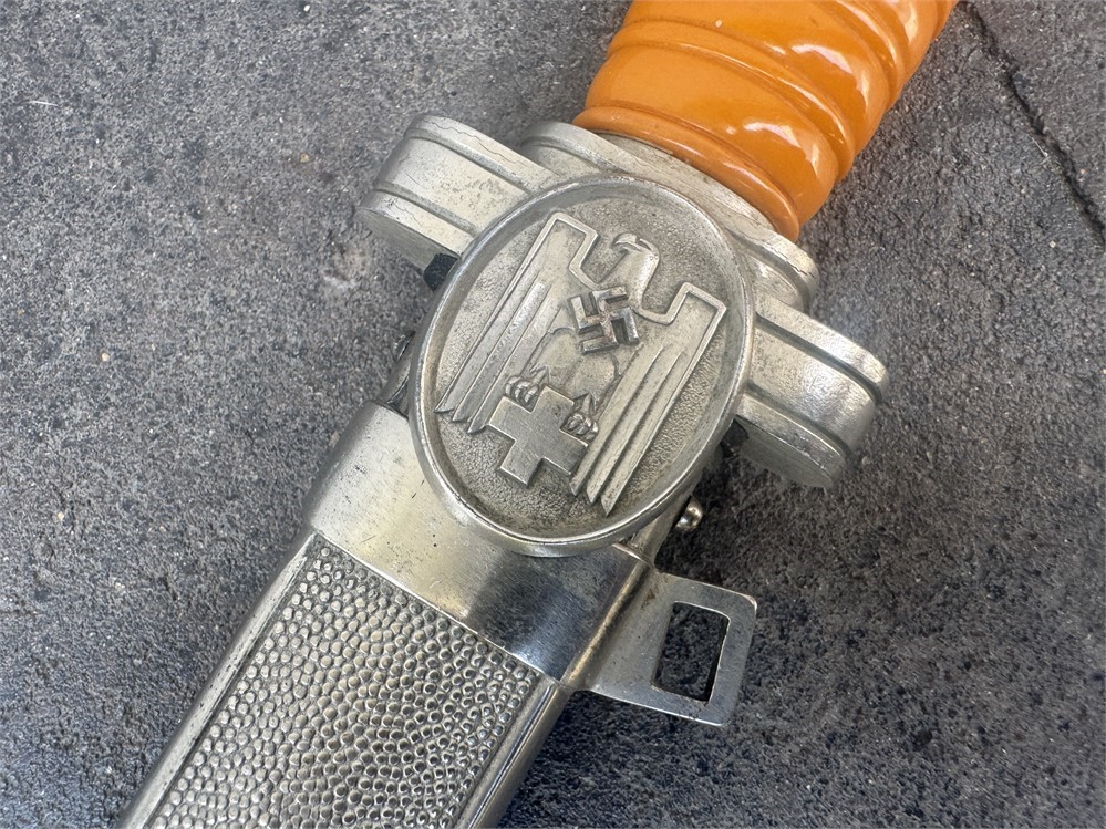 Dagger worn by the officer cadre of the German Red Cross. This is a very nice piece, displaying near flawless. Exterior has an even tone with only minor disruptions to the metal parts finish. Grip is deep orange and is perfect. The only detraction is some minor cracking on the face of the pommel, and minor rust to the cruciform screw cover. Blade is near perfect, with full factory finish. Blade grades 99%.