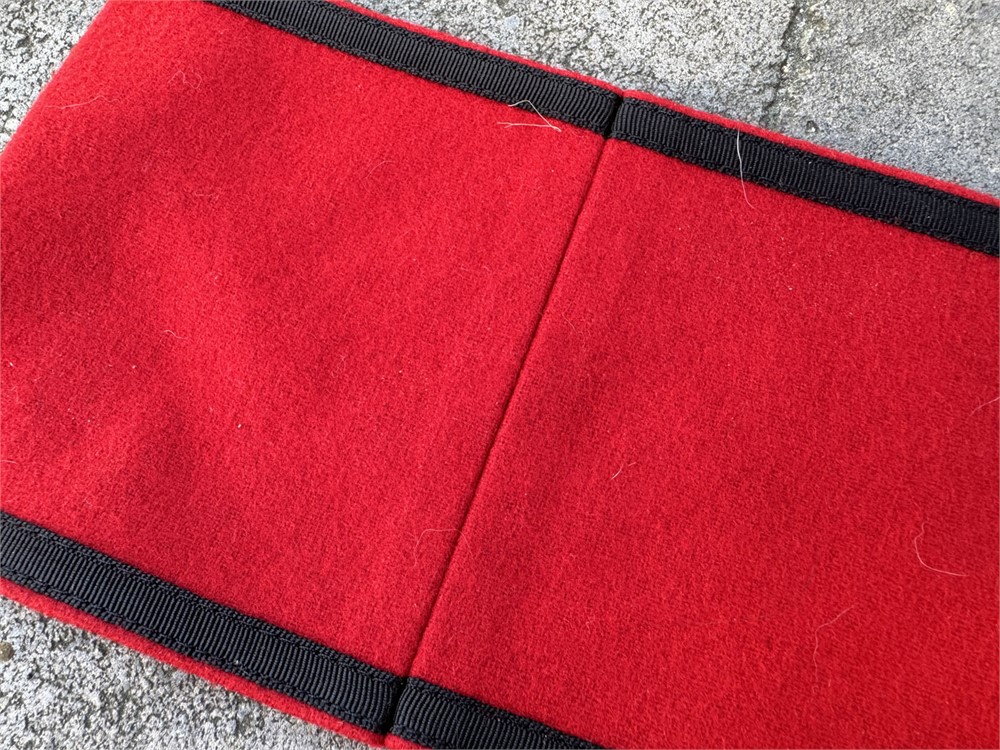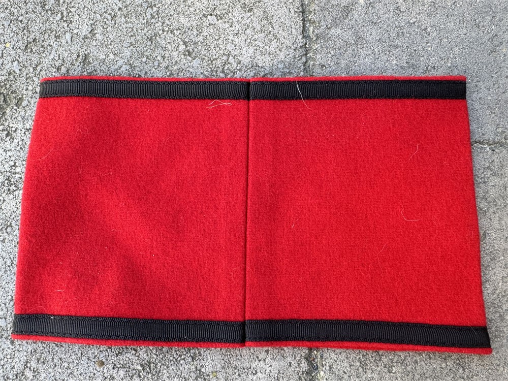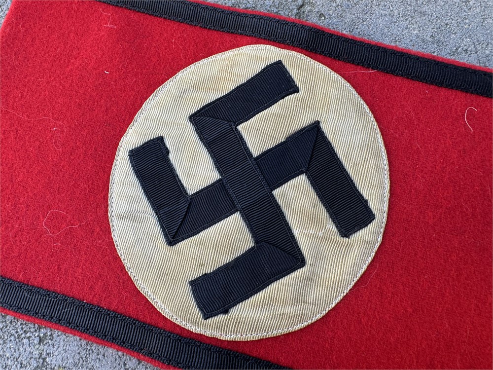 This is a Nazi Party armband featuring a black swastika centered on a white circular field, set against a red wool background with black nylon ribbon along the borders.  Swastika circle has a slightly oval shape, which is correct for most originals (not all).  No tag.  Wool is excellent with no mothing.