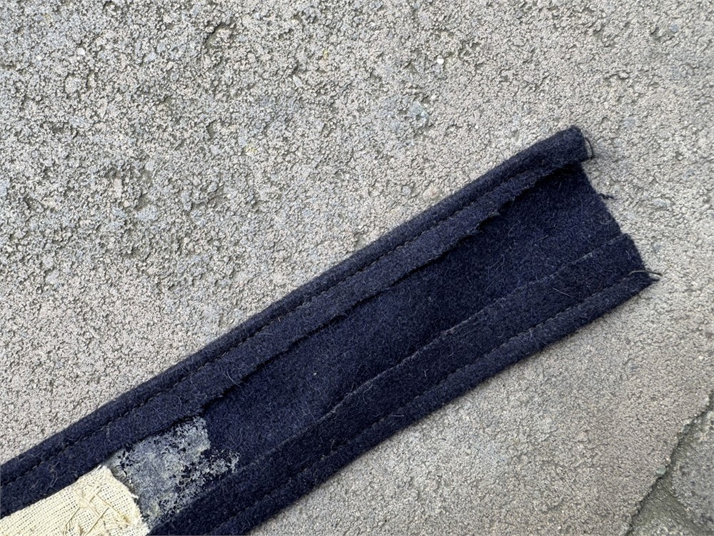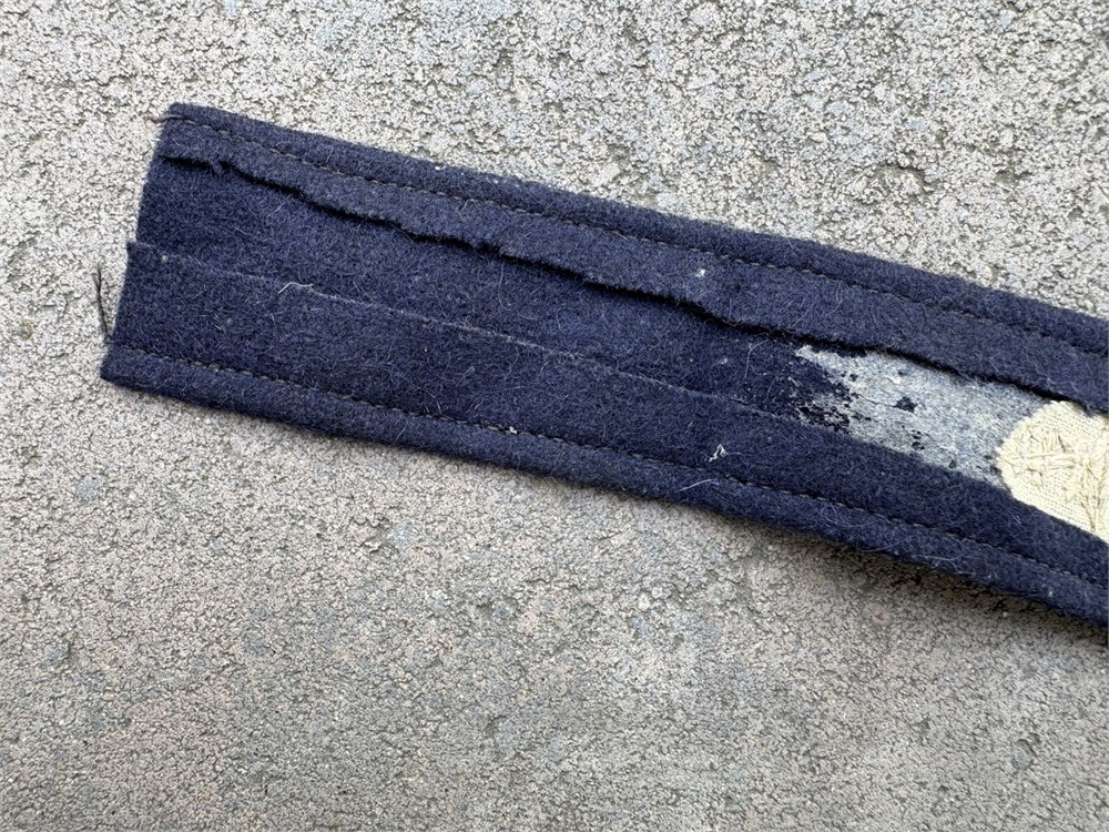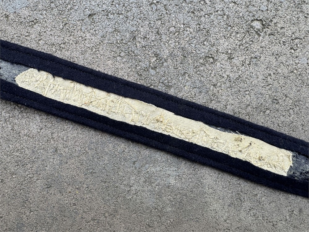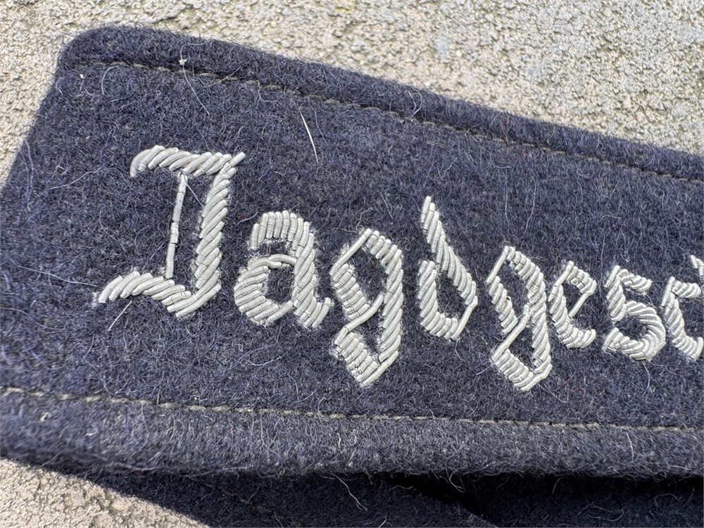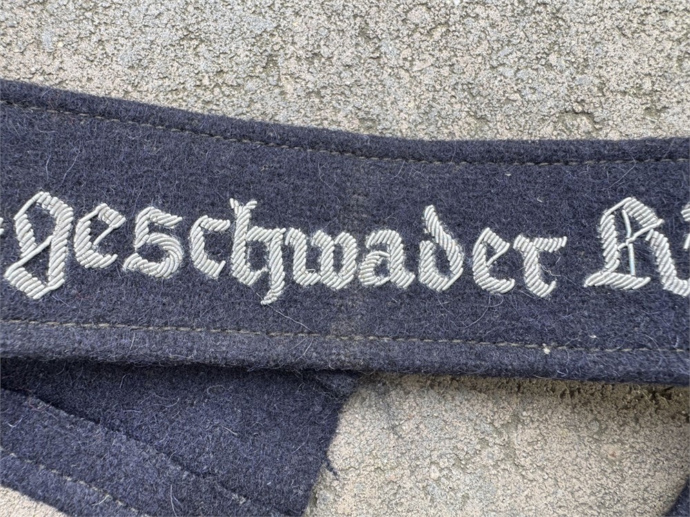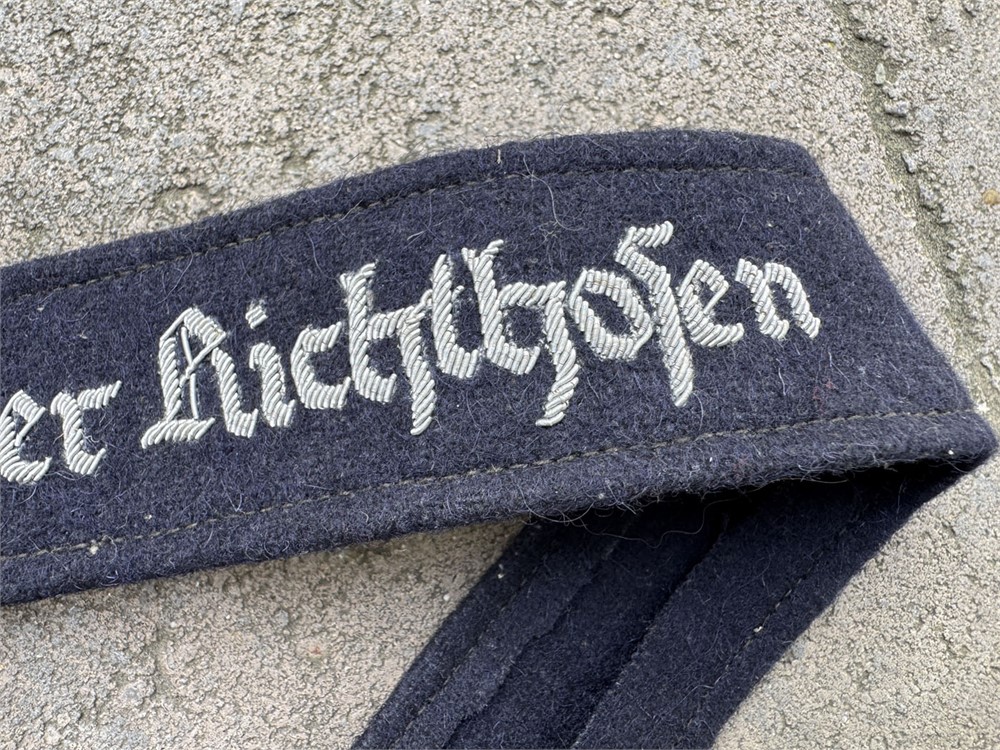 This is a Luftwaffe Jagdgeschwader Richthofen officer’s cuff title rendered in bullion embroidery. The cuff title features silver bullion wire embroidered Gothic script on a dark blue wool backing, This cuff title was worn by members of Jagdgeschwader 1 (JG 1), famously known as "Richthofen," named after the World War I ace Manfred von Richthofen.