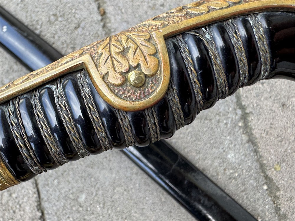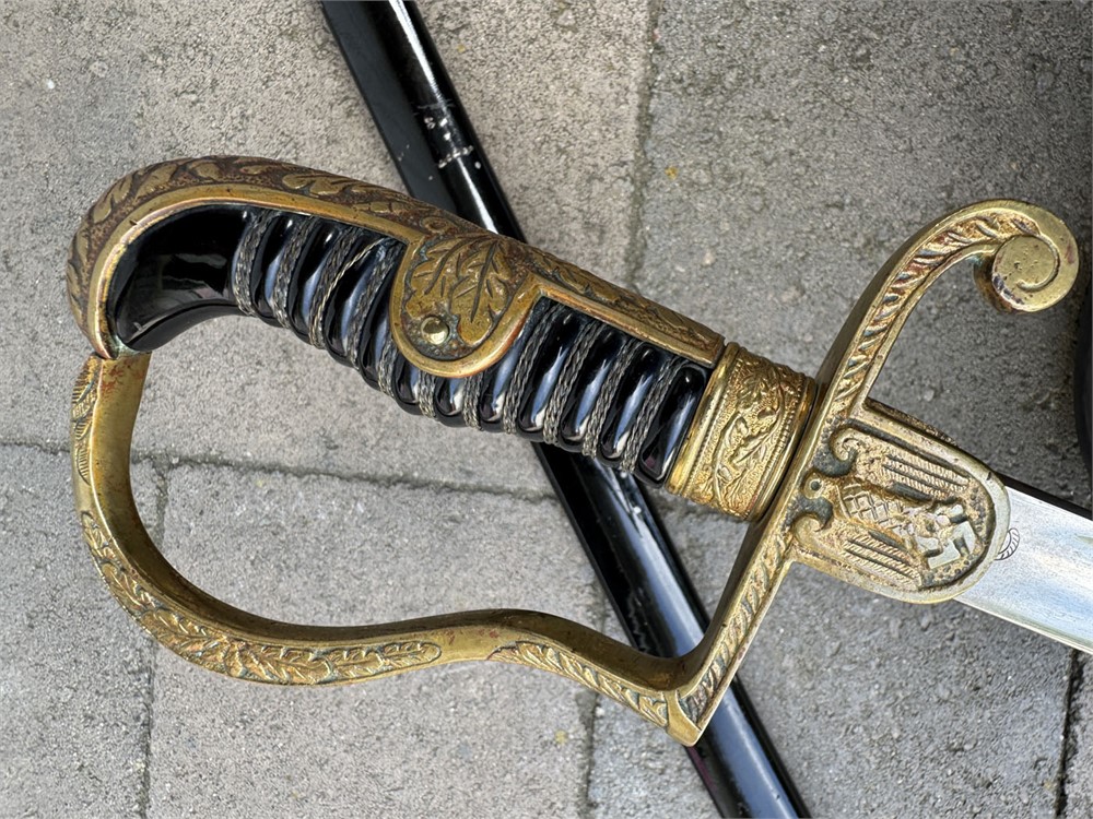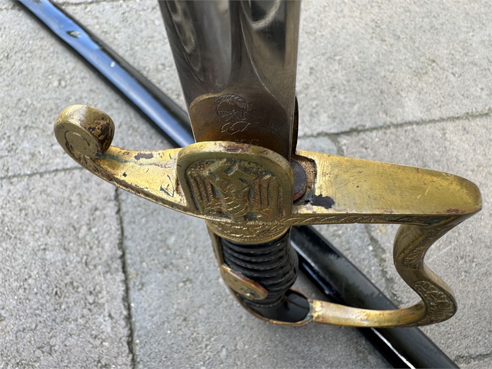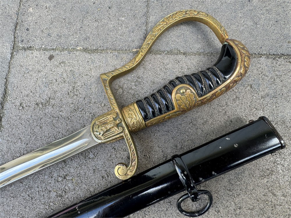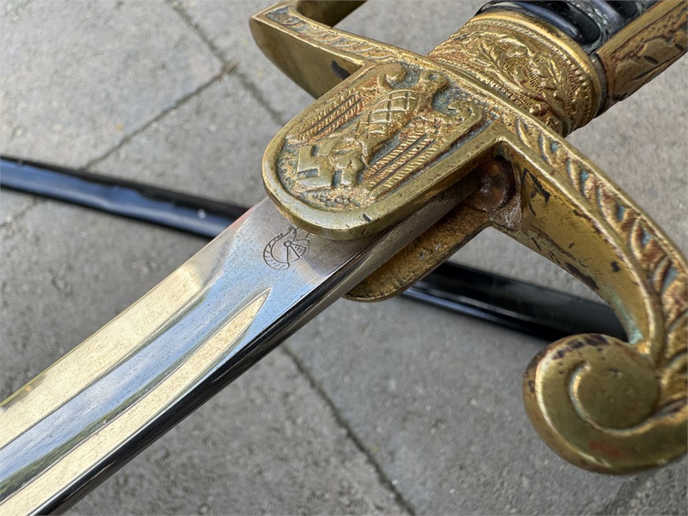 German Army sword used during the Third Reich era. The sword is a standard pattern officer's dress sword featuring a distinctive dovehead-shaped brass hilt. The grip is wrapped in black material with brass wire, typical of this model. The scabbard is black and metal, The sword bears the maker's mark of WKC, a well-known German sword manufacturer. Overall length is 41 inches. Scabbar d is straight with no dents, and ULTRA minor signs of age - paint grades 95% or better. Polished blade is near perfect. Heavy brass grip is nicely toned, and grip is perfect.