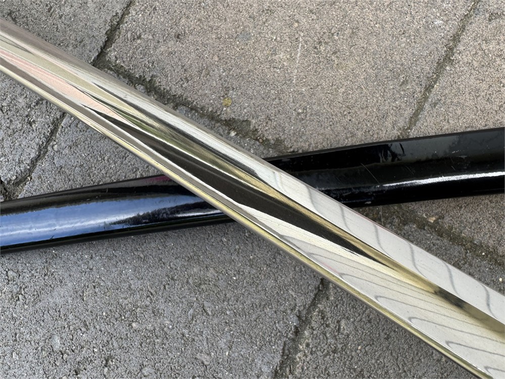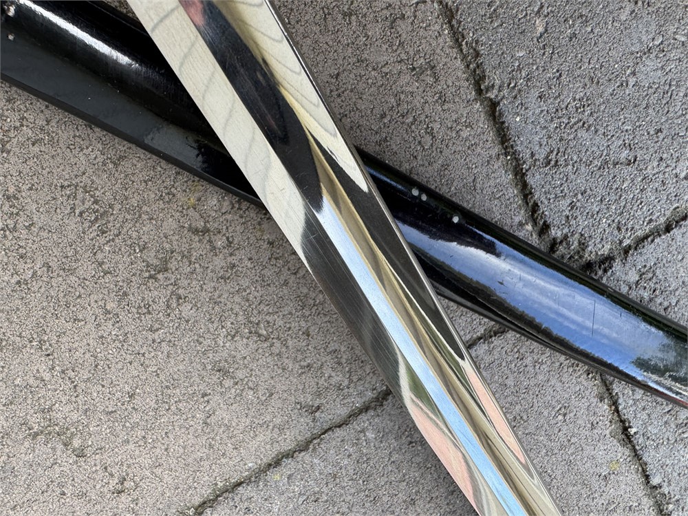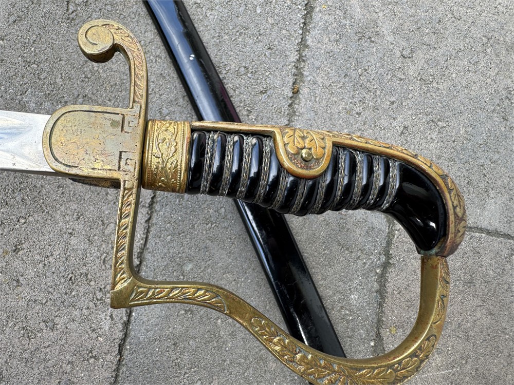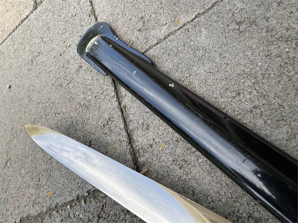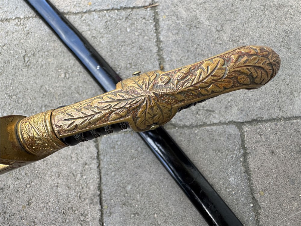 German Army sword used during the Third Reich era. The sword is a standard pattern officer's dress sword featuring a distinctive dovehead-shaped brass hilt. The grip is wrapped in black material with brass wire, typical of this model. The scabbard is black and metal, The sword bears the maker's mark of WKC, a well-known German sword manufacturer. Overall length is 41 inches. Scabbar d is straight with no dents, and ULTRA minor signs of age - paint grades 95% or better. Polished blade is near perfect. Heavy brass grip is nicely toned, and grip is perfect.