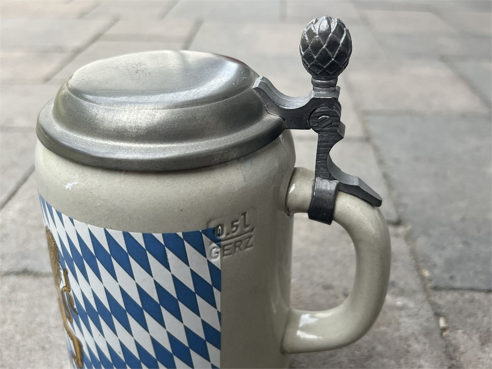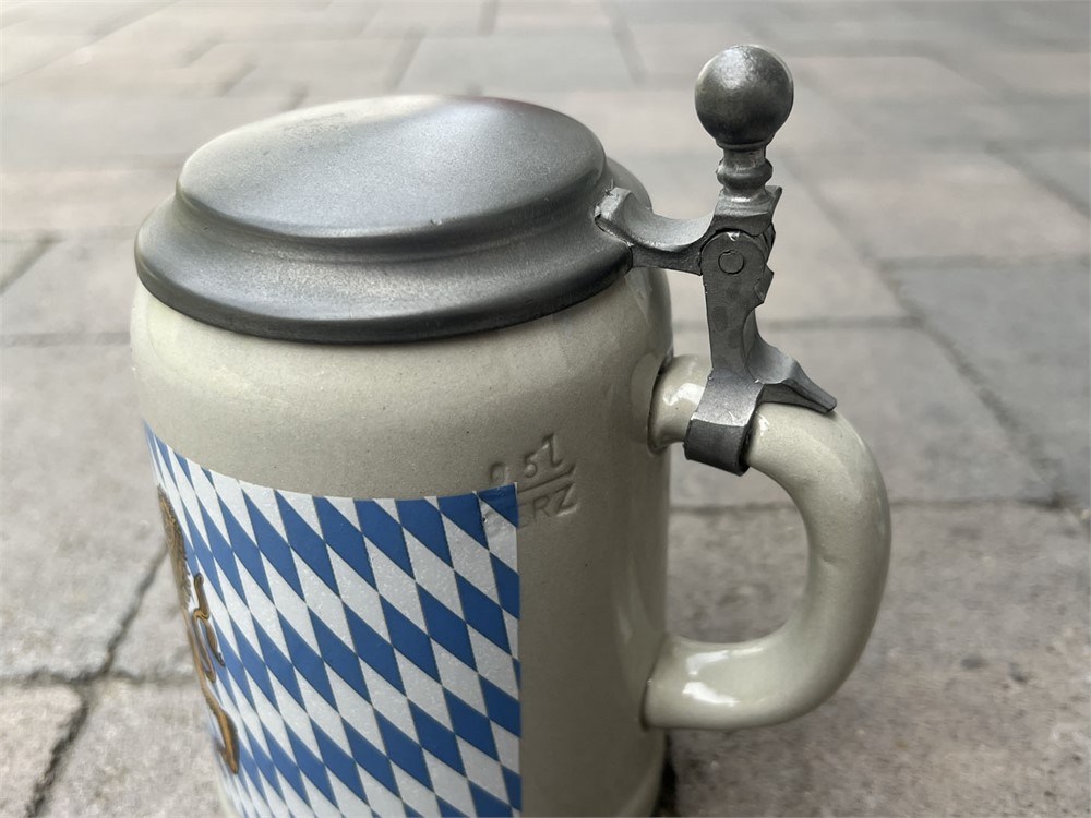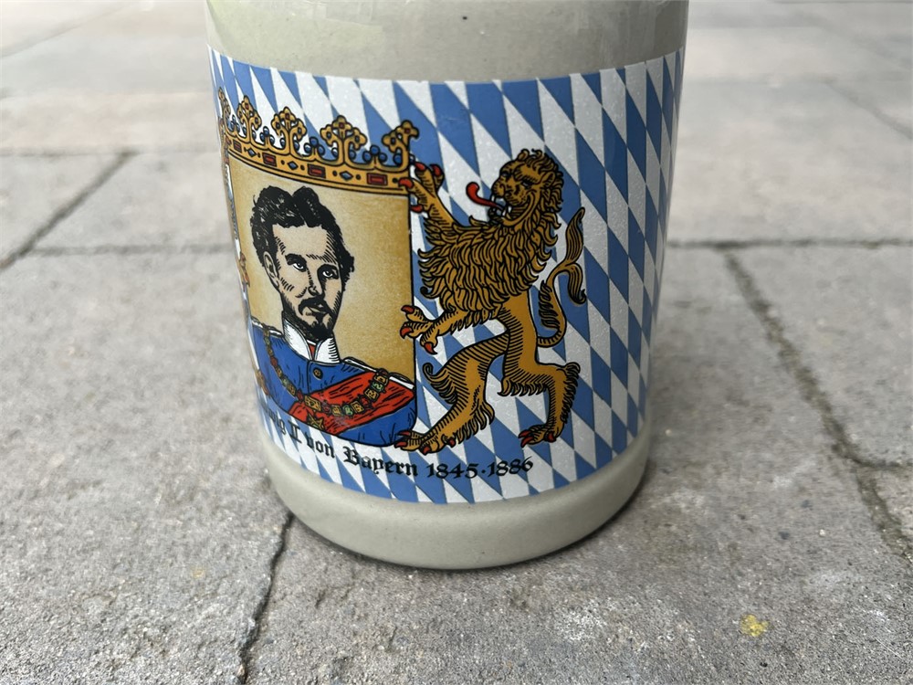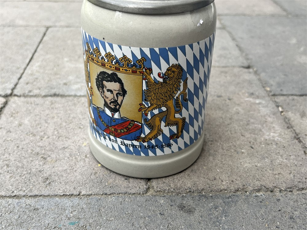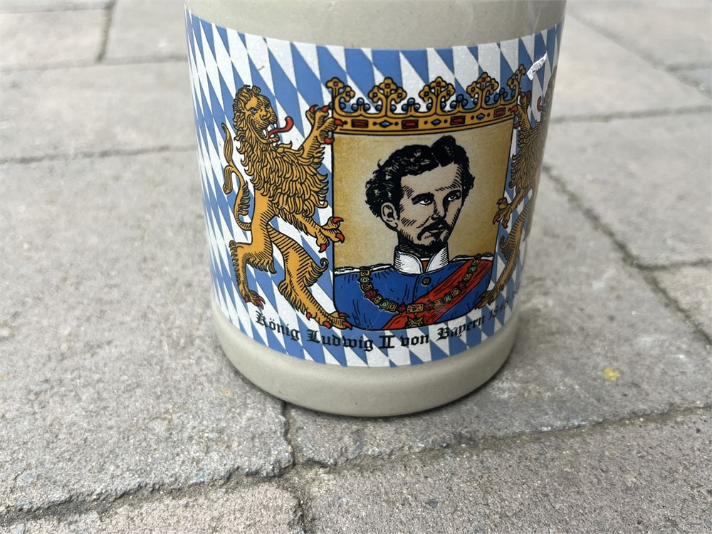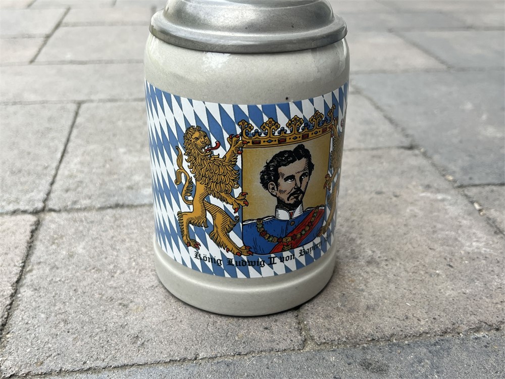 This is a pair of commemorative beer steins used in Bavaria, Germany. The steins feature portraits of King Ludwig II of Bavaria. Each stein displays the blue and white Bavarian lozenge pattern with crowned golden lions. They are traditional German stoneware with pewter lids. The steins were produced to honor King Ludwig II, a key historical figure in 19th-century Bavaria. Not sure of the vintage, but based upon materials they appear to be interwar (WW1 and WW2) construction. Ludwig II was the "mad king" for his extravagant spending.