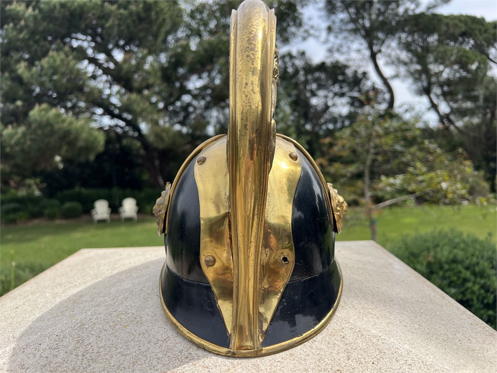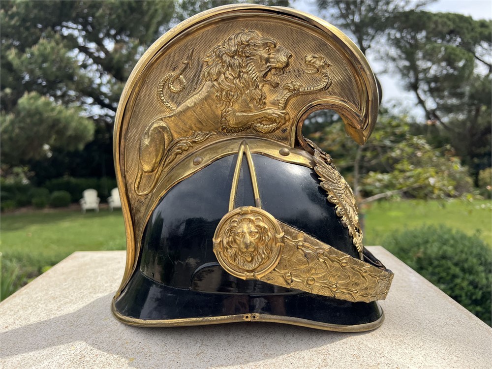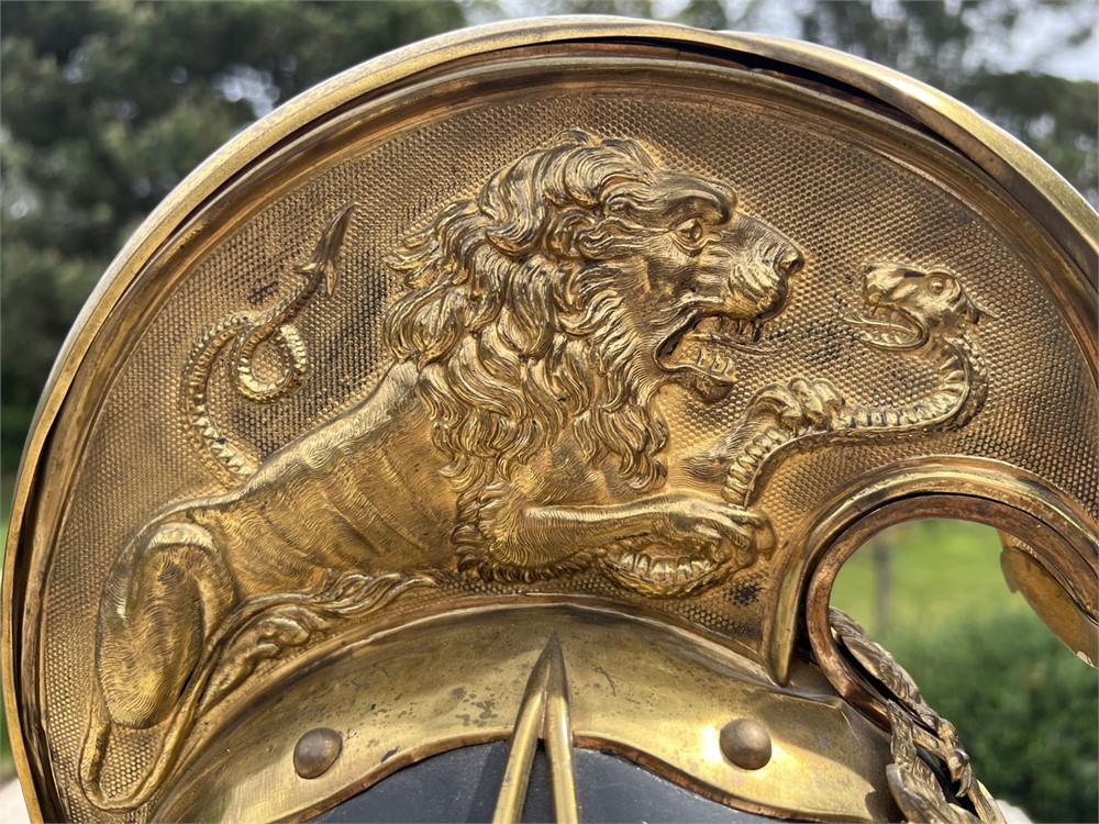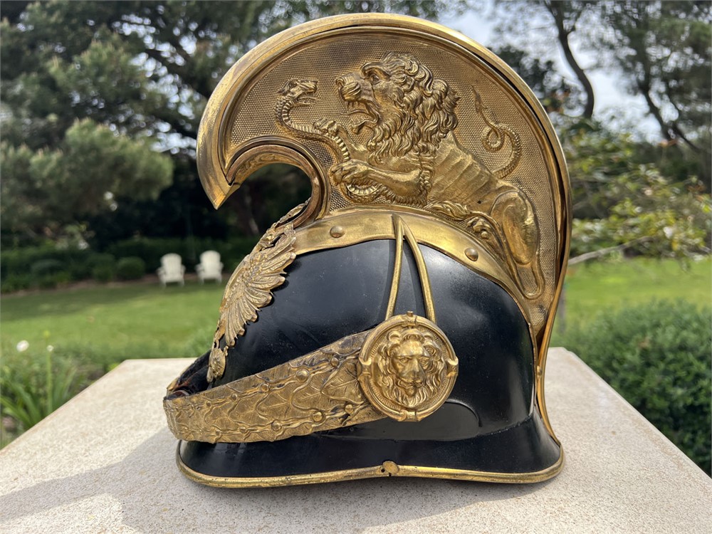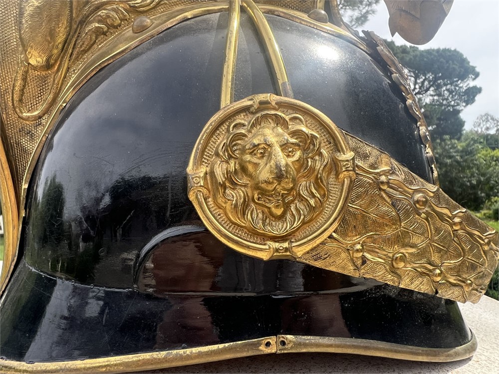 Fine quality specimen with a leather body and gilt brass fittings throughout. Condition is outstanding, with only minor age apparent. Helmet could date from the late 1860s through the turn of the century (1900). The stunning lion motif on the crown comb is highly sought after by collectors.