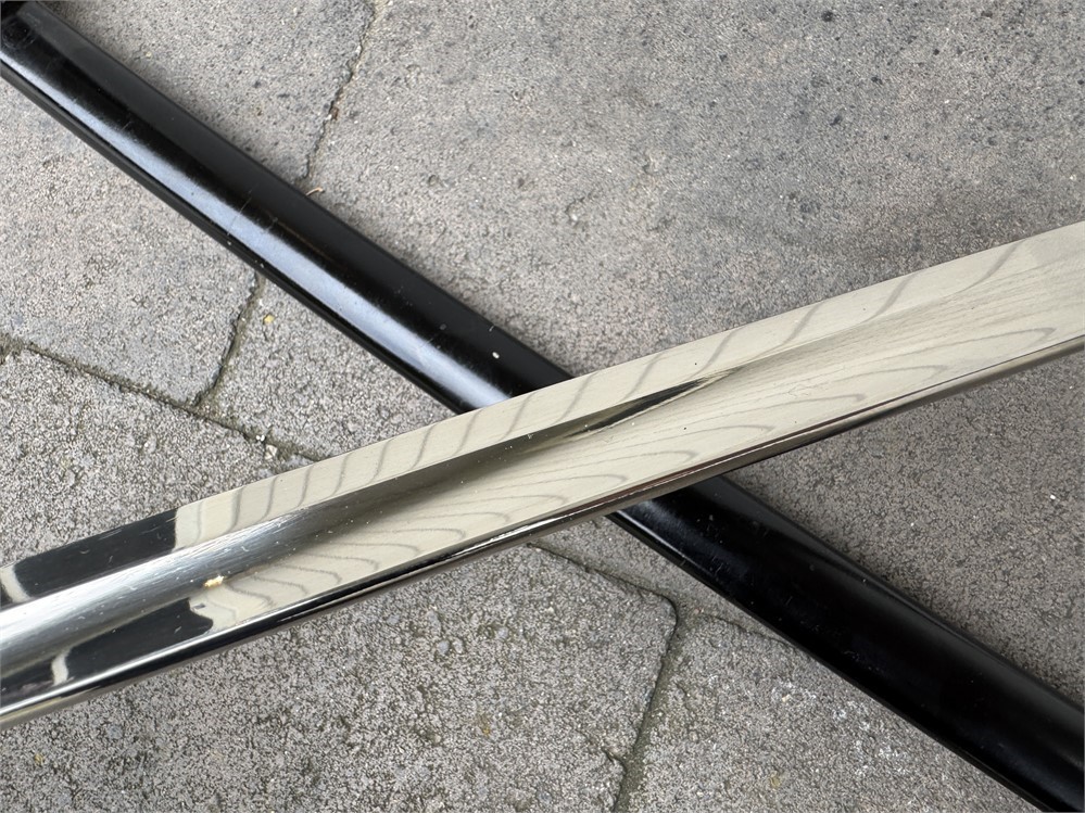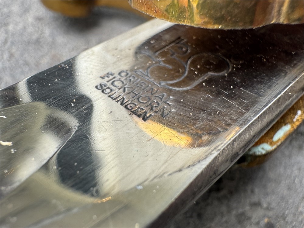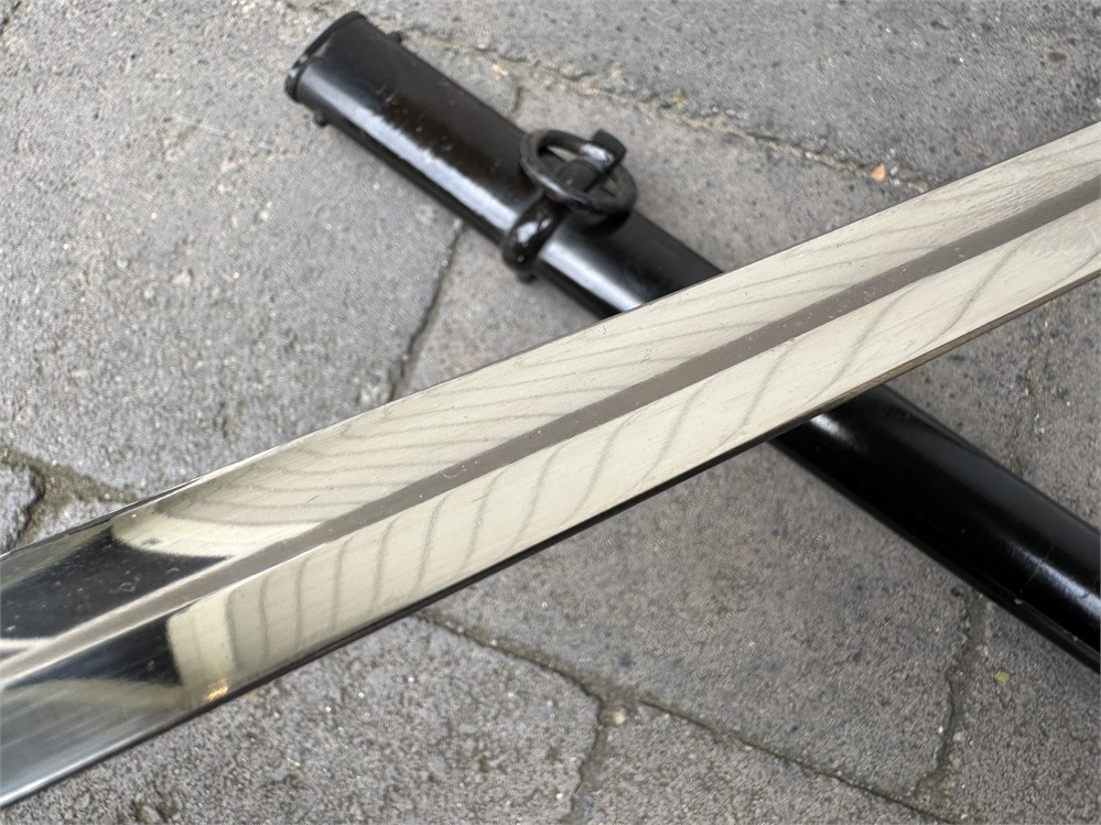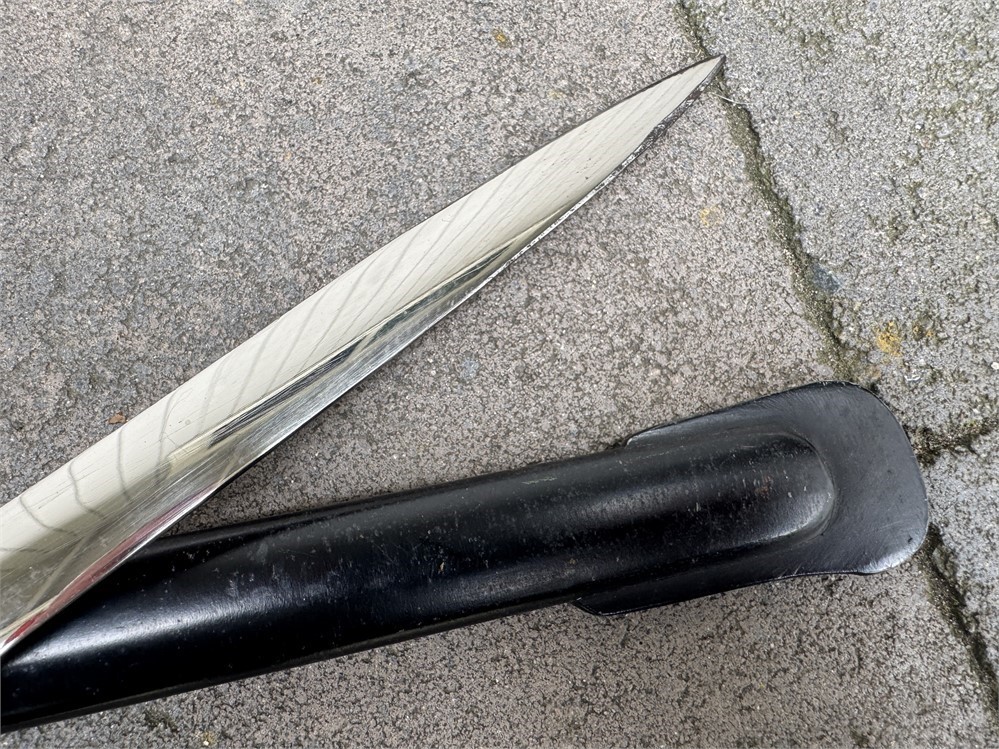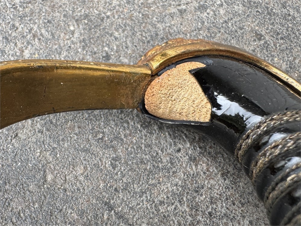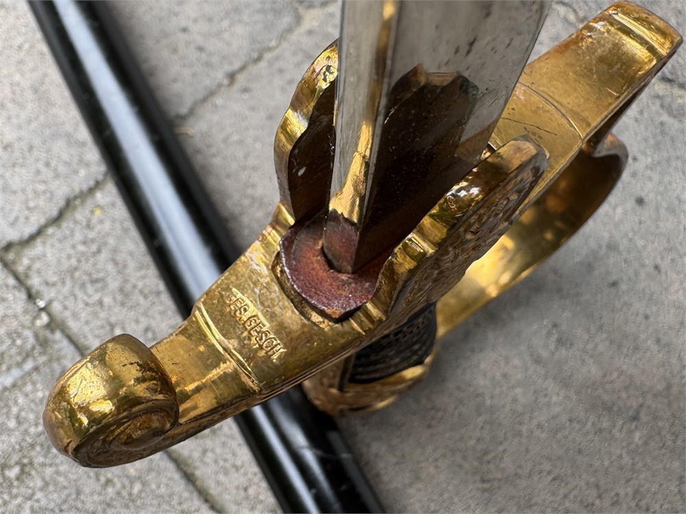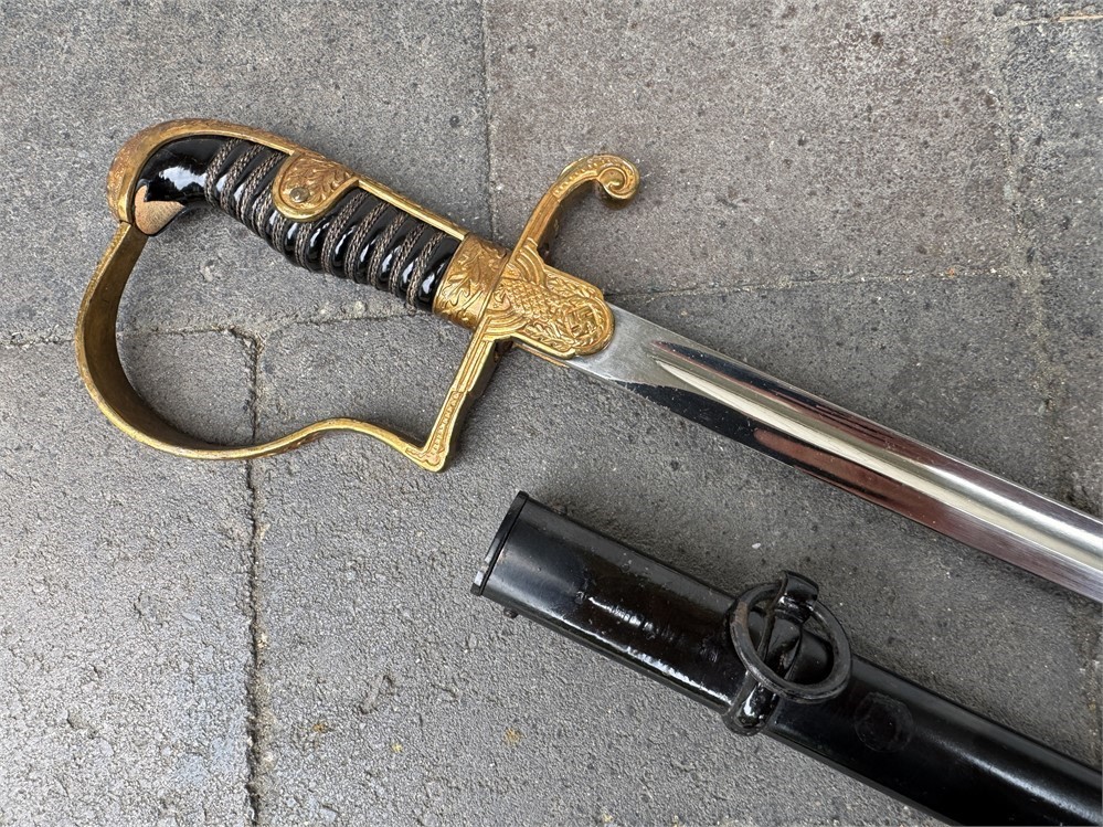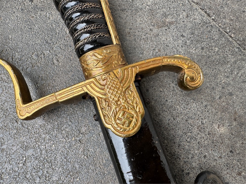 Well preserved 'Field Marshall" series sword. This is the "Wrangal" Pattern, which is denoted by the left-facing eagle head. Overall length of the sword is 35 inches. Hilt is very heavy brass, and retains more than 90% of the fire gold finish. Scabbard features nearly 100% paint, with only light aging. NO dents whatsoever, or rust. Blade is near flawless, with only very light age. no chips, loss to the plated finish, or other damage. Buffer pad is present. The only damage to this sword is a small piece of the plastic covering missing from the handle ... see photos. Paint it black and you will hardly notice! Each of these sword patterns was named after an army general. Friedrich Heinrich Ernst Graf von Wrangel was a Generalfeldmarschall of the Prussian Army.