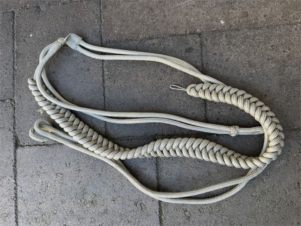 Original Third Reich Luftwaffe officer’s aiguillette, a formal insignia worn exclusively by officers serving as adjutants or on senior command and ceremonial staffs. Constructed of intertwined silver aluminum cords with correct weighted metal tips, this aiguillette was worn on the right shoulder of the Dienstrock or parade tunic to denote a special staff appointment rather than rank. Near flawless condition.