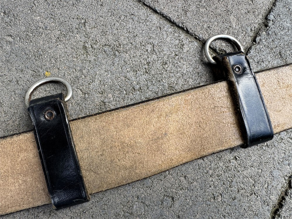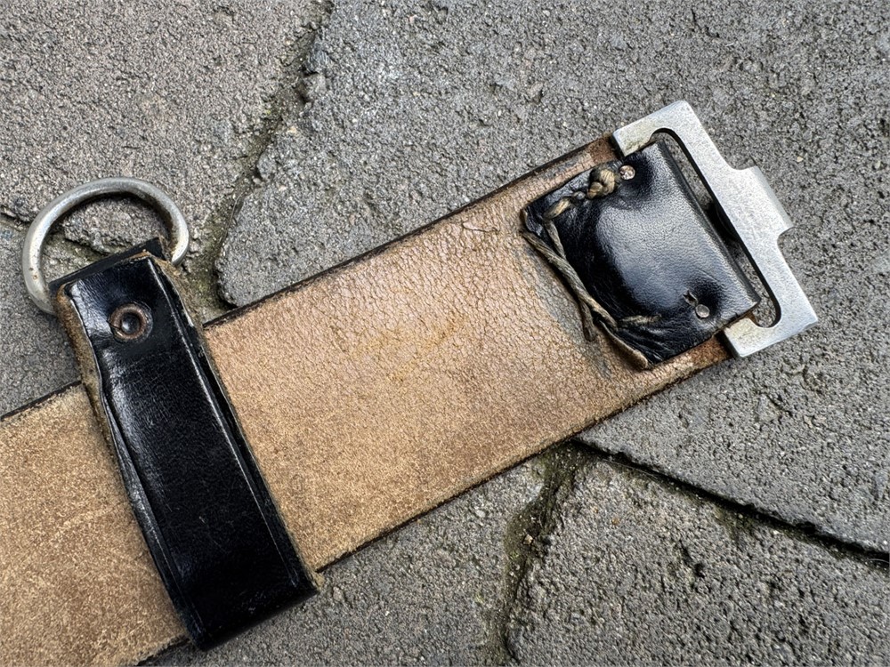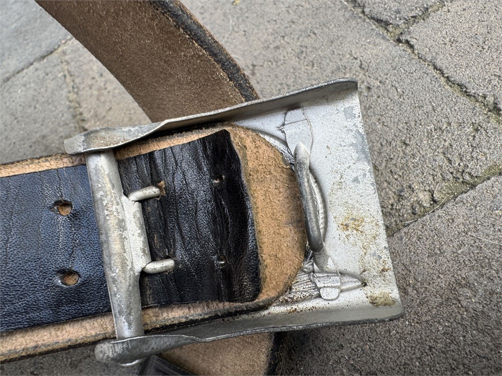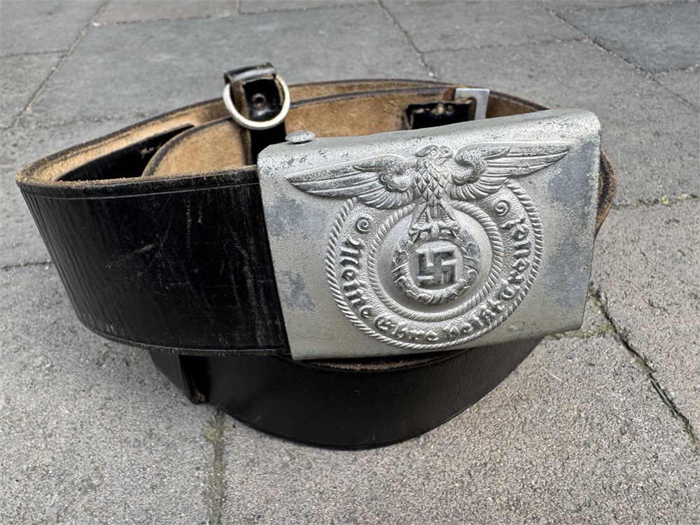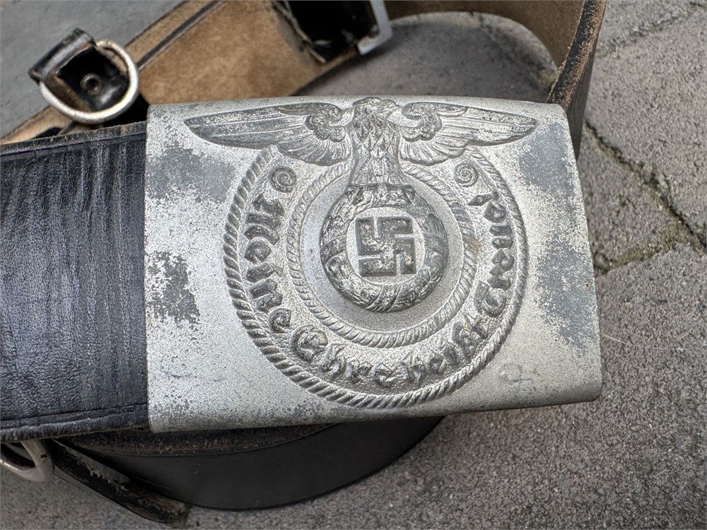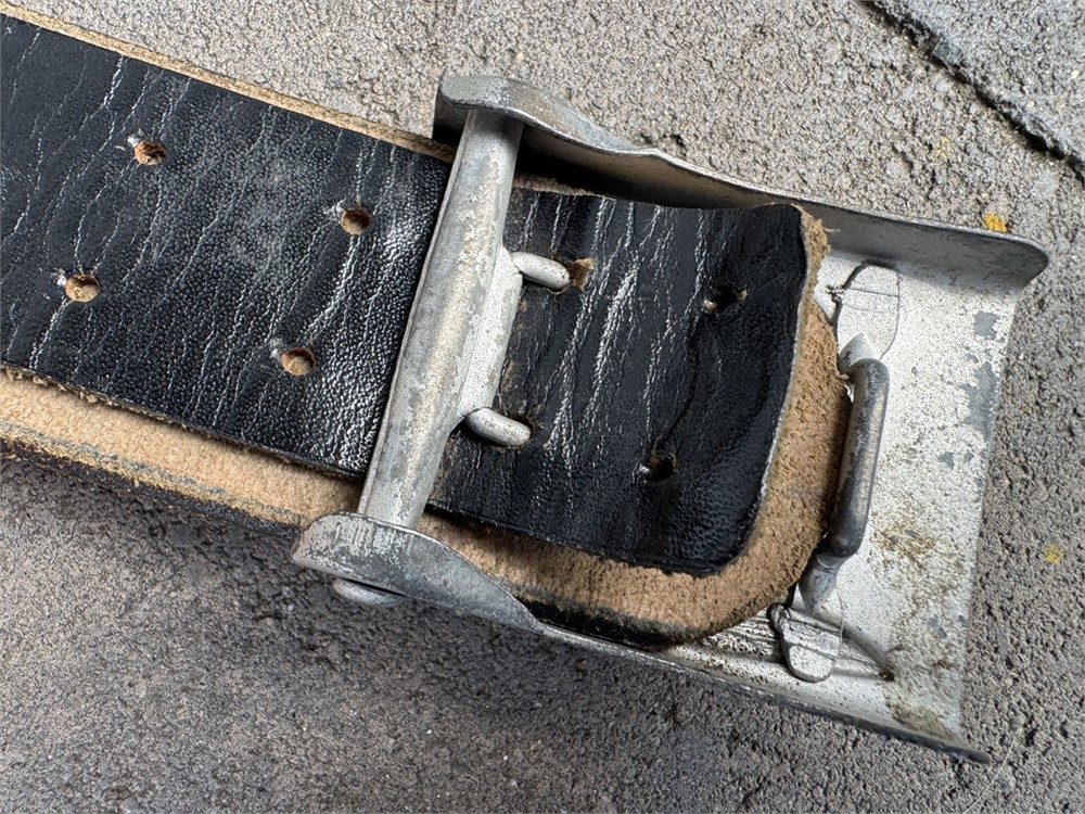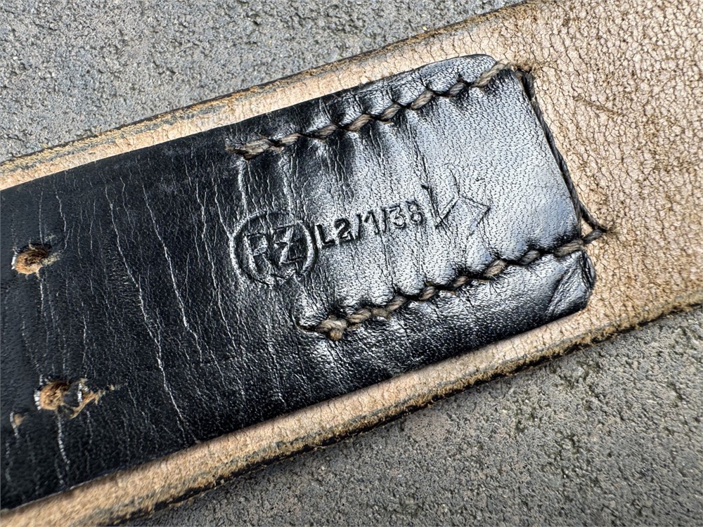 Very high quality specimen, consisting of steel belt with 95% of the white "silver frosted finish" remaining. Belt is correctly scribed on the obverse. Reverse is marked RZM L2/1/38 with the "tri-armed swastika." Belts like this are often SS marked, but are often not marked. Length is approximately 36 inches. Two cross-strap loops are present. Tri-armed swastika marking is a manufacturer trademark. This belt and buckle set is ready for the finest quality uniform ensemble.