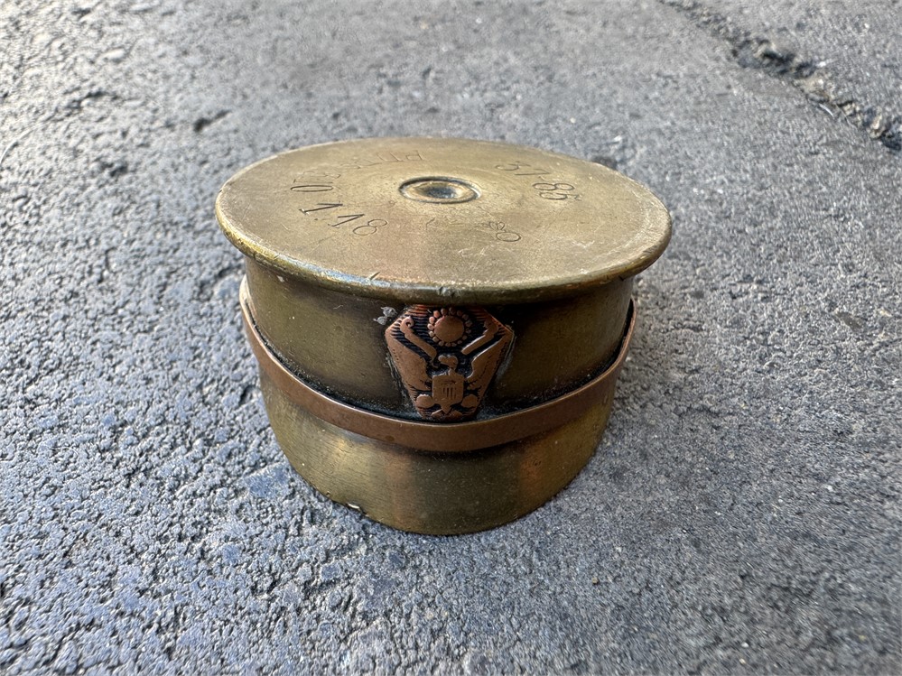 Very unique set of 5 pieces of trench art, from various sources and periods. These are fine quality. Consists of three "hats" and two lighters. Unique display items, who knows the true value!