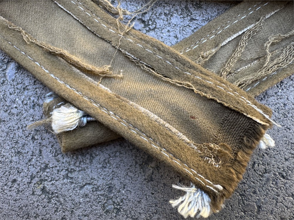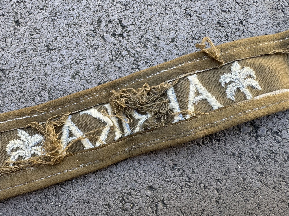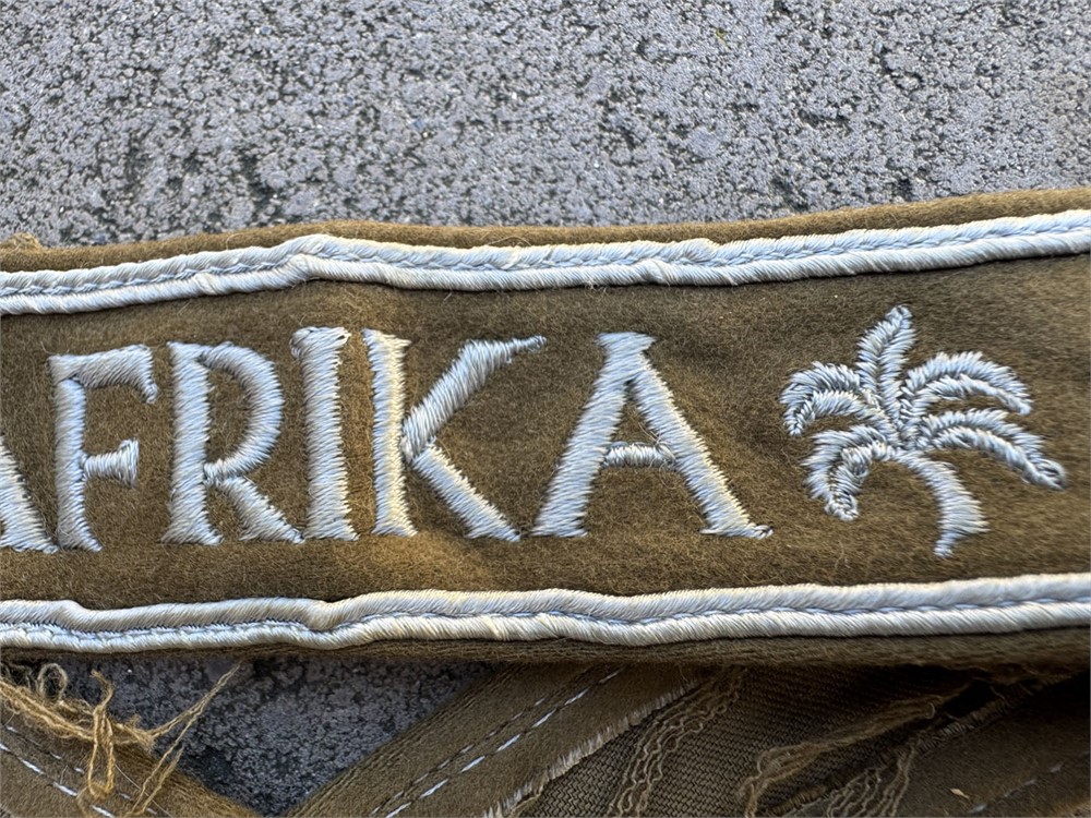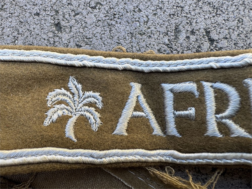 This is a World War II German Afrika Korps cuff title. It features the embroidered word "AFRIKA" flanked by palm tree motifs, stitched in white thread on a field-gray or brownish wool band with white piping along the edges. Worn by members of the Wehrmacht who took part in the North Africa campaign from 1941 to 1943, commanded by General Erwin Rommel. Fine quality full length specimen, textbook construction.