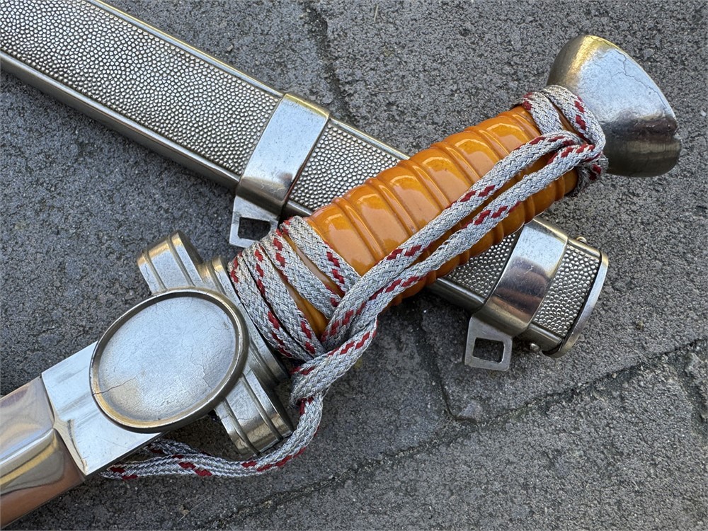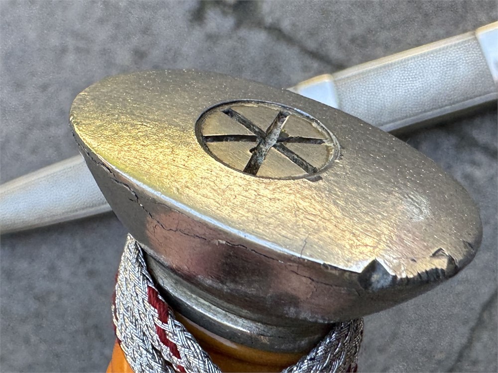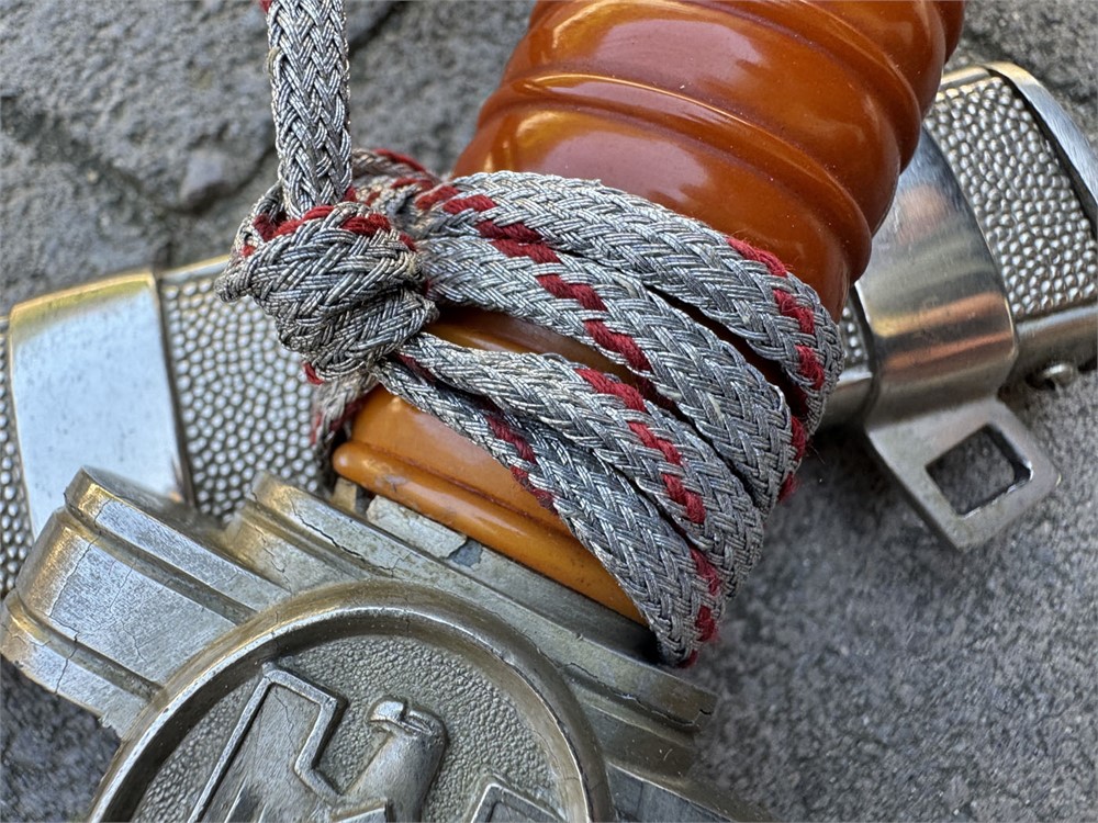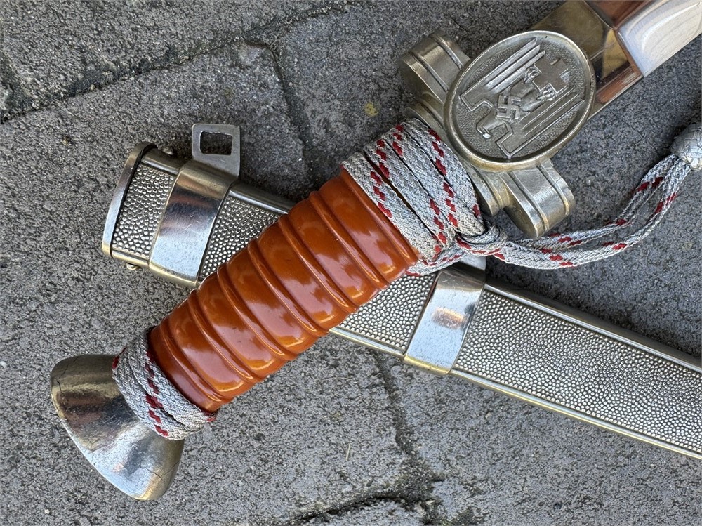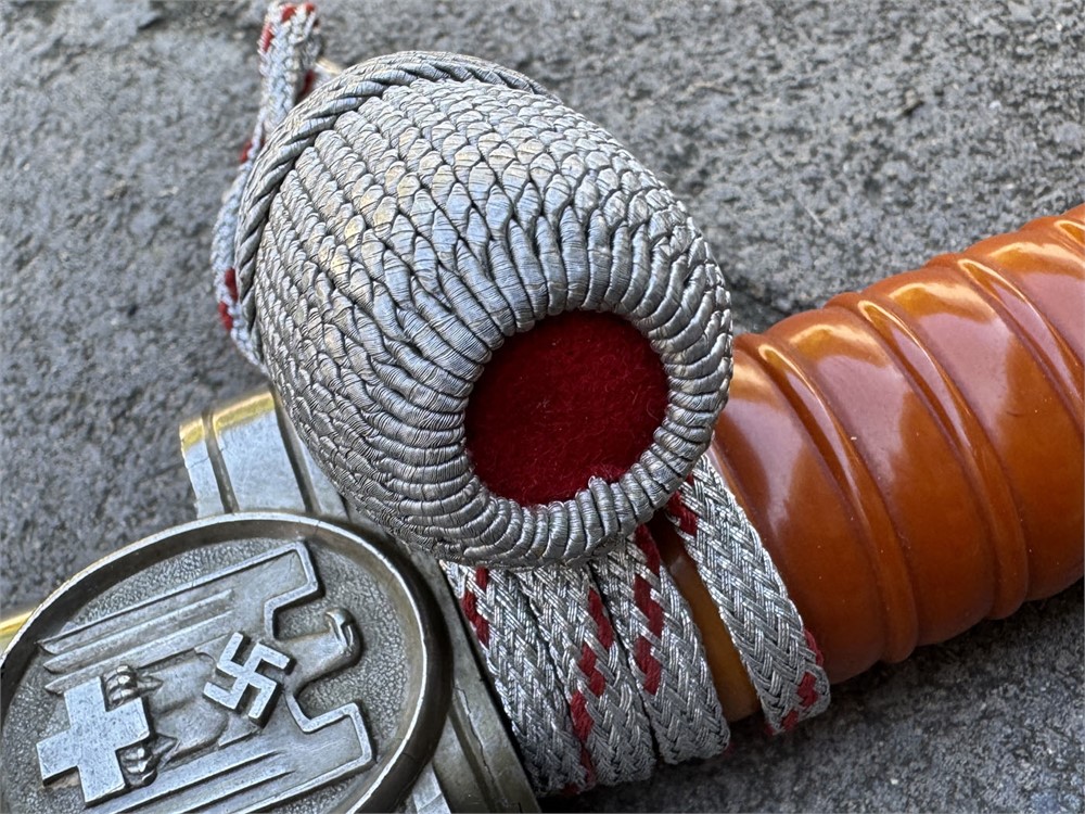 Nazi Red Cross Officer's Dagger, a ceremonial edged weapon issued to officers of the German Red Cross during the Third Reich. It features a polished steel blade with a distinctive tapered point and a textured metal scabbard. Grip is flawless with slightly lighter color underneath the knot. Obverse pommel design is perfect. Reverse is nearly flawless, with two microscopic breaks to the finish (not cracks in the metal). Blade is literally perfect with 100% factory grain and no rust or damage. Scabbard is perfect. Knot is an ORIGINAL Red Cross Officer's knot in nearly mint condition. It's been there since it's service time, noted by the slightly lighter color on the grip. These daggers were introduced in the 1930s and worn by Red Cross officers as a symbol of their rank and service within the organization.