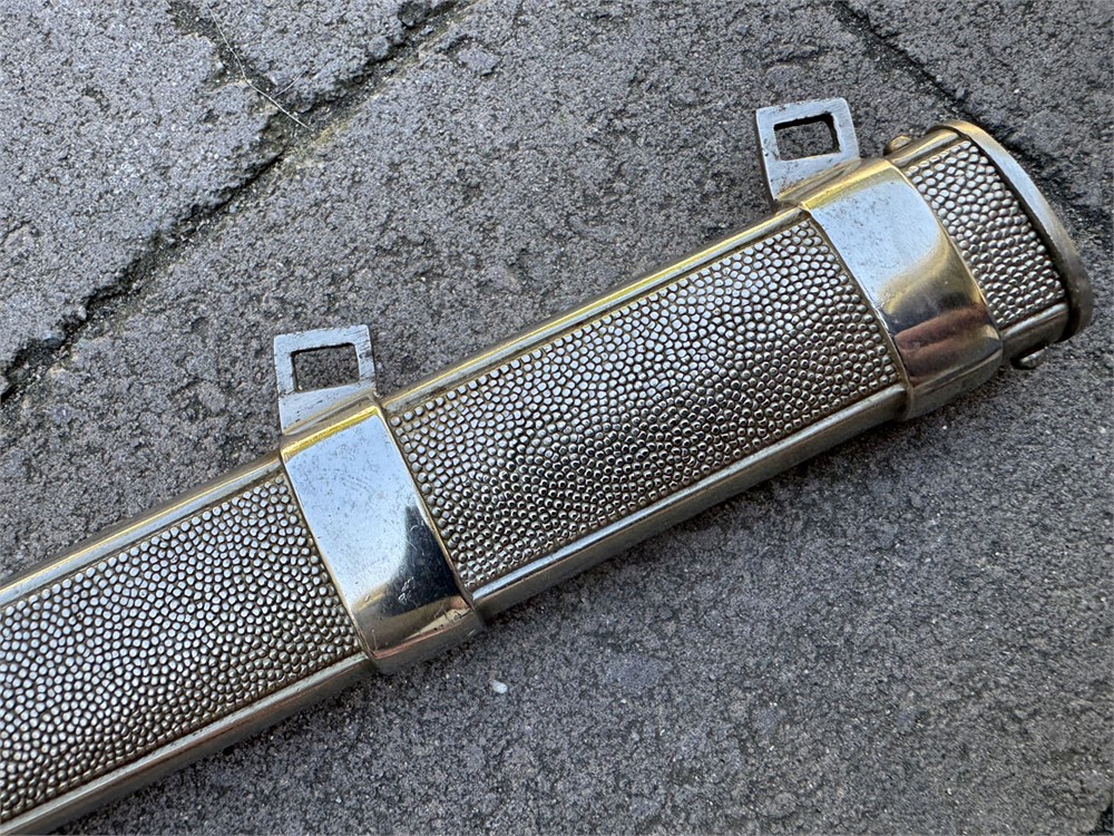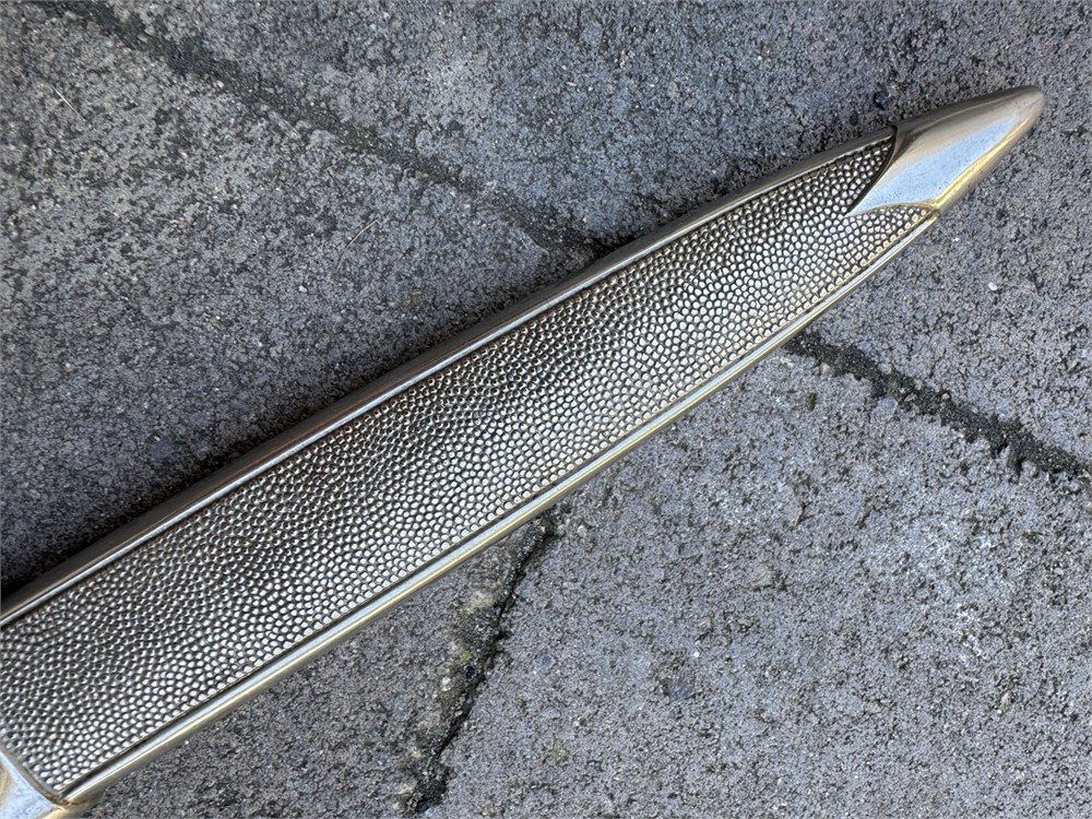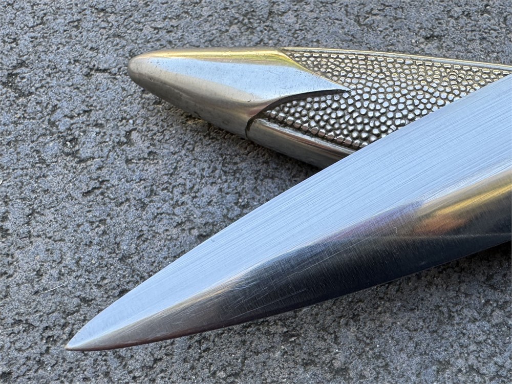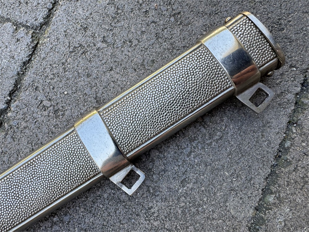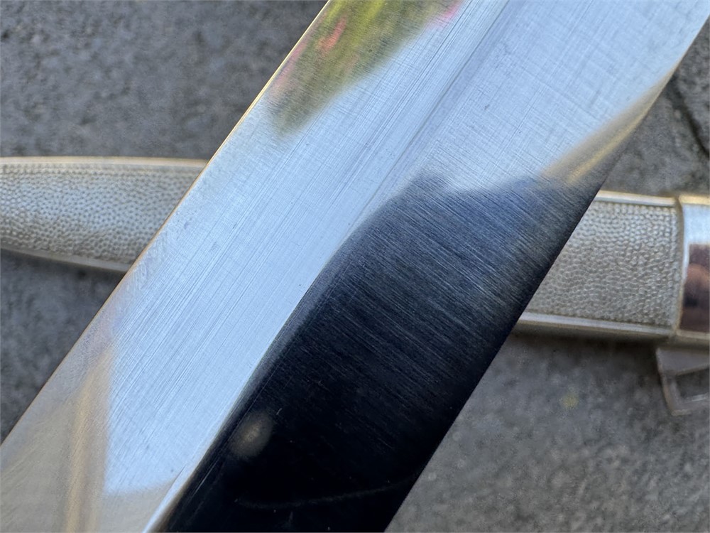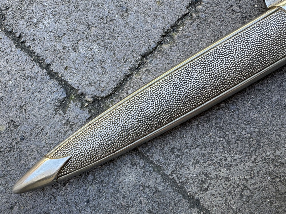 Nazi Red Cross Officer's Dagger, a ceremonial edged weapon issued to officers of the German Red Cross during the Third Reich. It features a polished steel blade with a distinctive tapered point and a textured metal scabbard. Grip is flawless with slightly lighter color underneath the knot. Obverse pommel design is perfect. Reverse is nearly flawless, with two microscopic breaks to the finish (not cracks in the metal). Blade is literally perfect with 100% factory grain and no rust or damage. Scabbard is perfect. Knot is an ORIGINAL Red Cross Officer's knot in nearly mint condition. It's been there since it's service time, noted by the slightly lighter color on the grip. These daggers were introduced in the 1930s and worn by Red Cross officers as a symbol of their rank and service within the organization.