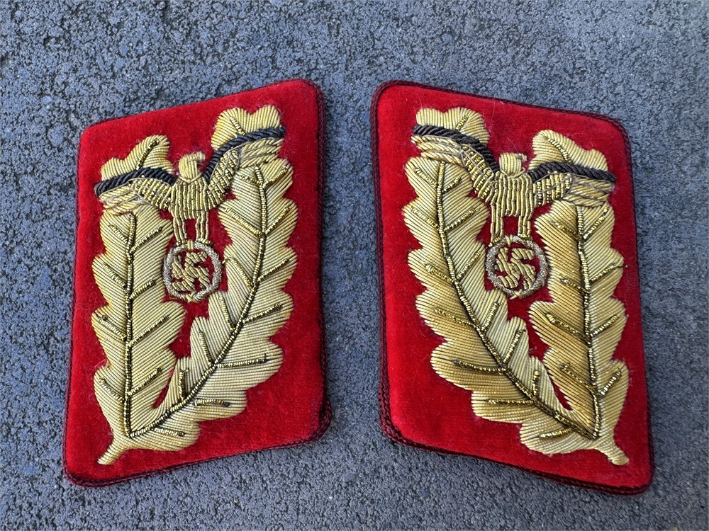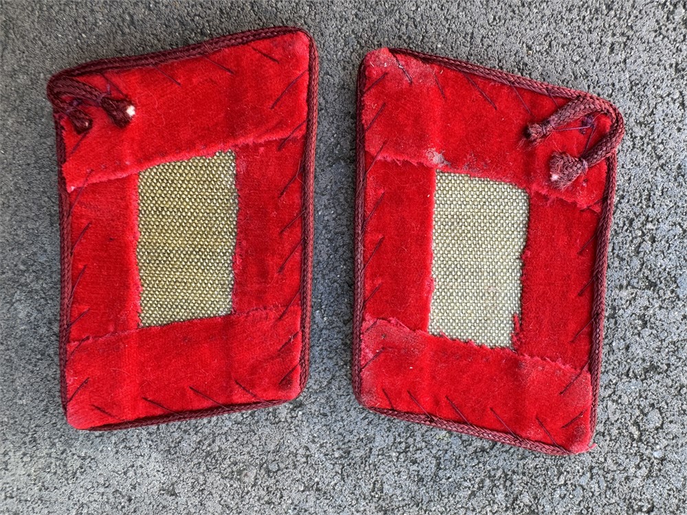These were sent into me as original, and I thought they were when I got them. They are extremely convincing, but did not pass scrutiny at this year's SOS. I was able to convince the owner, so they are offered here as reproductions. These are extremely well made, and nobody has seen a second pair. While they could be late war originals, I cannot in good conscience sell them as originals. These are bullion, and piping, buckram and wool seem 100% original. The only criticism was that the bullion embroidery was not fine enough.