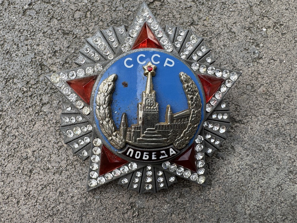 This is a Soviet Order of Victory medal. It features a five-pointed red star with a central medallion depicting the Spasskaya Tower of the Moscow Kremlin, surrounded by laurel and oak branches, with the Cyrillic letters "СССР" (USSR) at the top and the word "ПОБЕДА" (Victory) at the bottom. The original medal is distinguished by its use of platinum, diamonds, and enamel, reflecting its status as one of the highest military decorations awarded by the Soviet Union. The Order of Victory was awarded exclusively to high-ranking Soviet and allied commanders for exceptional leadership during World War II. Instituted in 1943, it symbolized supreme military achievement and was one of the rarest and most prestigious Soviet orders. Recipients were recognized for their strategic victories that significantly contributed to the defeat of Nazi Germany. Genuine examples are "unobtanium" collectibles. This reproduction is quite impressive.