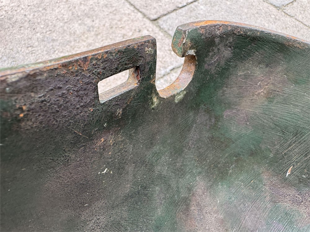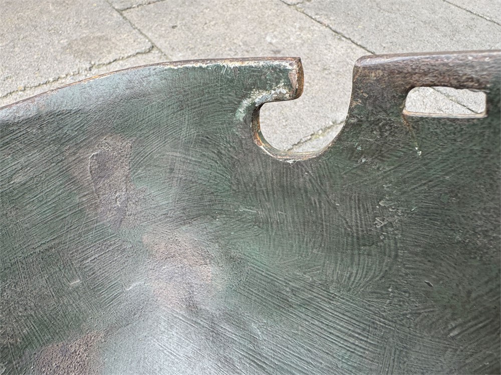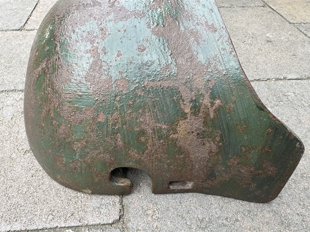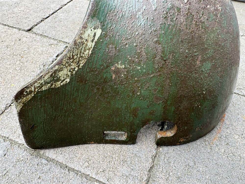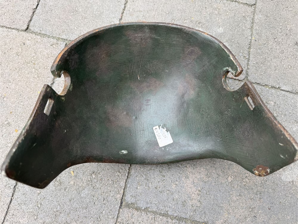 Rare plate affixed to the front of a WWI combat helmet. It hangs on the lugs of the helmet, and was designed to protect a soldier from a direct hit to the front of the head. So much for retreating! Piece shows minor age and worn paint. VERY heavy piece, seldom encountered. They usually retail for about $2000 to $2500.
