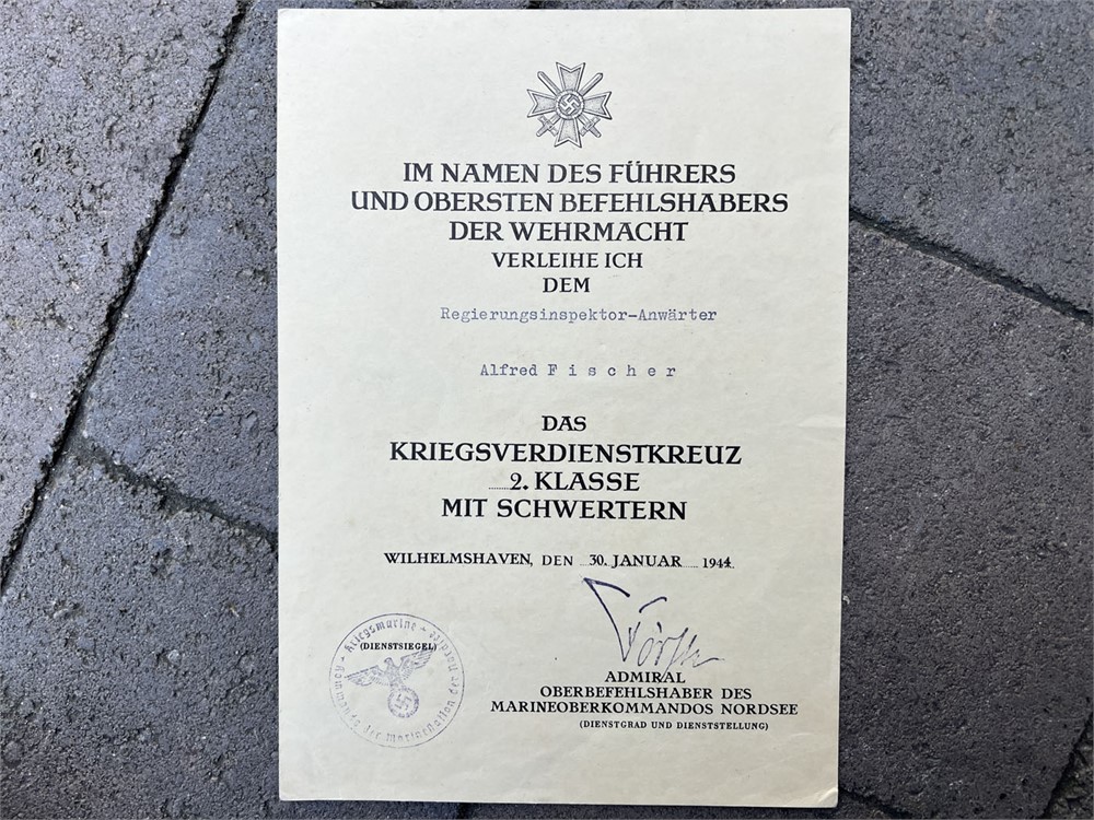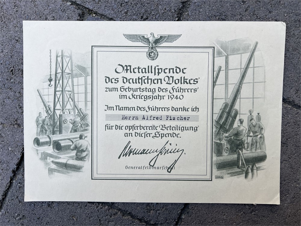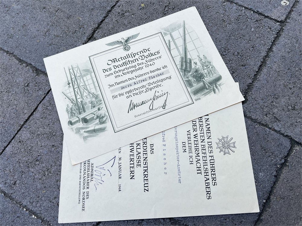 This grouping includes an unmarked Spanish Cross in Bronze awarded by Nazi Germany. The Spanish Cross was a military decoration granted by the Third Reich for service in the Spanish Civil War. The set contains the recipient's Soldbuch, a military service book with his photograph and extensive entries. Also included is the award document for the Spanish Cross, dated 6 June 1939, bearing an auto-pen signature of Adolf Hitler. The Spanish Cross is the standard bronze variant with swords, awarded for combatants. The documents also include a War Merit Cross award document. Also of interest is a 1940 document presented to Fischer for a contribution of metal for wartime production needs - part of organized drives where citizens donated metal (often household items) to support the war effort.