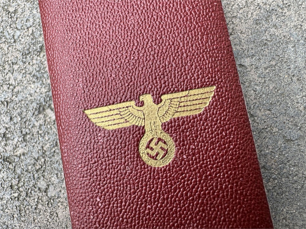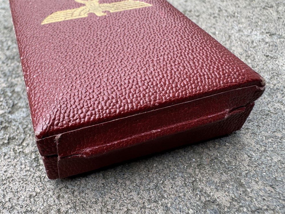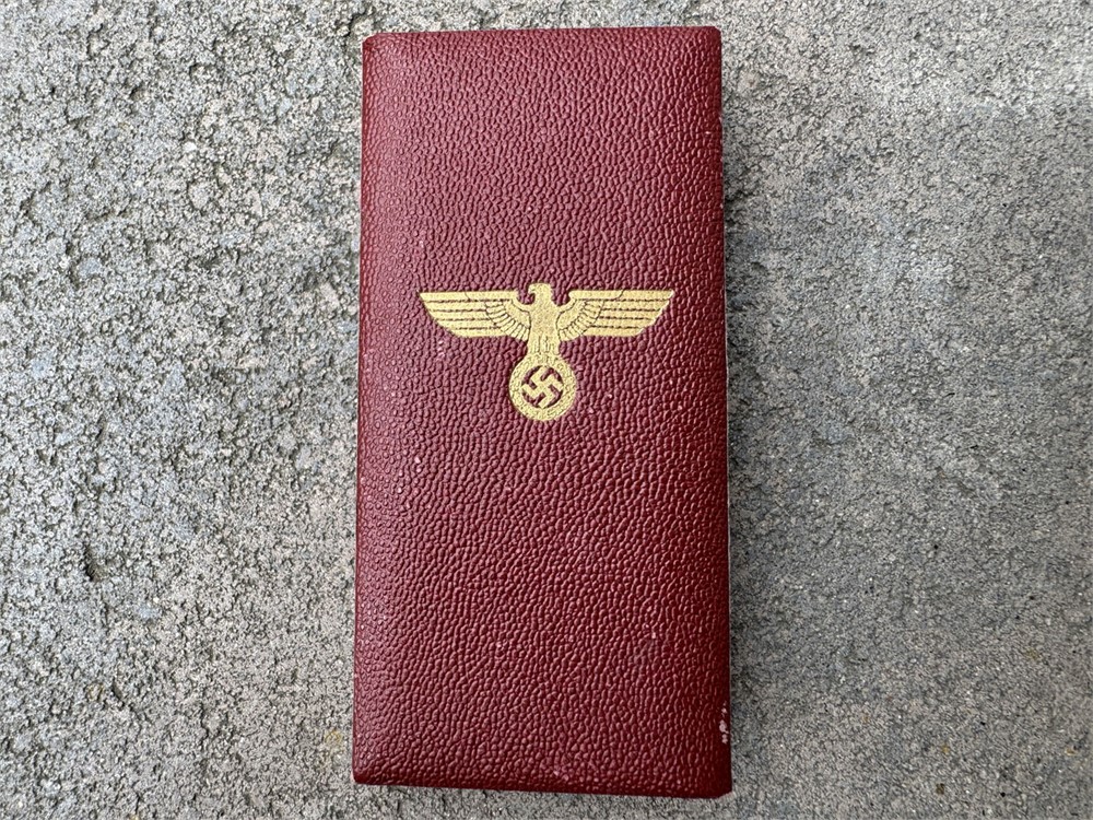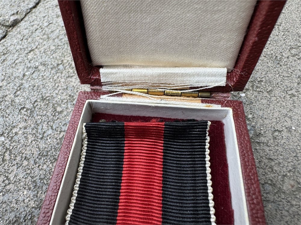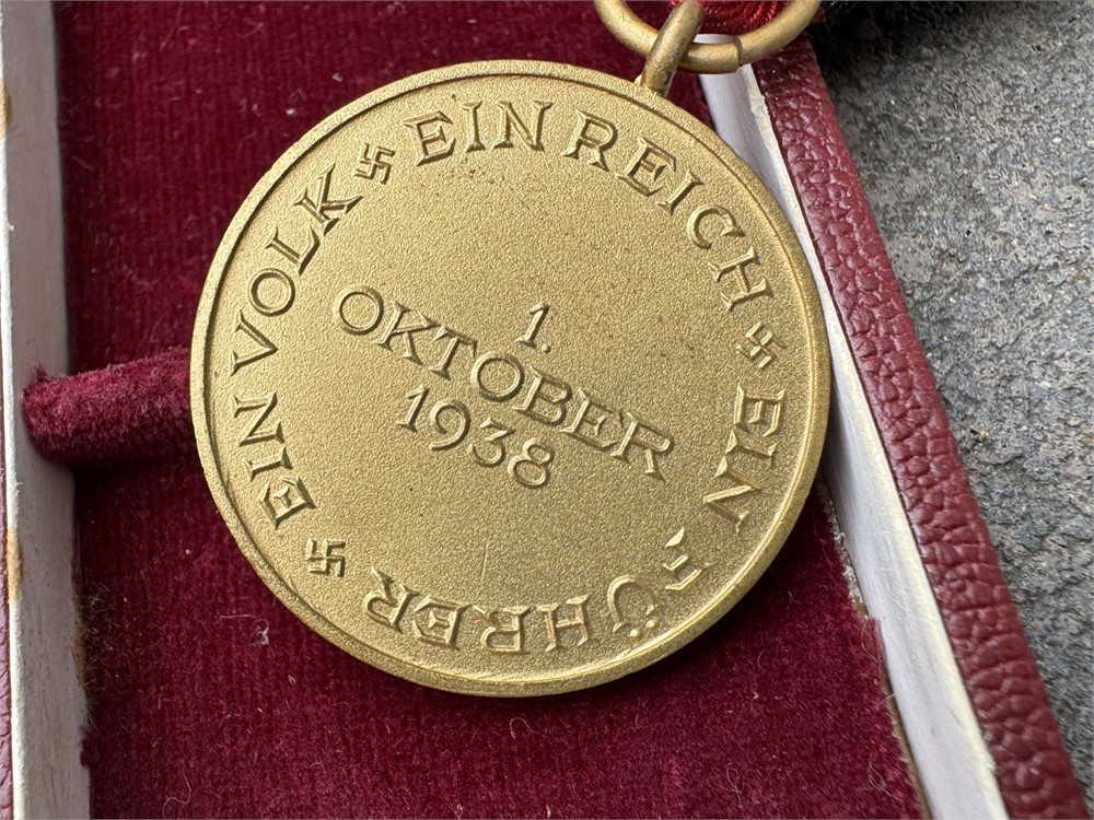 This is the Sudetenland Medal. The medal commemorates the annexation of the Sudetenland on October 1, 1938. It features the inscription "Ein Reich Ein Volk Ein Führer" and imagery of two figures with a Nazi eagle and swastika. Medal is mint, case is near flawless (only the hinge cover material is split).  Exterior is mint.