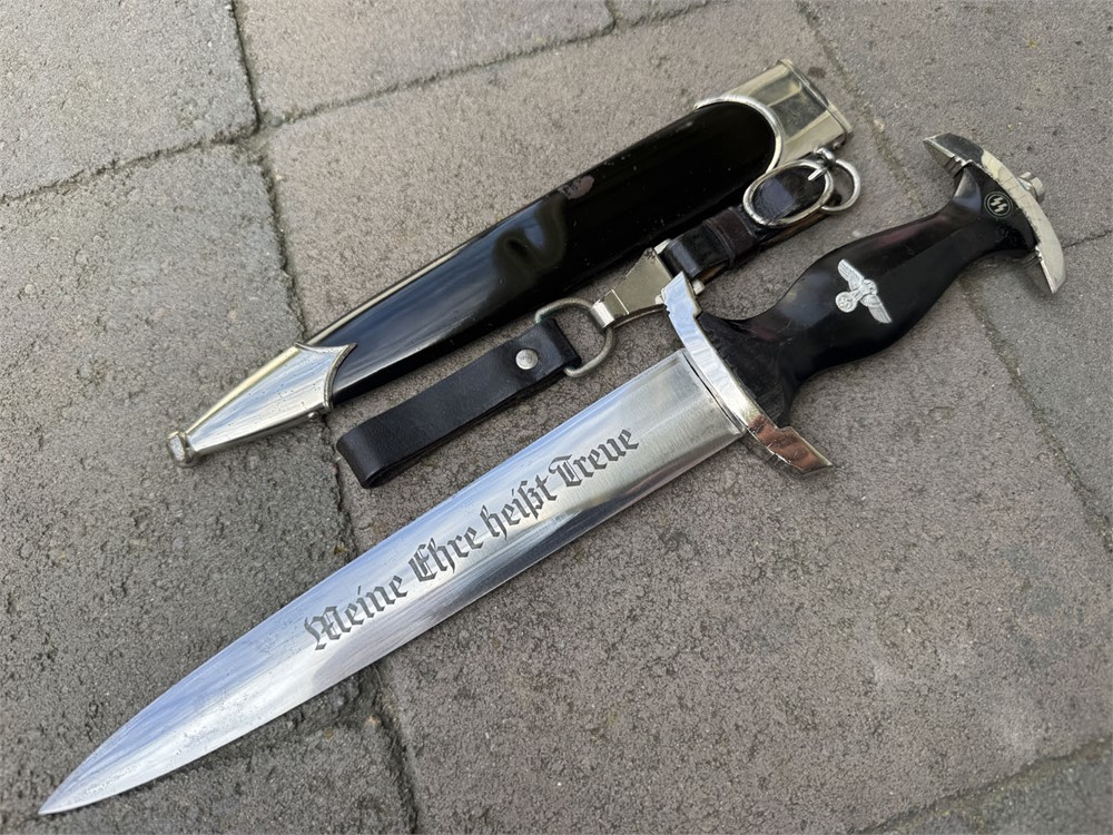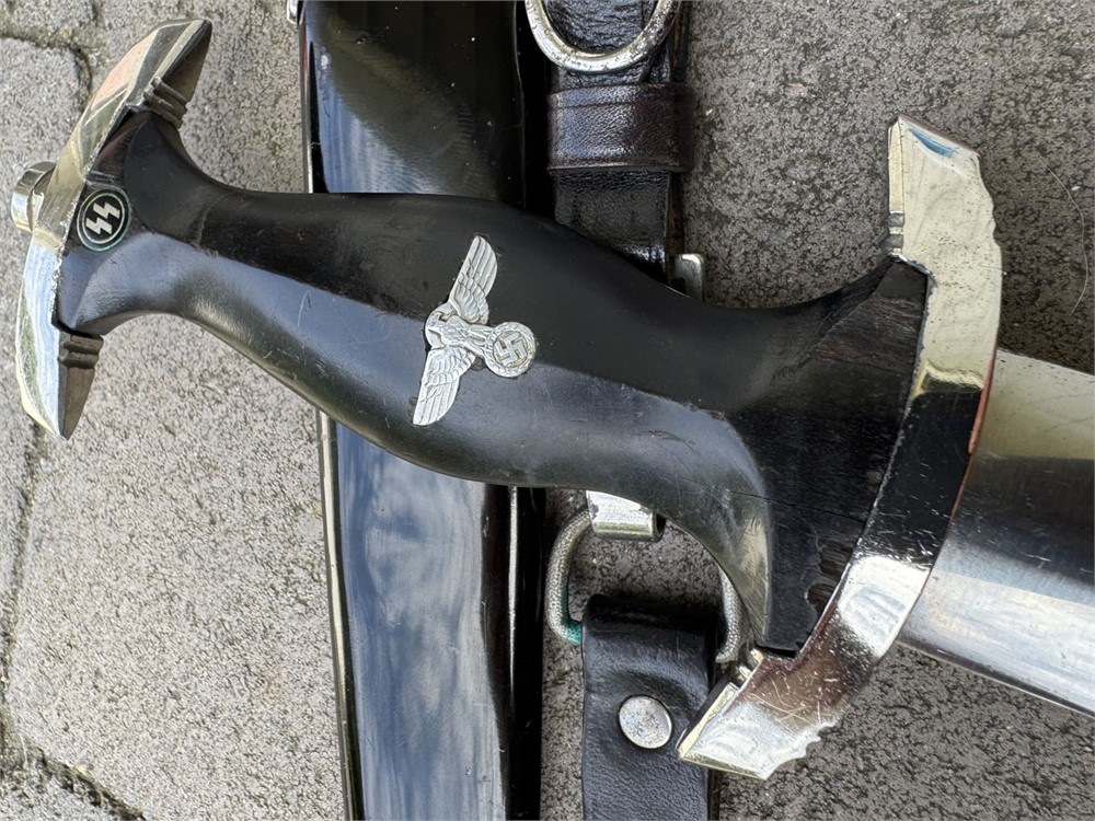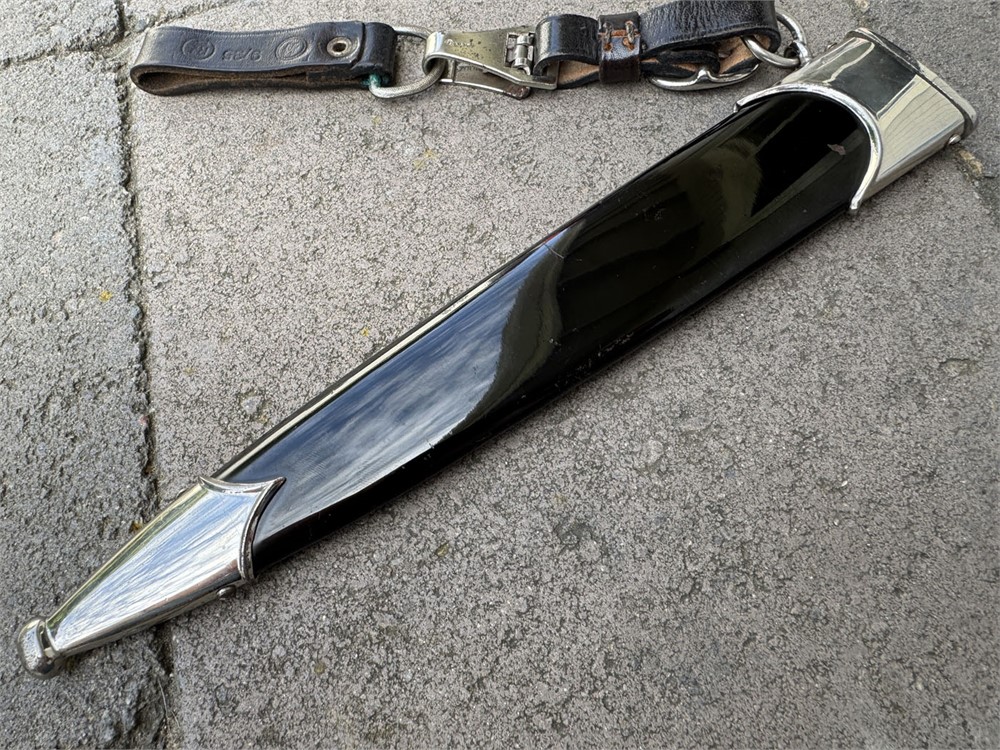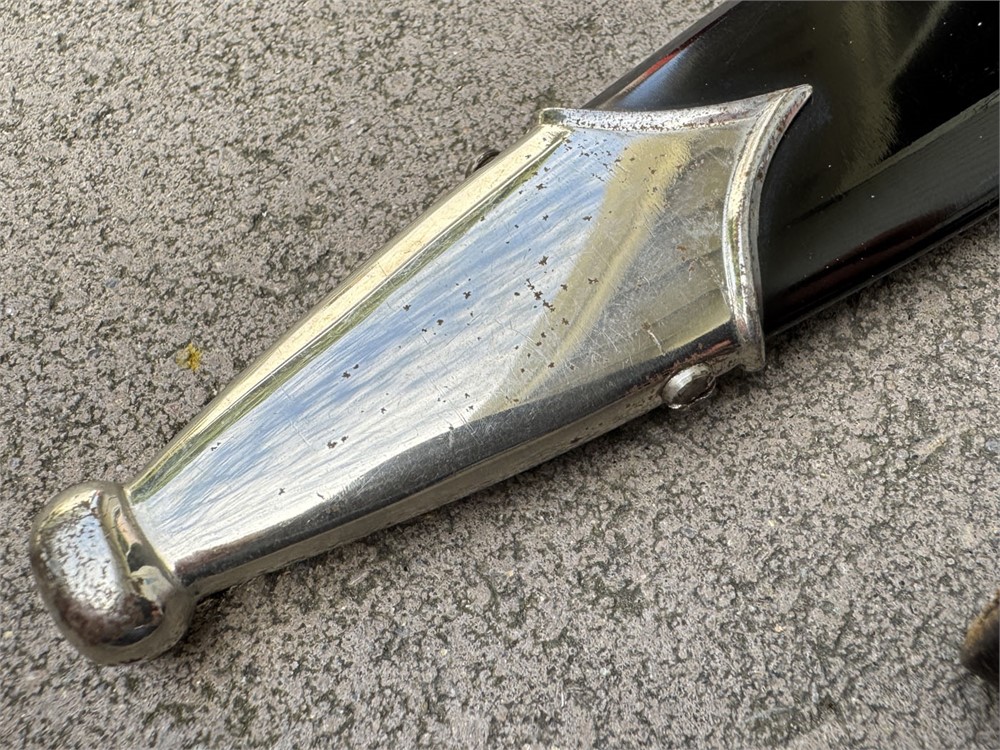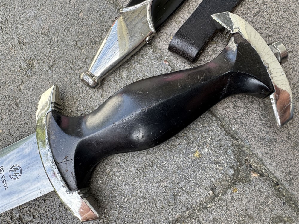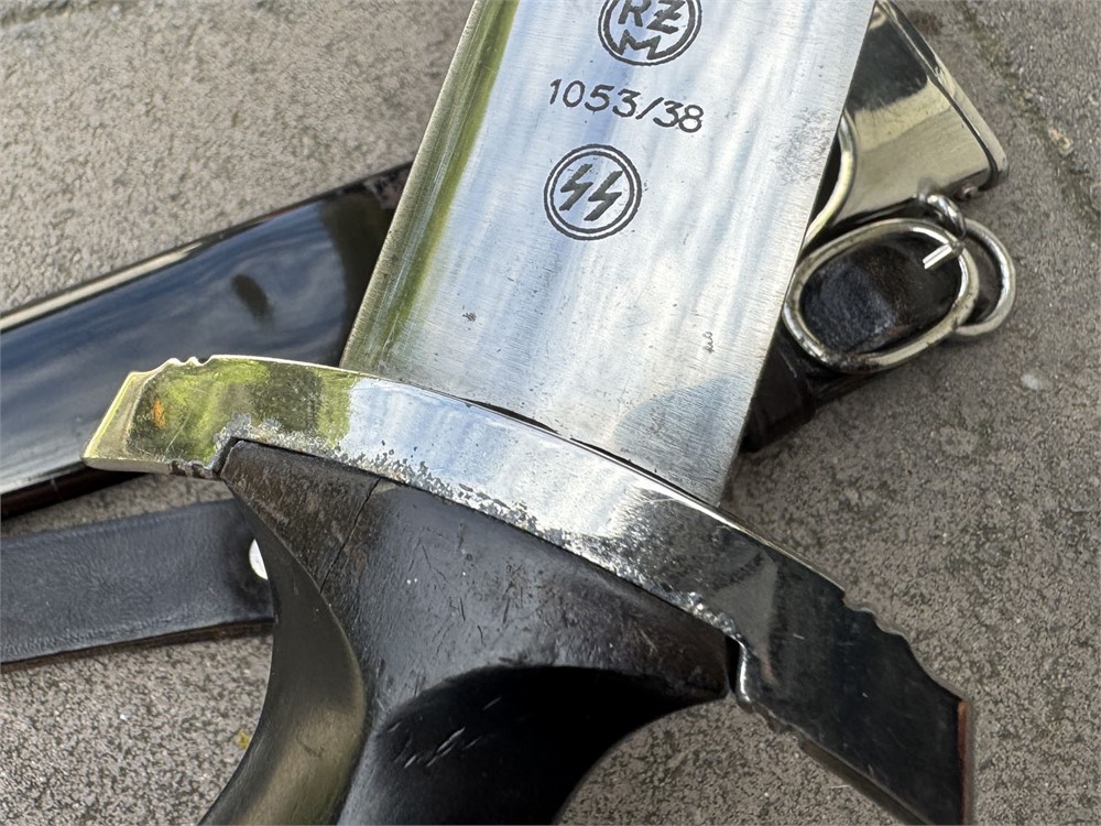 SS Dagger from the RZM production period. Exterior fittings are plated, and show minor age per the photos. Paint on scabbard is original and rates at 98%. ONE small half-dime sized abrasion on the front near the edge, and a very small (hard to see) dent on the front. Leather hanger and belt loop are in outstanding condition. Grip shows cracks and chips per the photos. Blade is near flawless - motto and RZM codes are deeply and beautifully etched. Factory cross-grain finish remains to the unpolished blade. MINOR corrosion near the tip (see the photos - very hard to photograph).