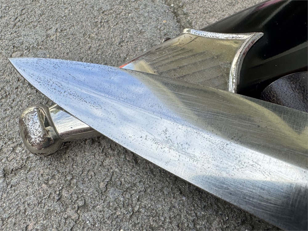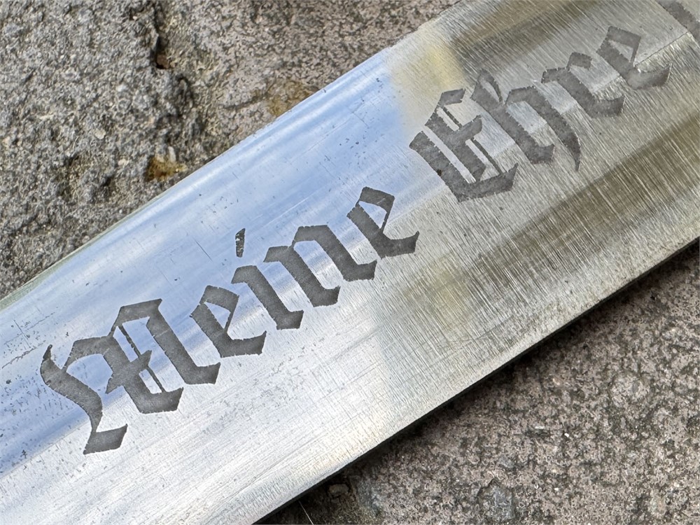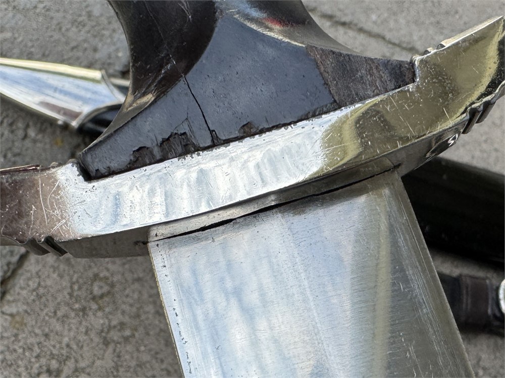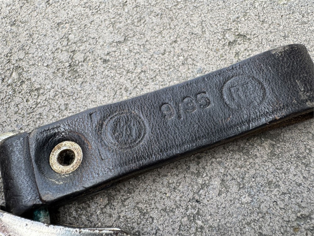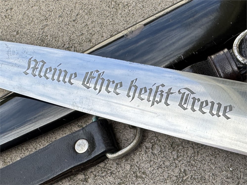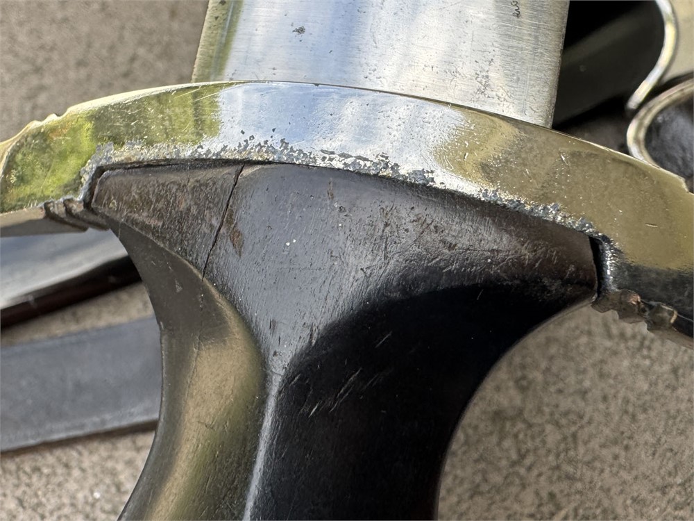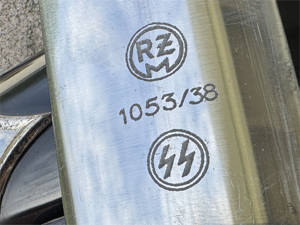 SS Dagger from the RZM production period. Exterior fittings are plated, and show minor age per the photos. Paint on scabbard is original and rates at 98%. ONE small half-dime sized abrasion on the front near the edge, and a very small (hard to see) dent on the front. Leather hanger and belt loop are in outstanding condition. Grip shows cracks and chips per the photos. Blade is near flawless - motto and RZM codes are deeply and beautifully etched. Factory cross-grain finish remains to the unpolished blade. MINOR corrosion near the tip (see the photos - very hard to photograph).