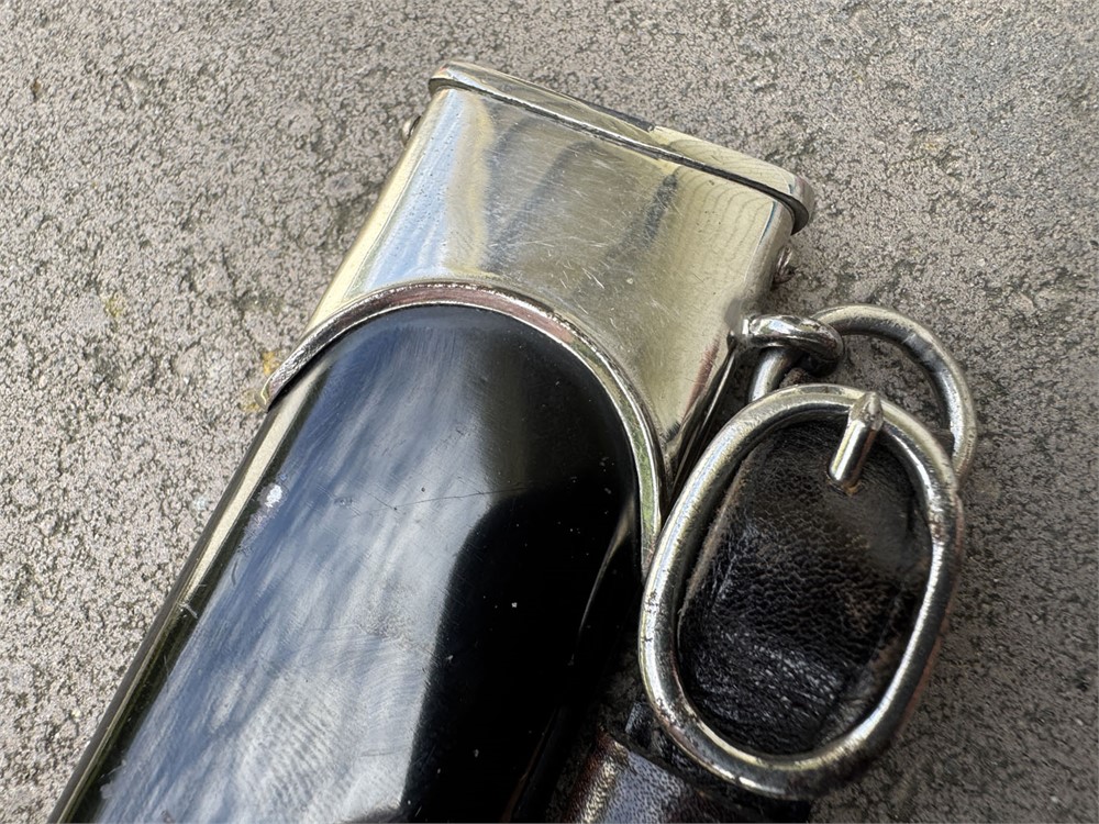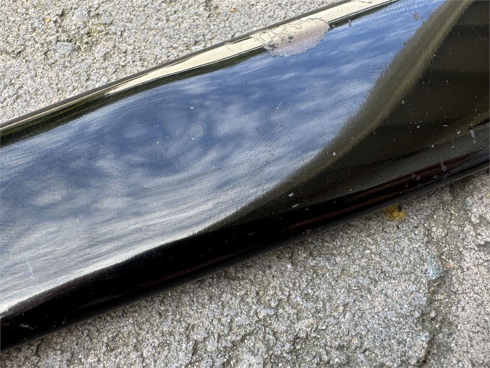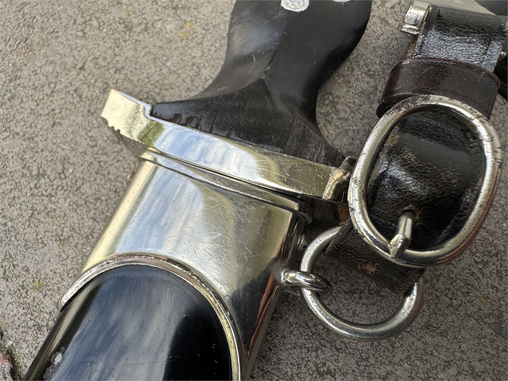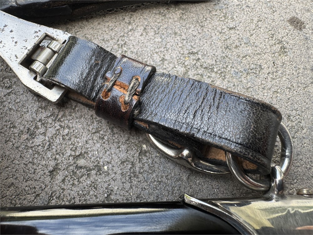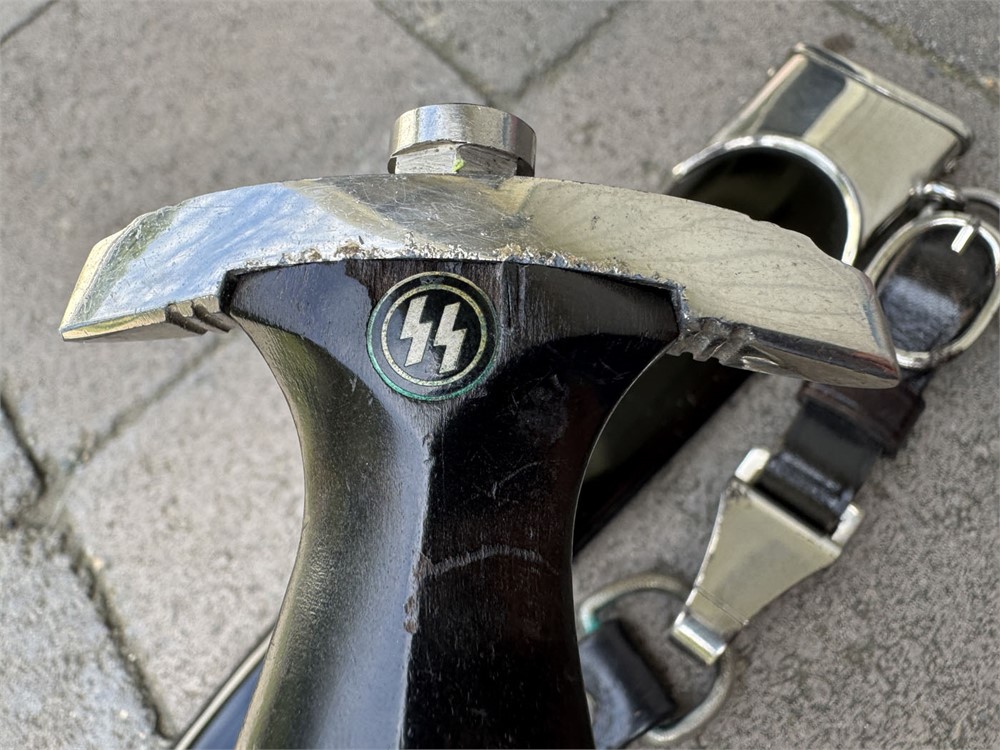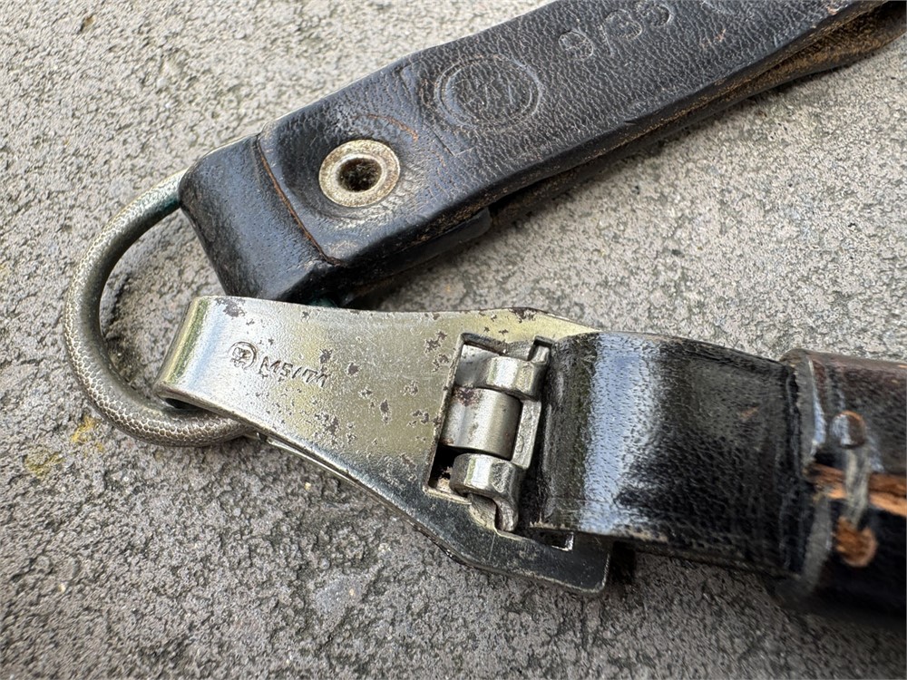 SS Dagger from the RZM production period. Exterior fittings are plated, and show minor age per the photos. Paint on scabbard is original and rates at 98%. ONE small half-dime sized abrasion on the front near the edge, and a very small (hard to see) dent on the front. Leather hanger and belt loop are in outstanding condition. Grip shows cracks and chips per the photos. Blade is near flawless - motto and RZM codes are deeply and beautifully etched. Factory cross-grain finish remains to the unpolished blade. MINOR corrosion near the tip (see the photos - very hard to photograph).