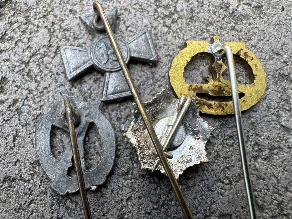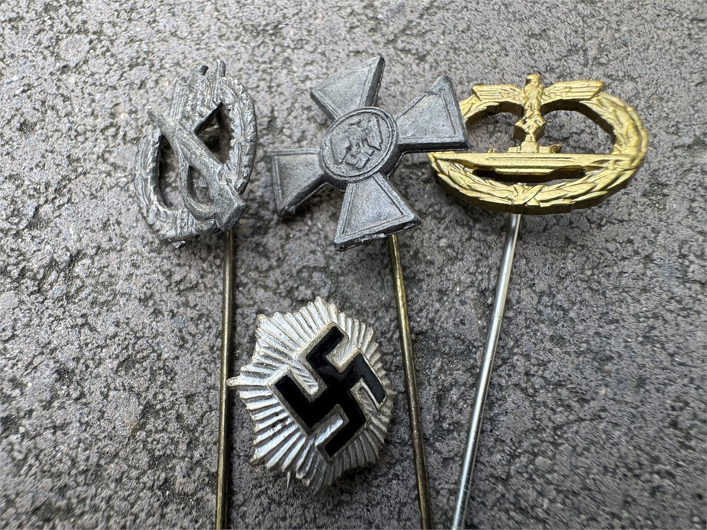 Collection of miniatures and stickpins, to include a multi-ribbon lapel pin crowned with a faithful service medal, a pour-le-merite (not sure which vintage but definitely pre 1945), a miniature Luftwaffe Pilot Badge for the lapel, 3 stickpins for Uboat, War Merit Cross, and Infantry Assault Badge. Plus a membership pin for the RLB.