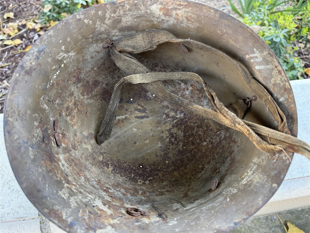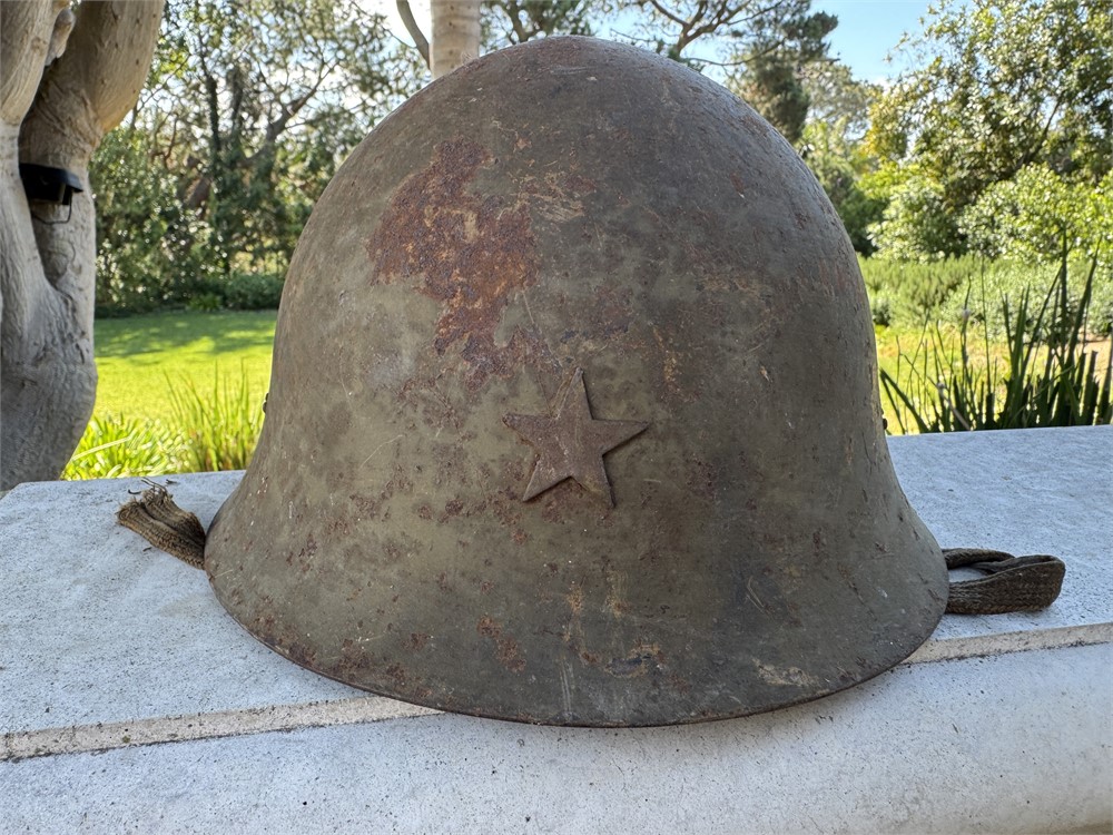 Very interesting Japanese WW2 Infantry Helmet. Shows wear, and is missing the liner (but funny enough, the chin-strap is retained). What makes this helmet cool is the personalization on the BACK of the helmet.