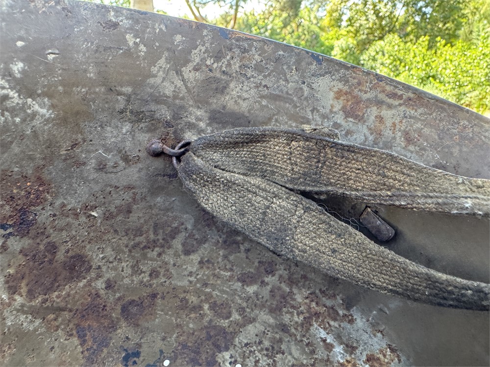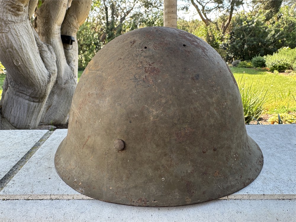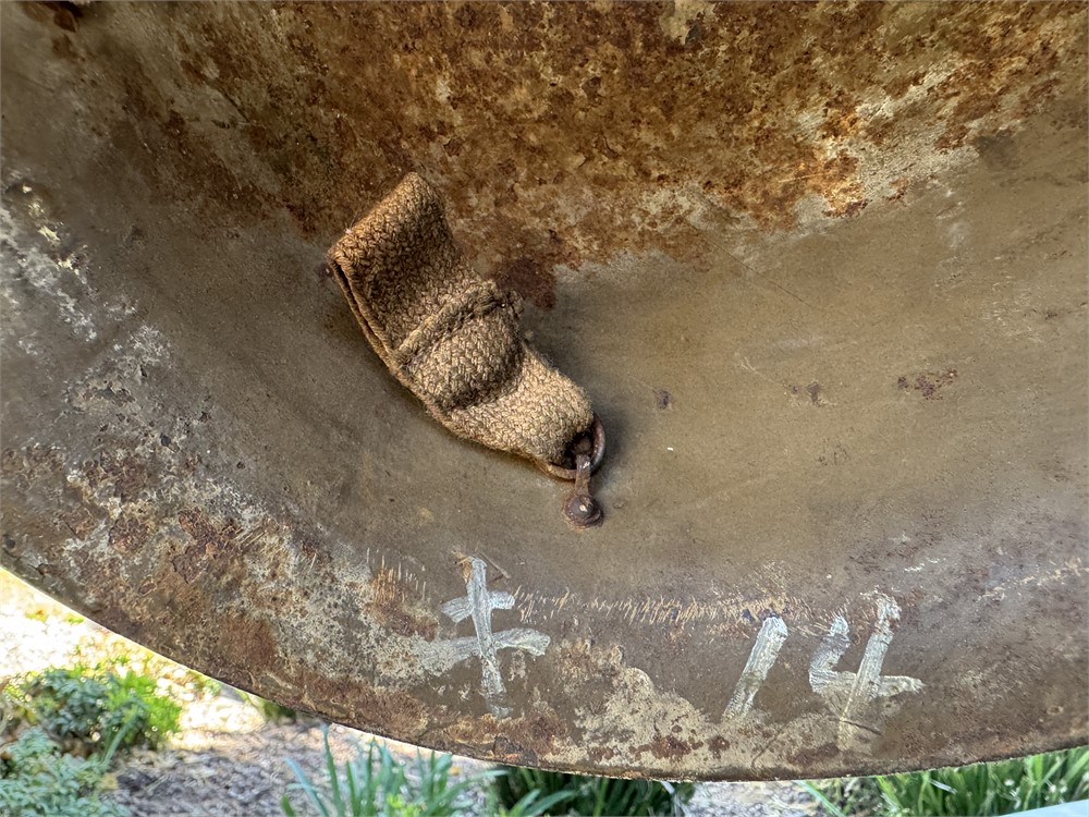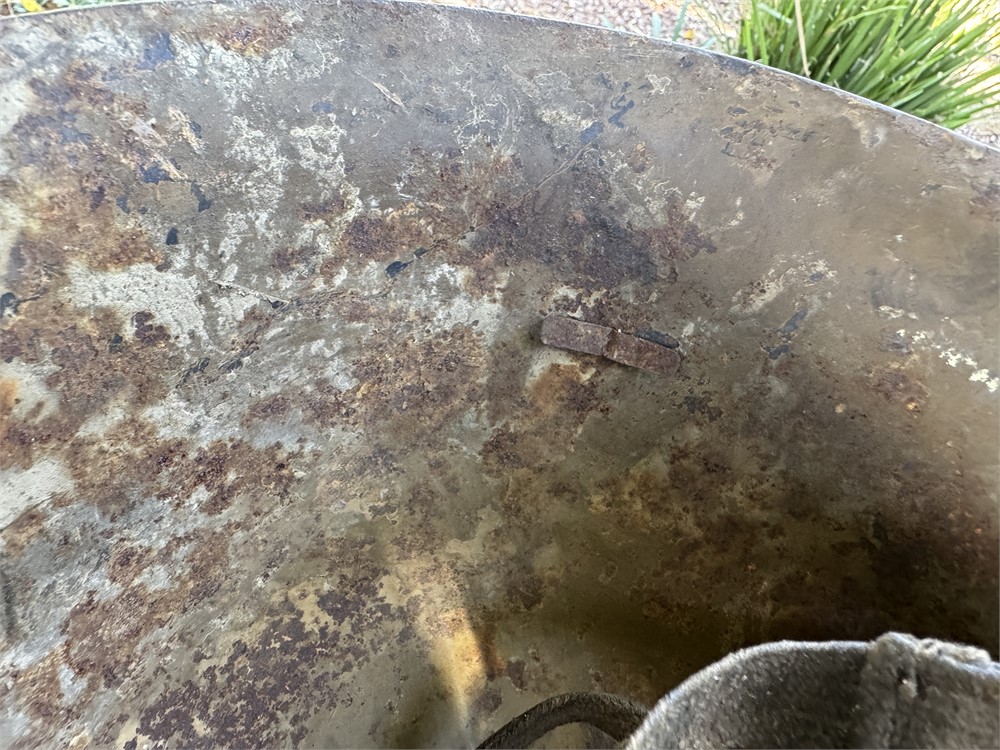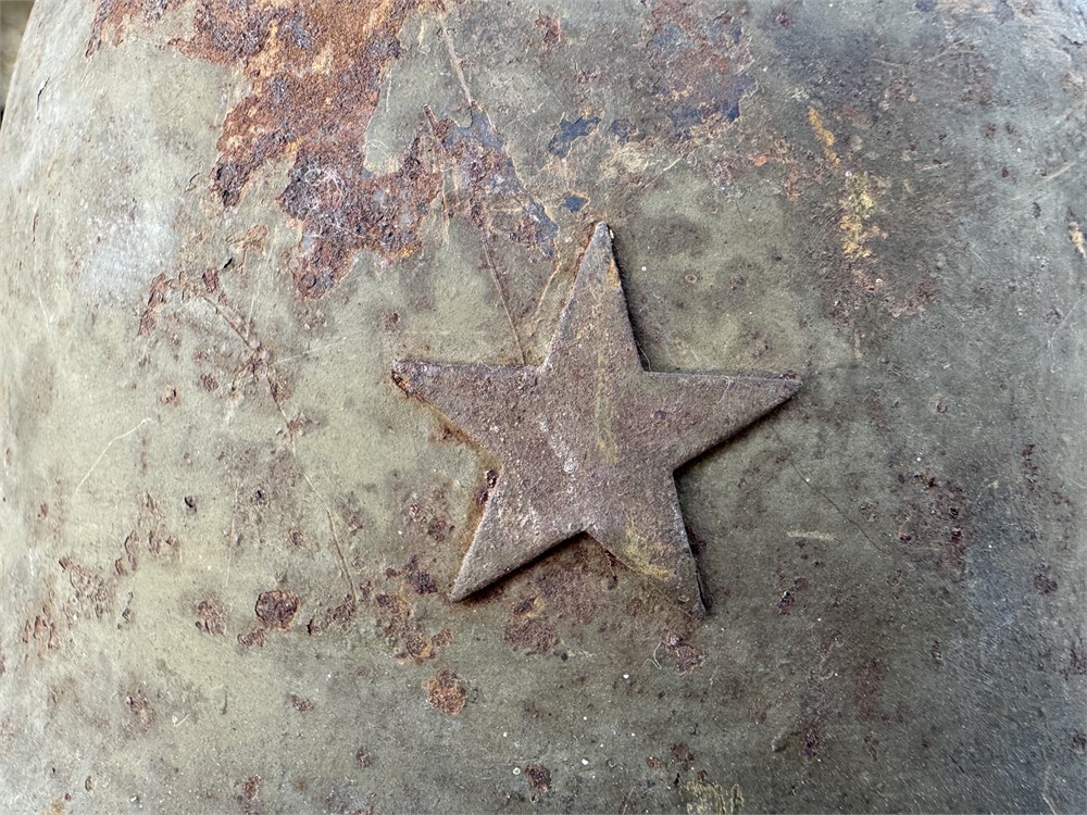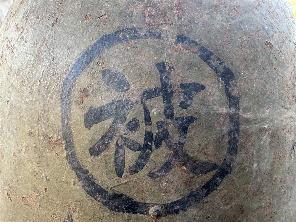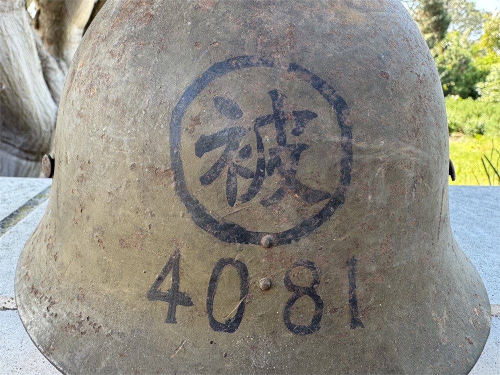 The marking on the rear of the helmet reads 松本 (Matsumoto), a common Japanese surname meaning “pine tree origin.” The characters are hand-painted in a simple brush style and enclosed within a roughly drawn circle. During World War II, Japanese soldiers frequently marked their issued equipment with their names for identification purposes. These markings were typically applied in the field or during training. Below the name is what is mostly likely the soldier's ID number.