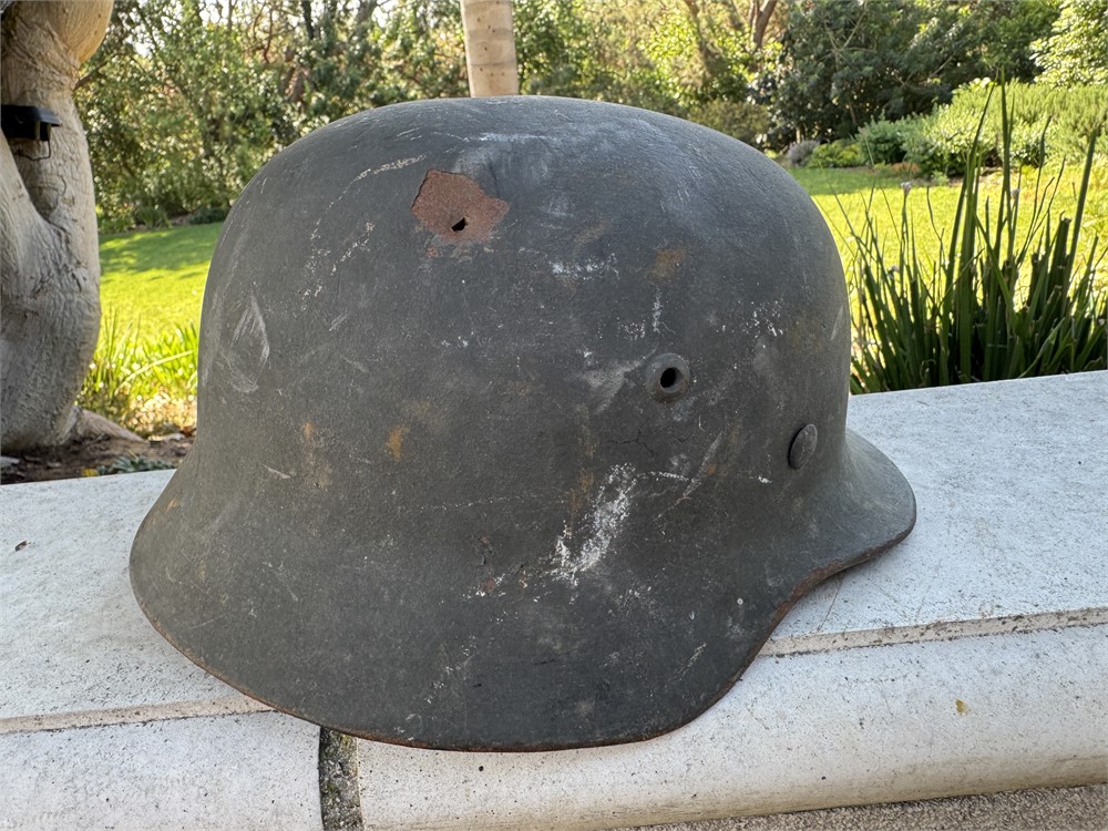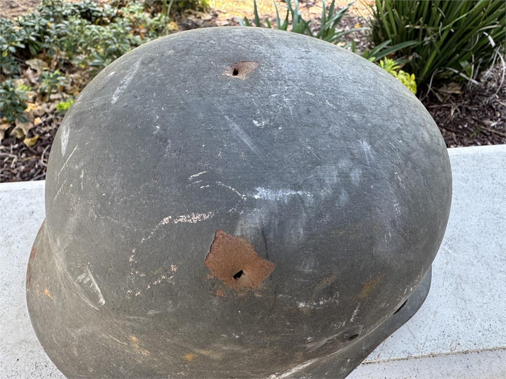 Pair of Army Combat helmets, well used, one with some small piercings on the crown. These are the M40 models, featuring the integrated side vent hole, and rolled edge. Condition is best illustrated by the photos. One of the helmets has several small piercings on the top. NO idea why. it's almost as if someone stabbed the one with a small ice-pick.