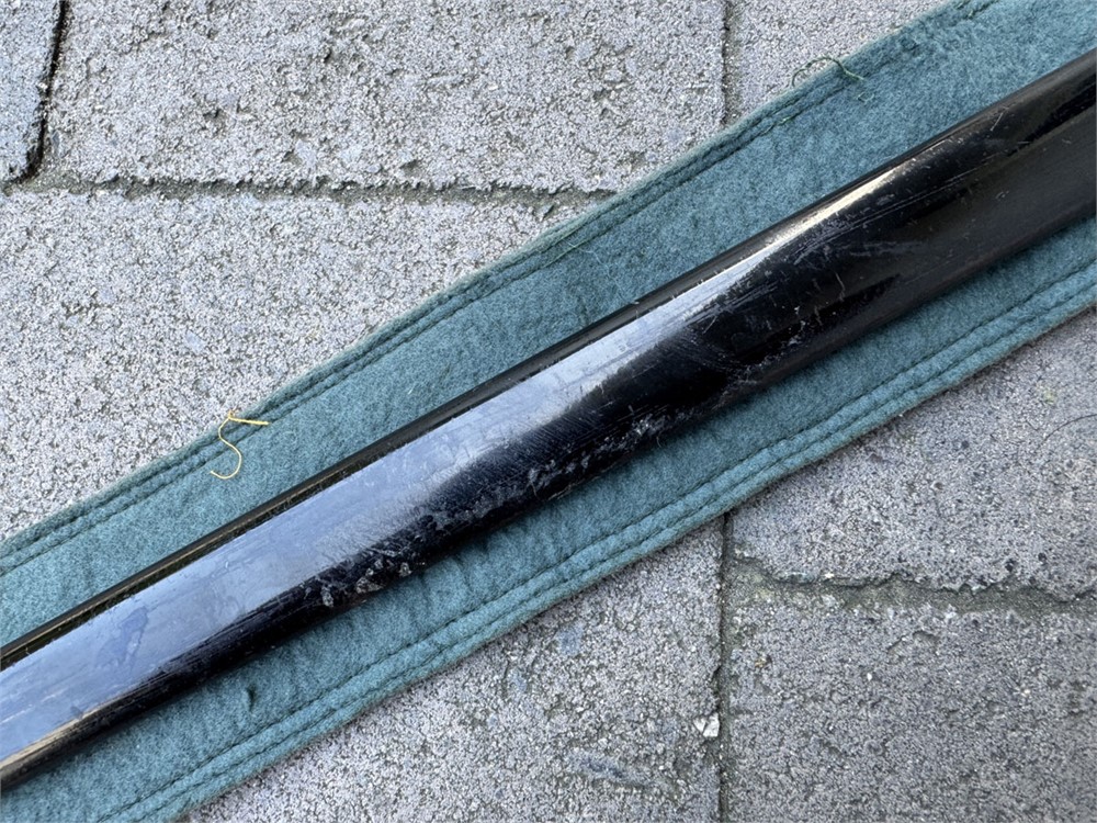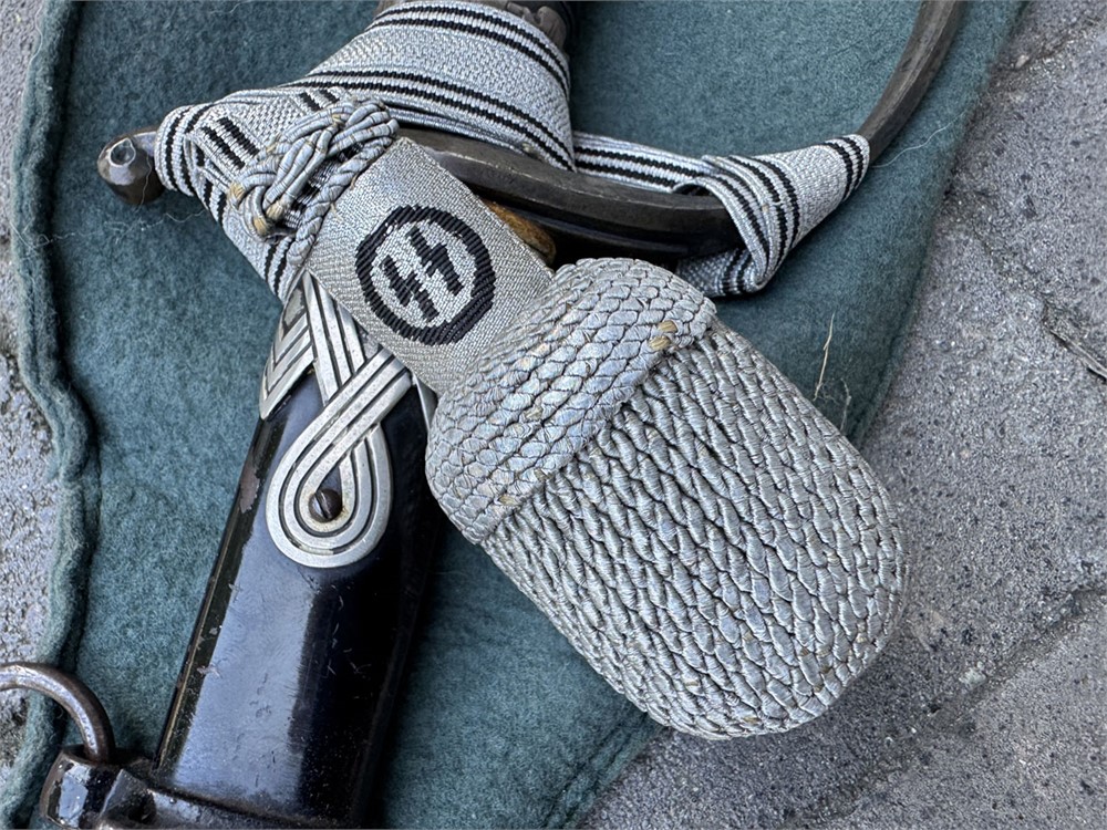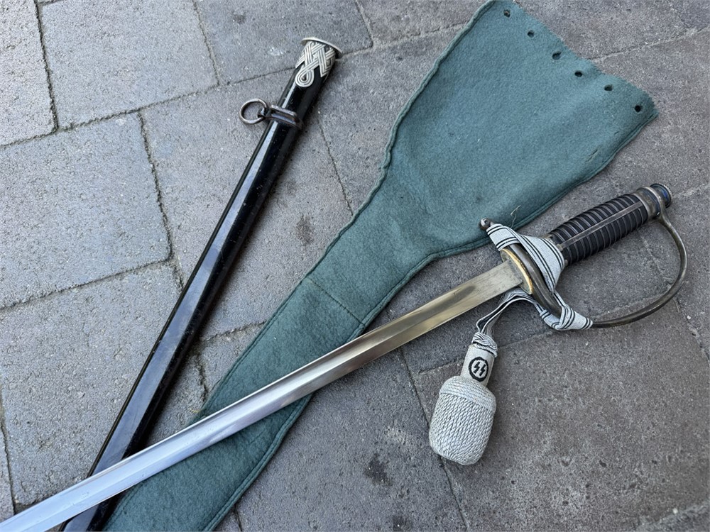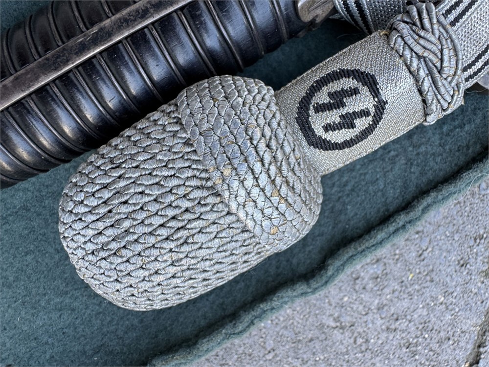 This beautiful example was originally purchased from blade collector and dealer JR Meda, who is known for exquisite taste in the highest quality and condition. I really can't say enough about this piece. Beautiful external fittings, 98% paint on a nearly perfect scabbard. Rich ebony grip with a perfectly inset SS Grip rune. Pommel is the step-down variety, with the interior cap-cover intact. Blade is the matte-polished finish typical of this sword. Scabbard throat is marked with the design cartouche. Knot is original to the piece. Unmarked blade. Buffer pad may be a replacement, as it's normally pure white, but in this case, has a black color to the "blade side." Housed in an original grey/green felt/wool storage bag. Closure string missing, and the bag has a couple of separations to the side seam.