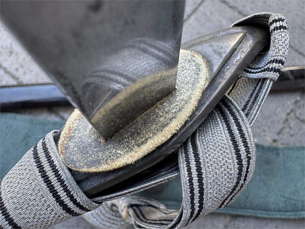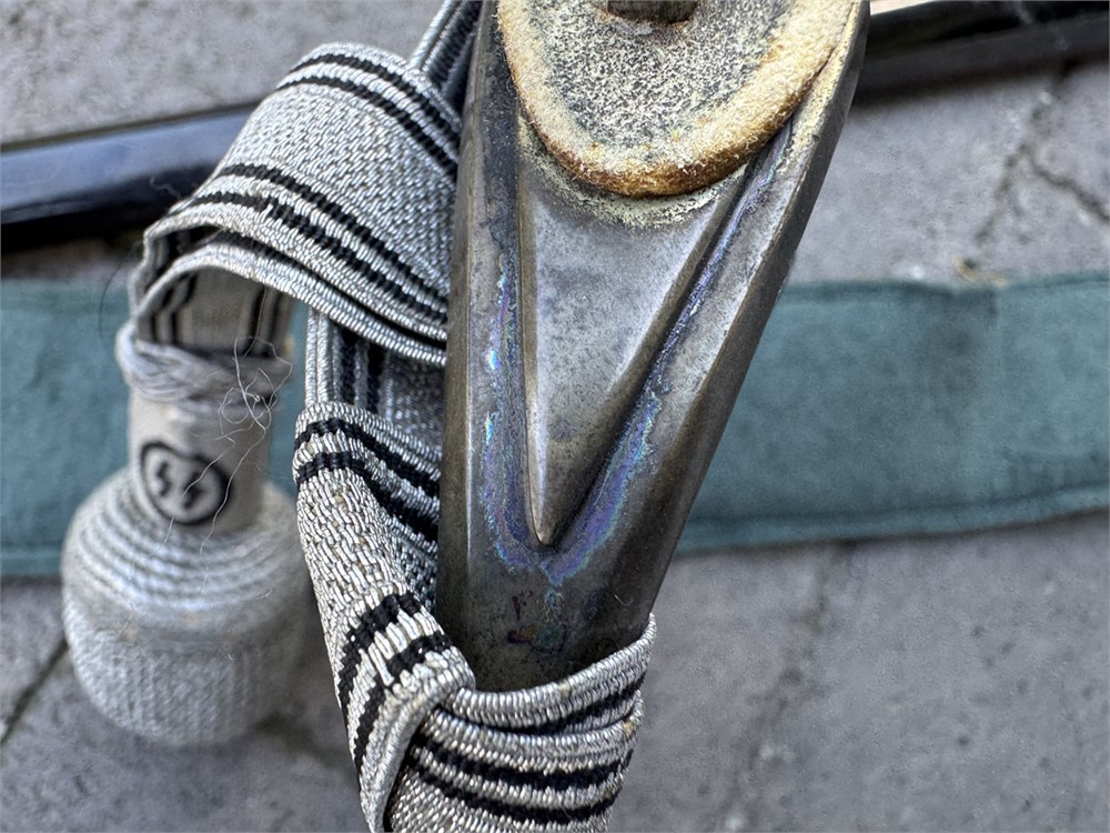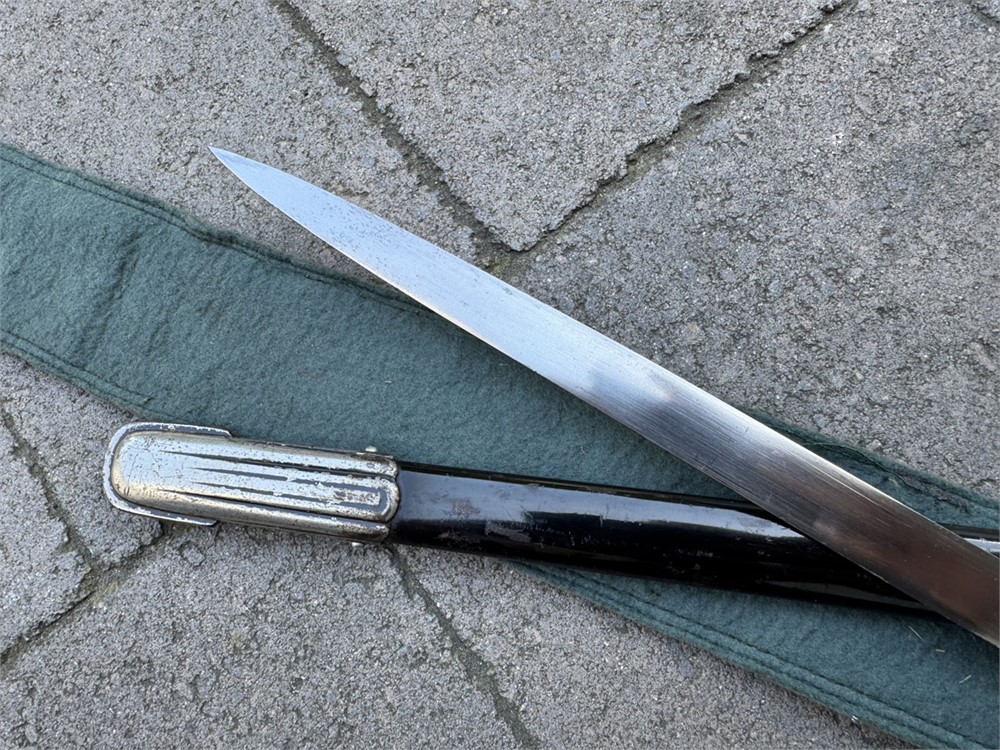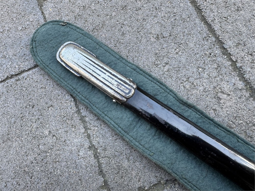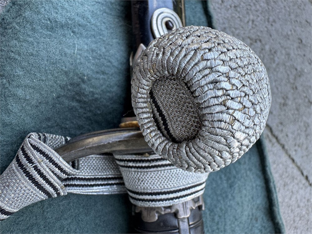 This beautiful example was originally purchased from blade collector and dealer JR Meda, who is known for exquisite taste in the highest quality and condition. I really can't say enough about this piece. Beautiful external fittings, 98% paint on a nearly perfect scabbard. Rich ebony grip with a perfectly inset SS Grip rune. Pommel is the step-down variety, with the interior cap-cover intact. Blade is the matte-polished finish typical of this sword. Scabbard throat is marked with the design cartouche. Knot is original to the piece. Unmarked blade. Buffer pad may be a replacement, as it's normally pure white, but in this case, has a black color to the "blade side." Housed in an original grey/green felt/wool storage bag. Closure string missing, and the bag has a couple of separations to the side seam.