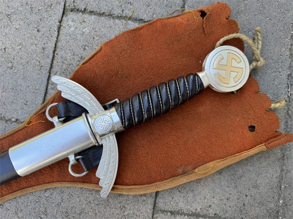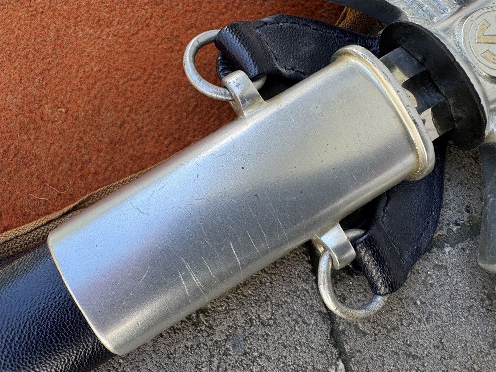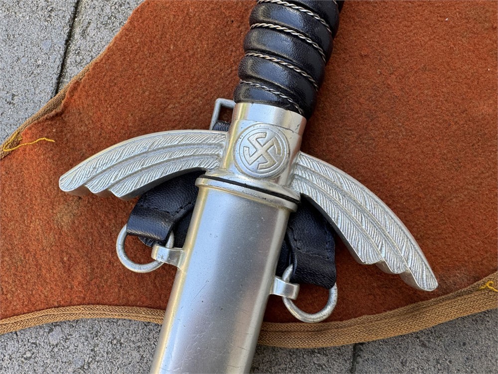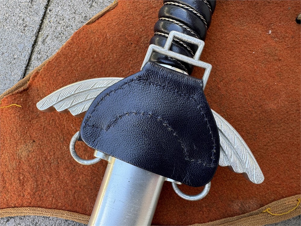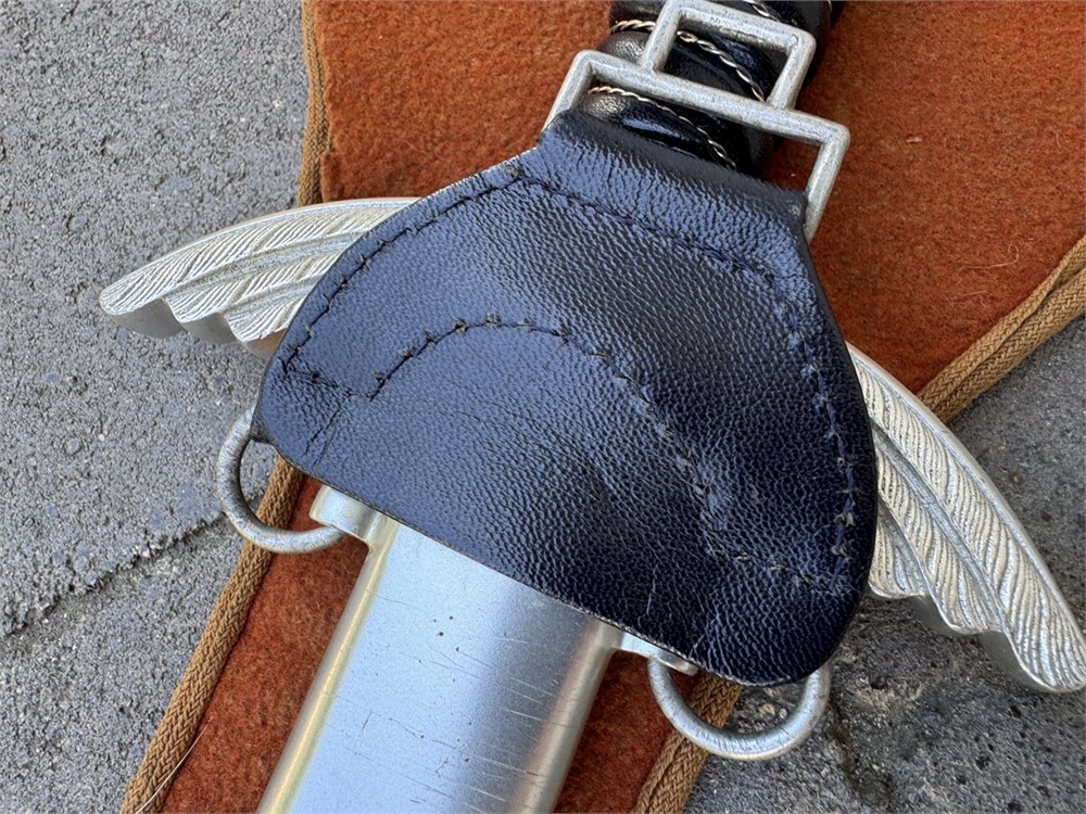 This is one of the better examples you will encounter. But for a couple of scratches to the exterior, this piece would easily grade 99% (I give almost nothing a 100% rating). This condition suggests the storage bag is original to this piece (being the orange color one normally finds with Luftwaffe General Degens). Leather grip and integral hanger are perfect and "like new." Same with scabbard. One tiny rub near the tip (easy to obscure with some blue leather polish). Plated blade is near flawless, except for a TINY bit of age near the tip (see photo - very hard to photograph). Bag shows separation near the handle area (see photos). Overall, an exquisite example that will compete with the finest quality and conditioned specimens in collecting.
